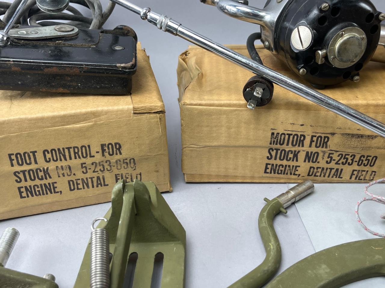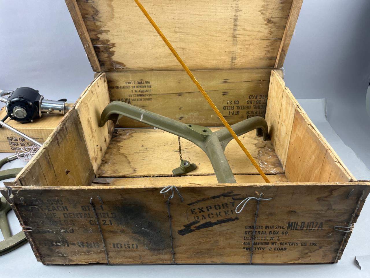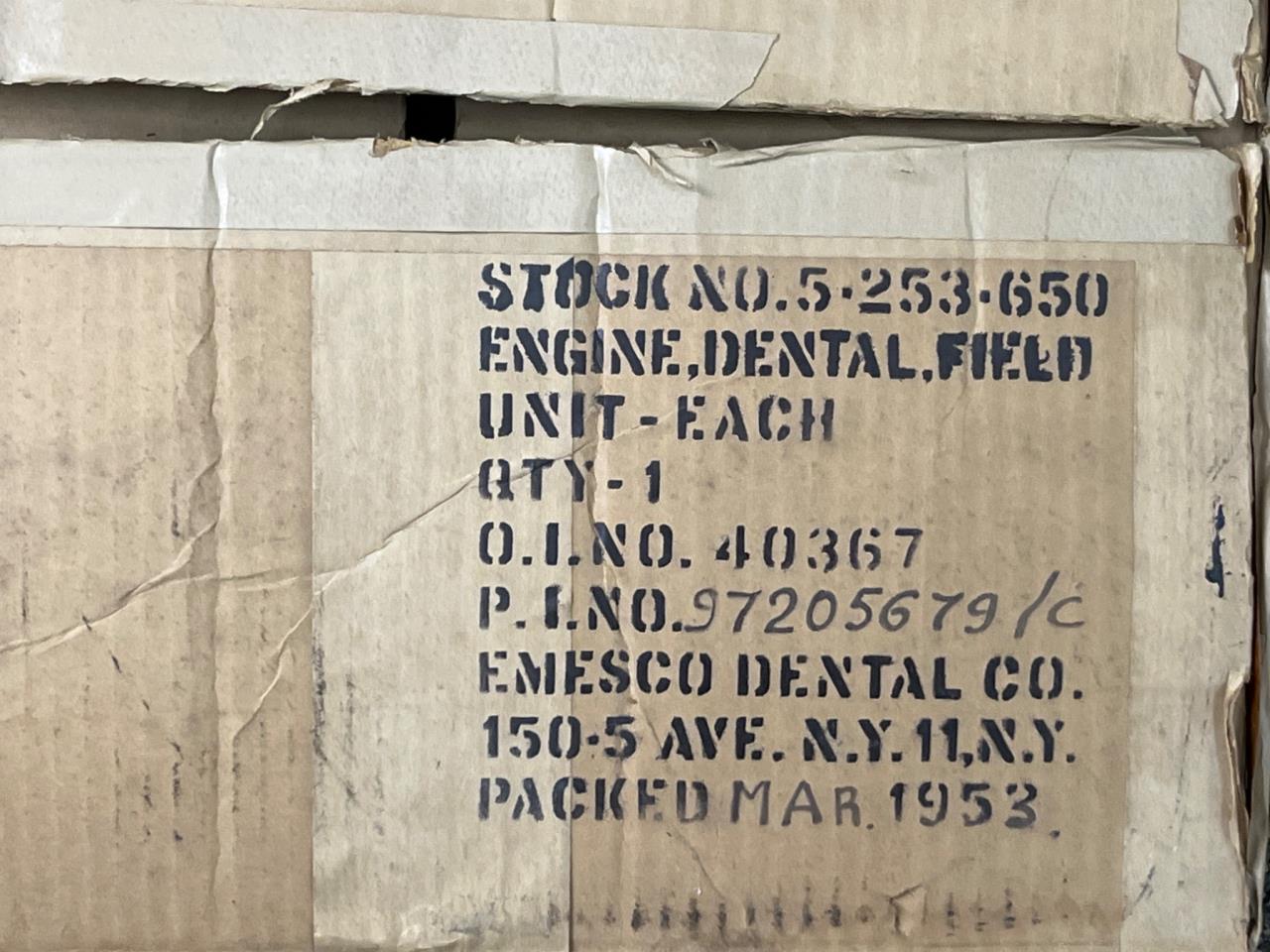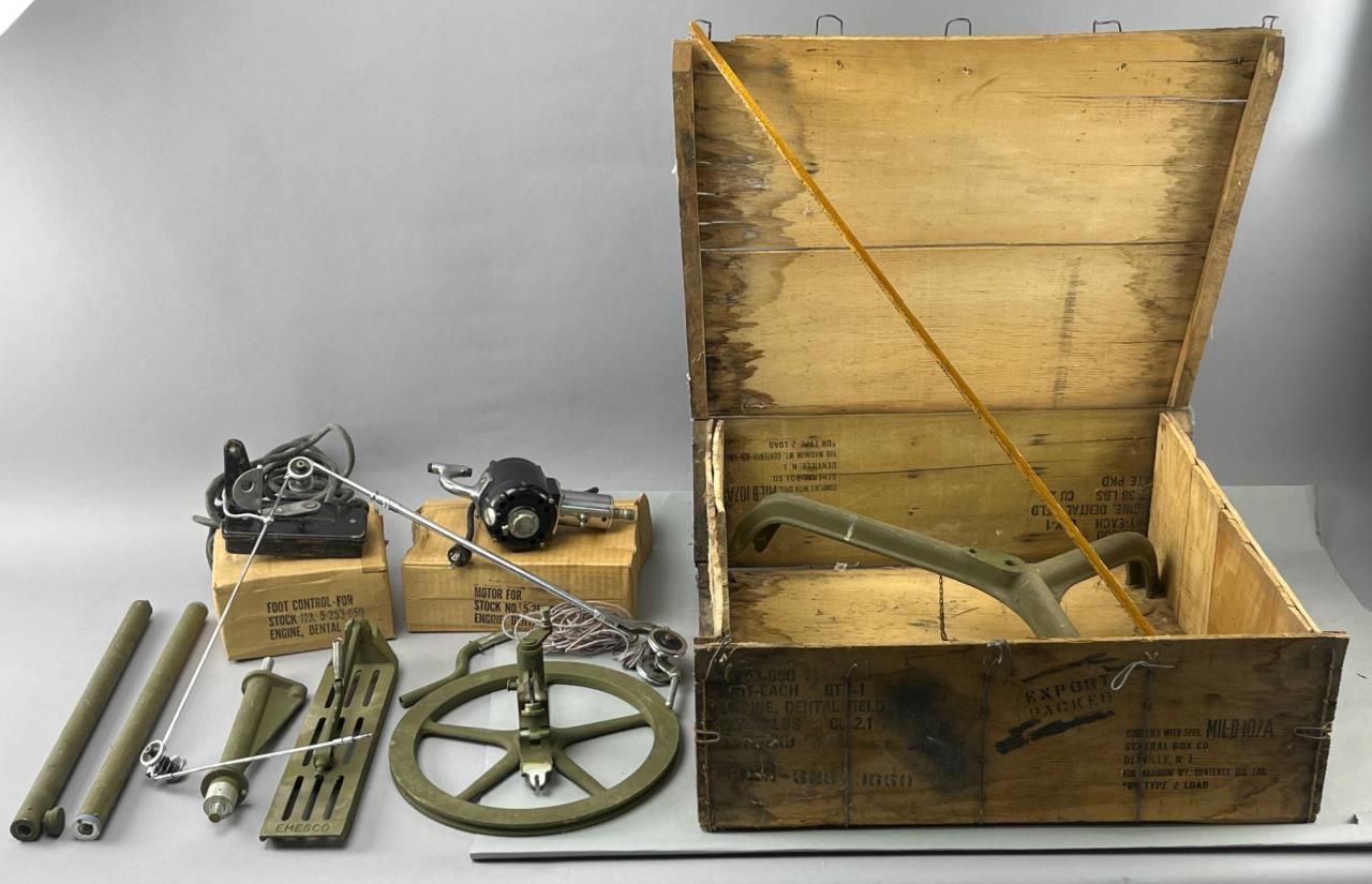 Emesco dental field engine set packed in 1953. Includes components such as a pulley system, handpiece, and metal rods, housed in a wooden crate with original markings.