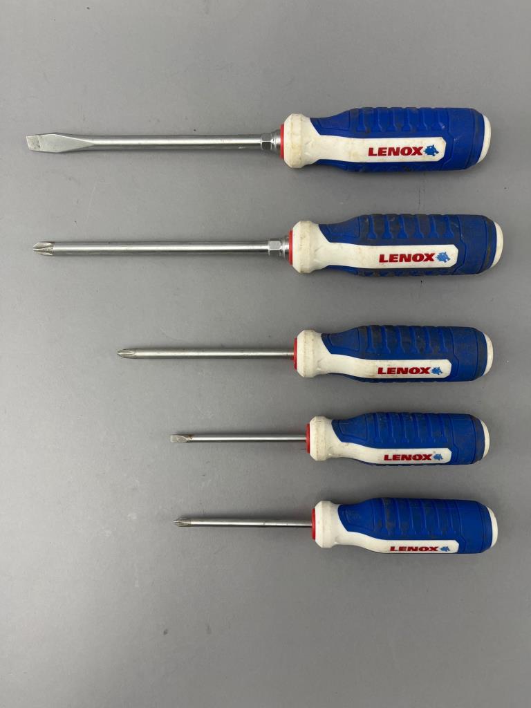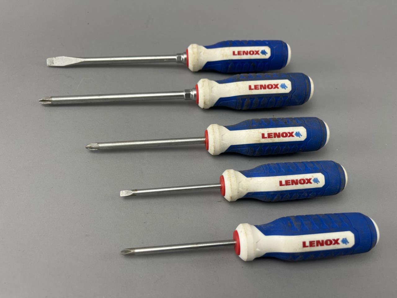 Lenox screwdrivers featuring blue and white ergonomic handles. Includes flathead and Phillips head screwdrivers. Handles display embossed Lenox branding.