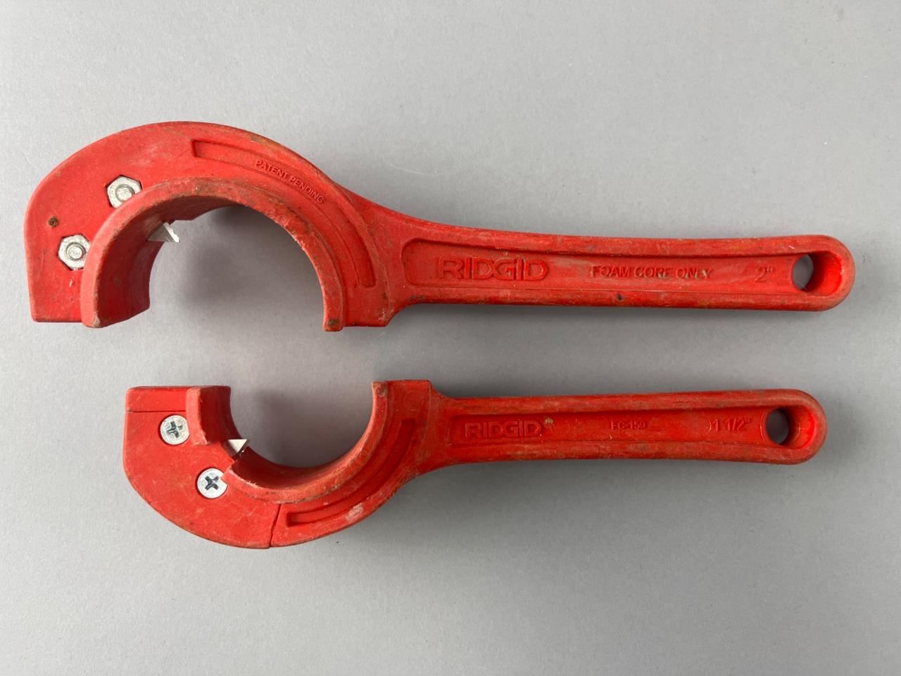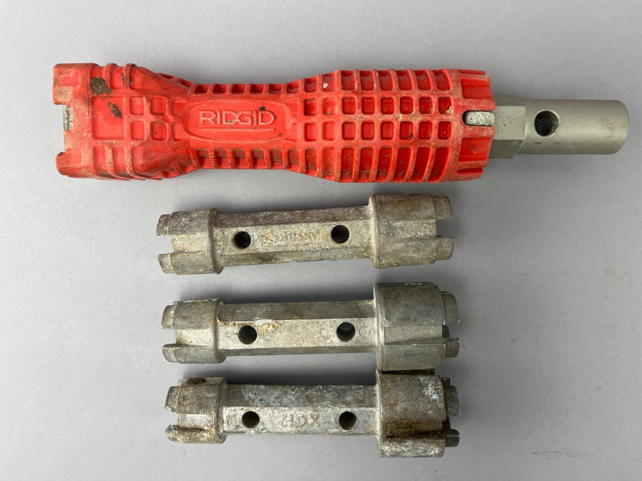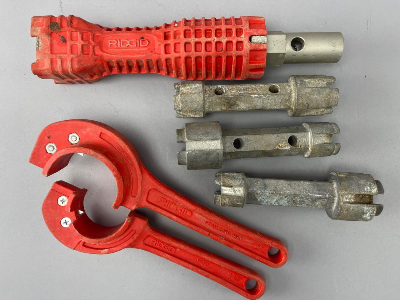 RIDGID plumbing tools including two red plastic pipe cutters and a multi-use handle with three metal fittings. Items are suitable for professional use. Normal wear consistent with prior use.