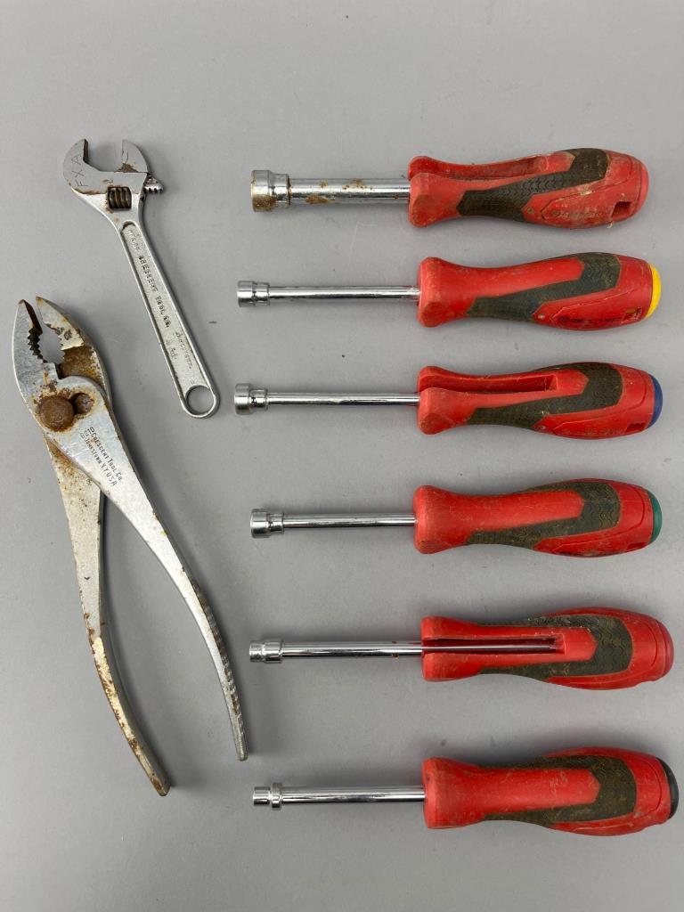 Crescent nut driver set including six drivers with red and black handles. Includes an adjustable wrench and pliers. Visible wear on all tools from use.