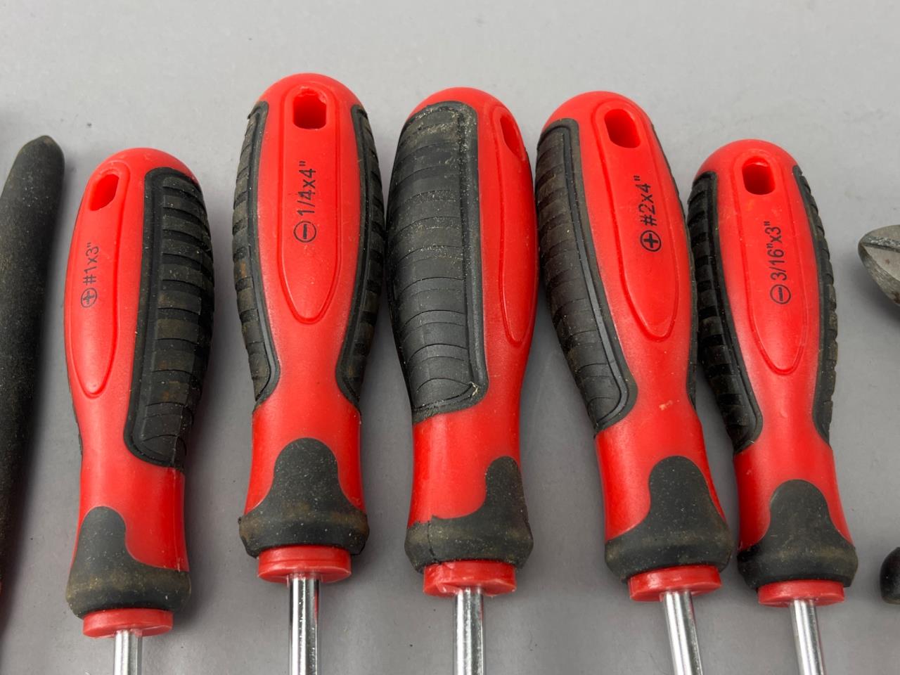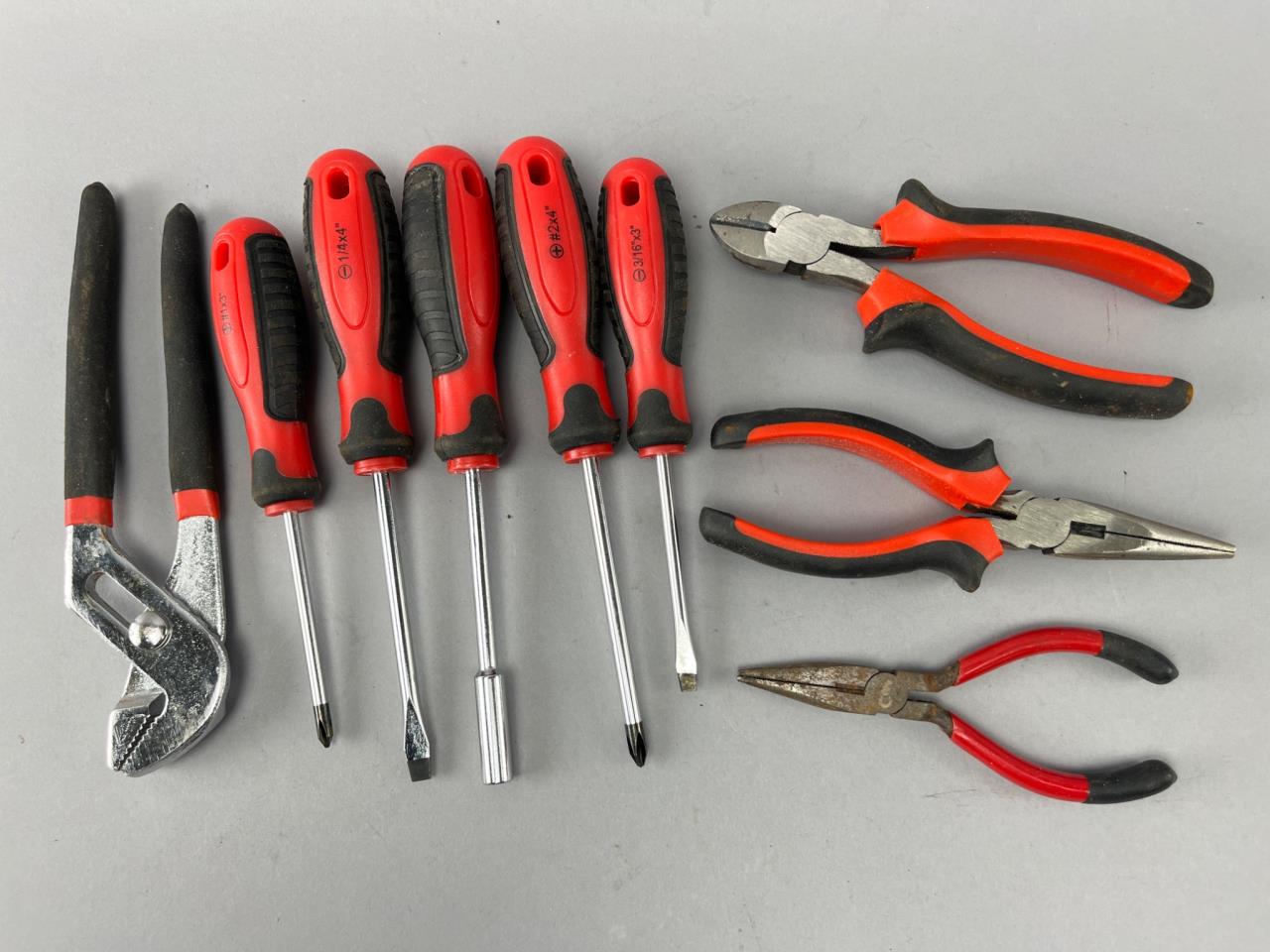 Six screwdrivers with red and black handles, two pliers, and one adjustable wrench. Screwdrivers are labeled with various sizes and types, suitable for diverse tasks. Tools show standard wear from previous use.