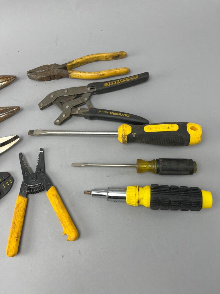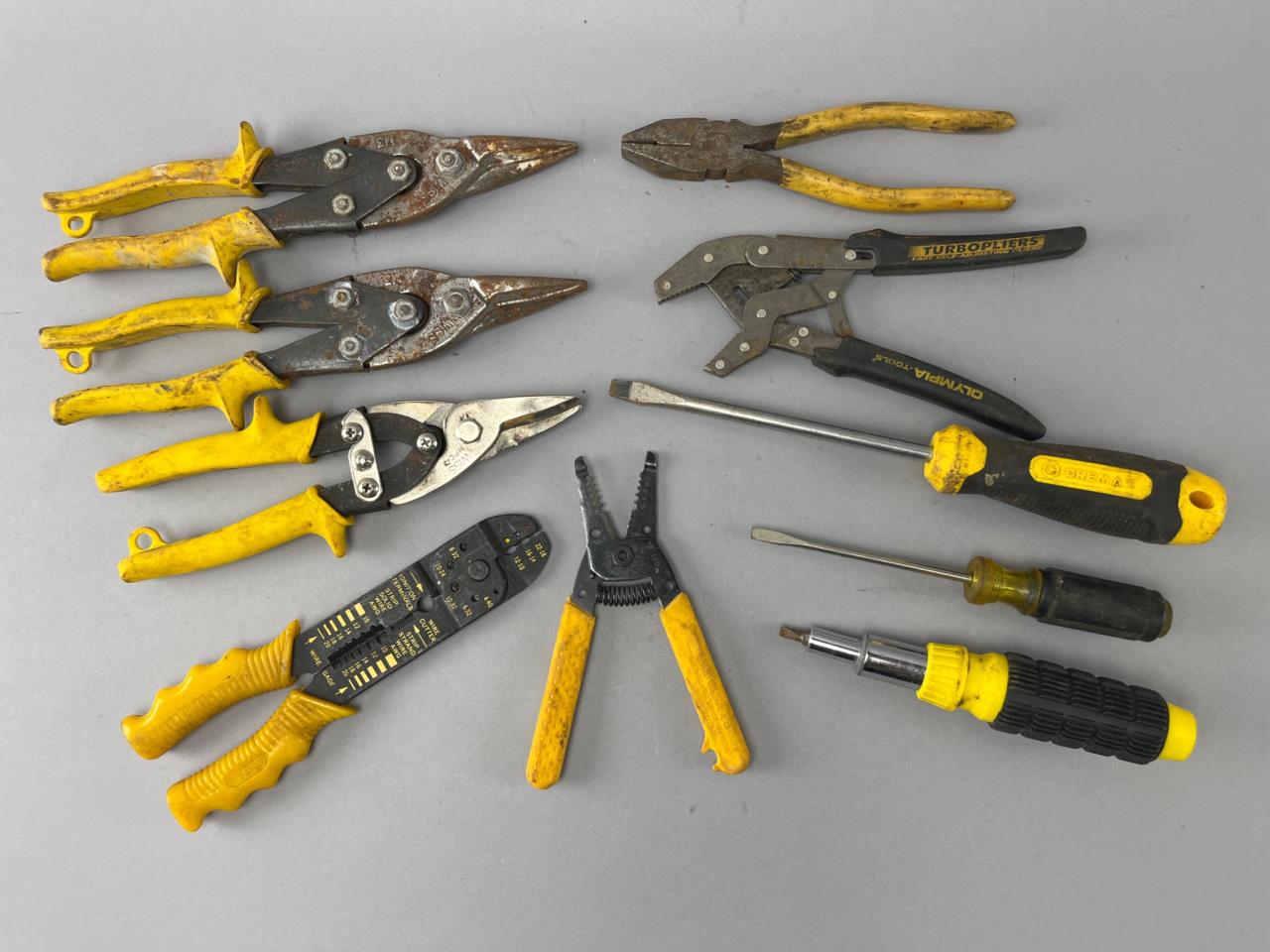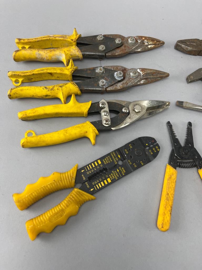 Hand tools, including tin snips, wire strippers, pliers, a locking wrench, and screwdrivers. Handles feature yellow accents. Items exhibit wear from use.