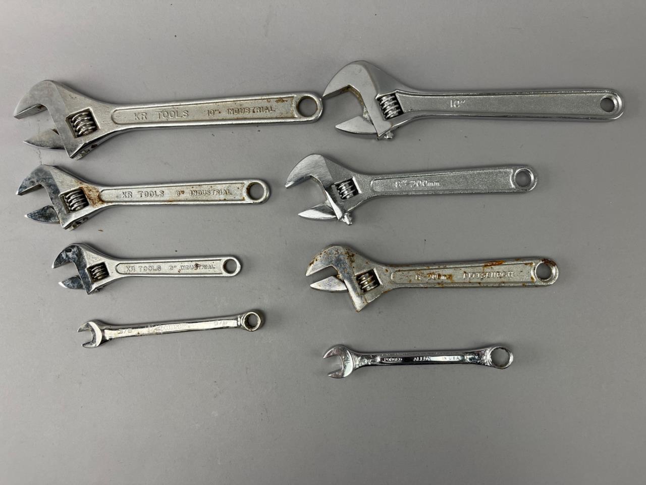 Adjustable wrenches and fixed open-end wrenches. Includes various sizes and brands. Visible wear and some surface rust on certain pieces.