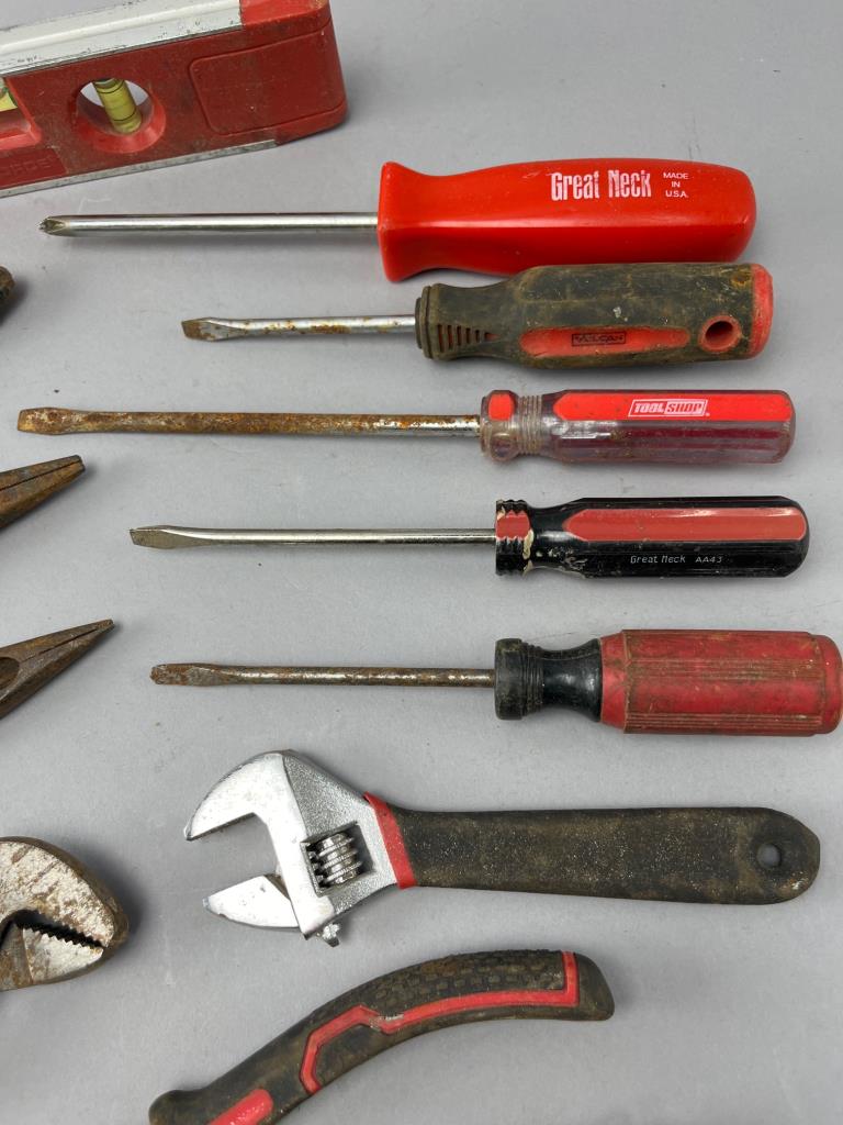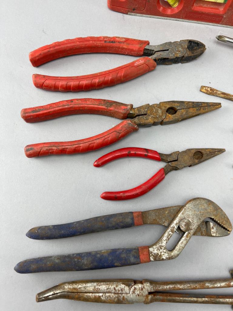 Hand tools including pliers, adjustable wrenches, flathead and Phillips screwdrivers, and a level. Some tools show signs of rust and wear.