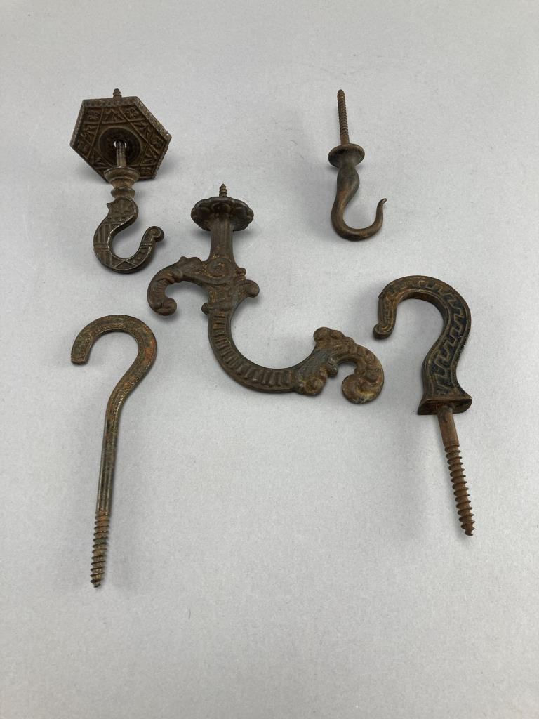 Five decorative metal wall hooks with intricate designs. Includes various styles and sizes, each featuring screw mounts for wall attachment. Displays signs of surface wear and rust.
