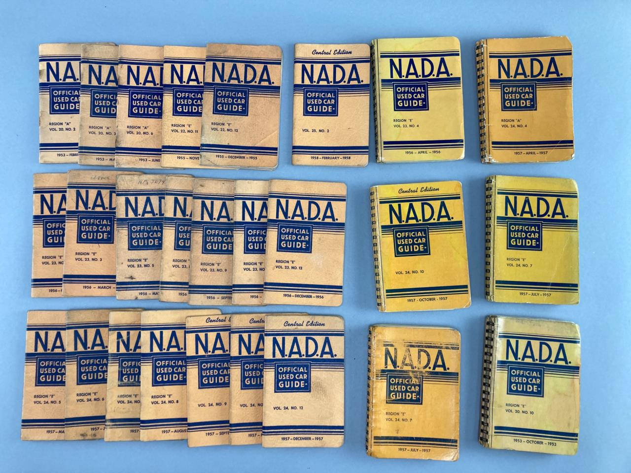 NADA Official Used Car Guides from various years. Includes softcover booklets with pricing and valuation information for vehicles. Signs of wear and aging visible on covers and pages.