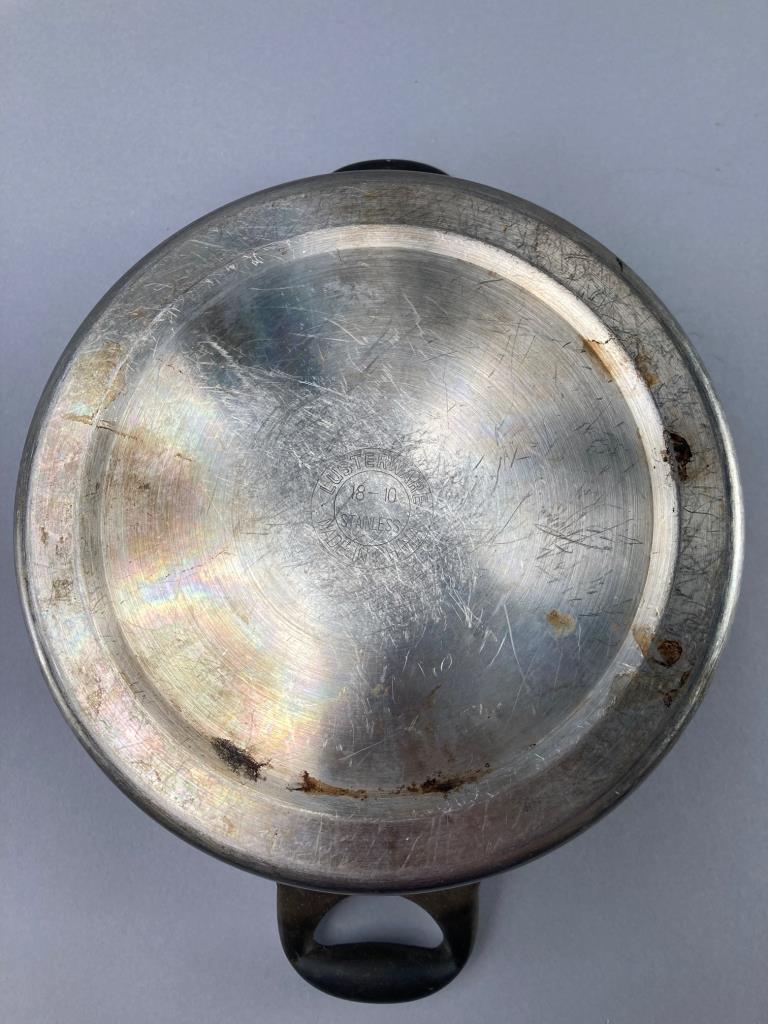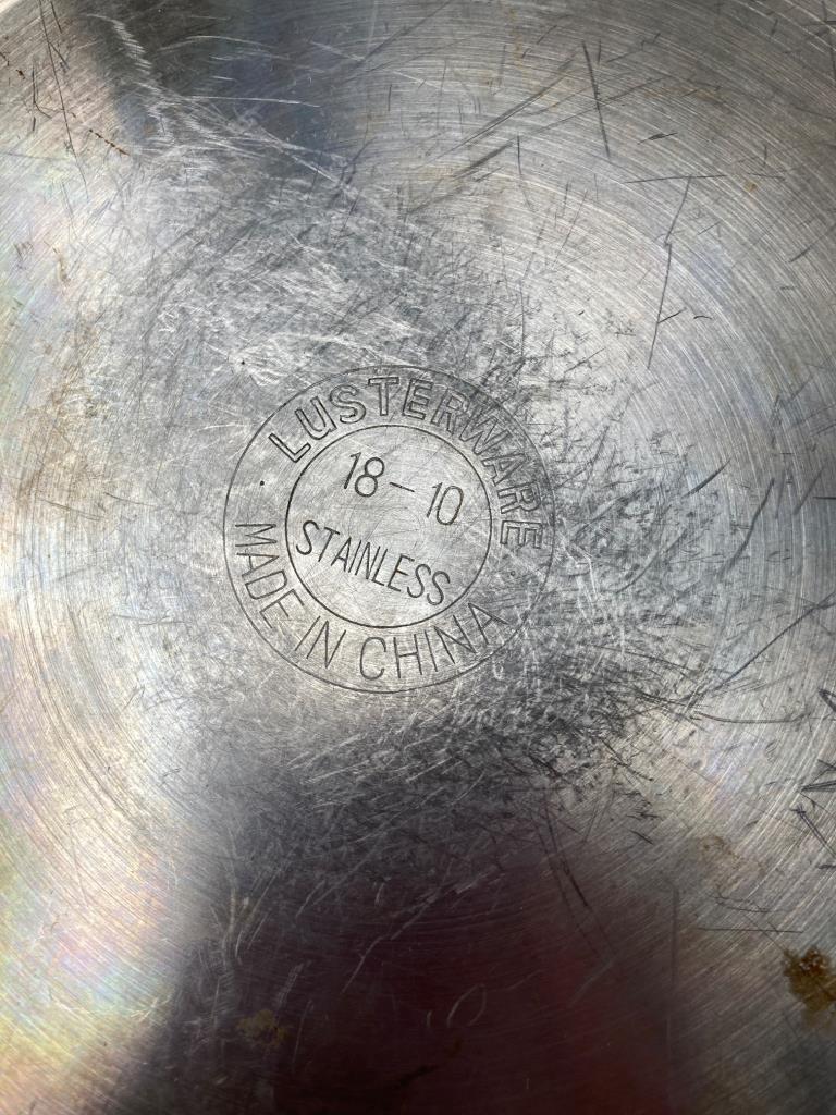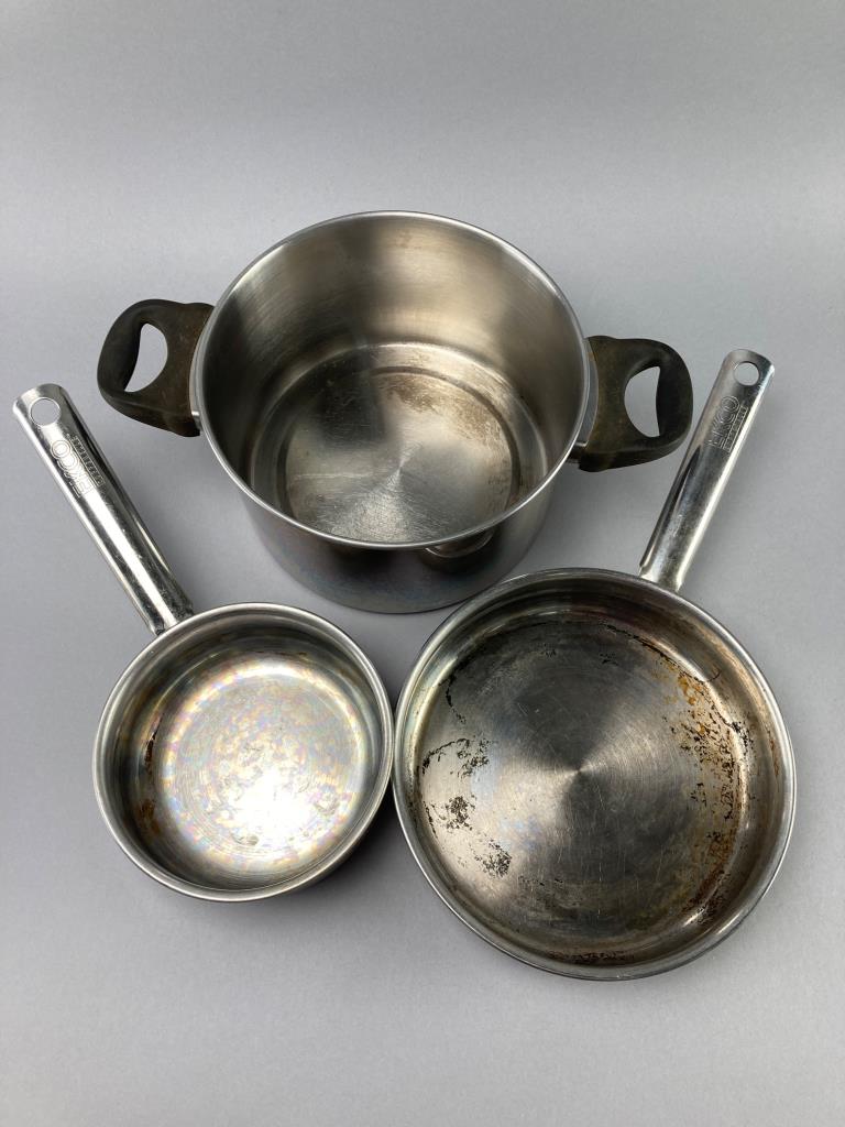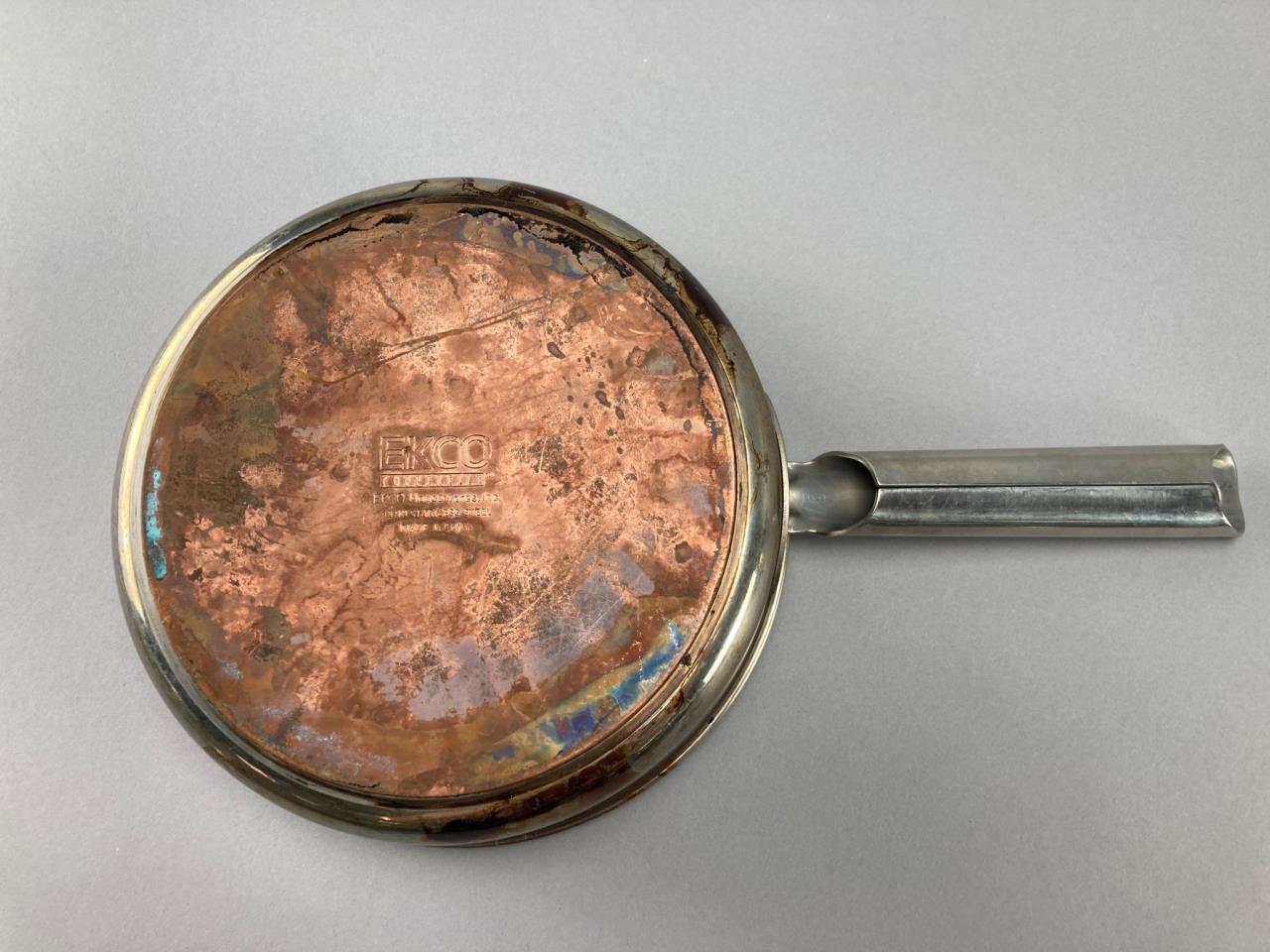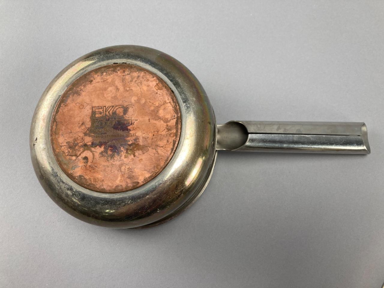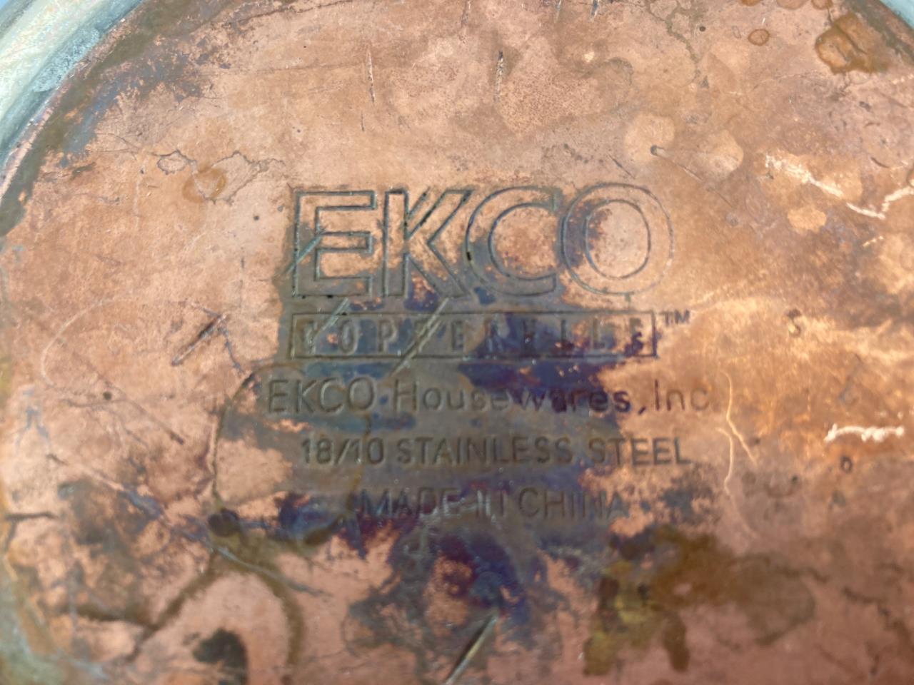 Three pieces of stainless steel cookware: two EKCO Copper Clad pans with handles and one Lustreware stainless steel pot with side handles. Made in China. Visible wear and discoloration on undersides.