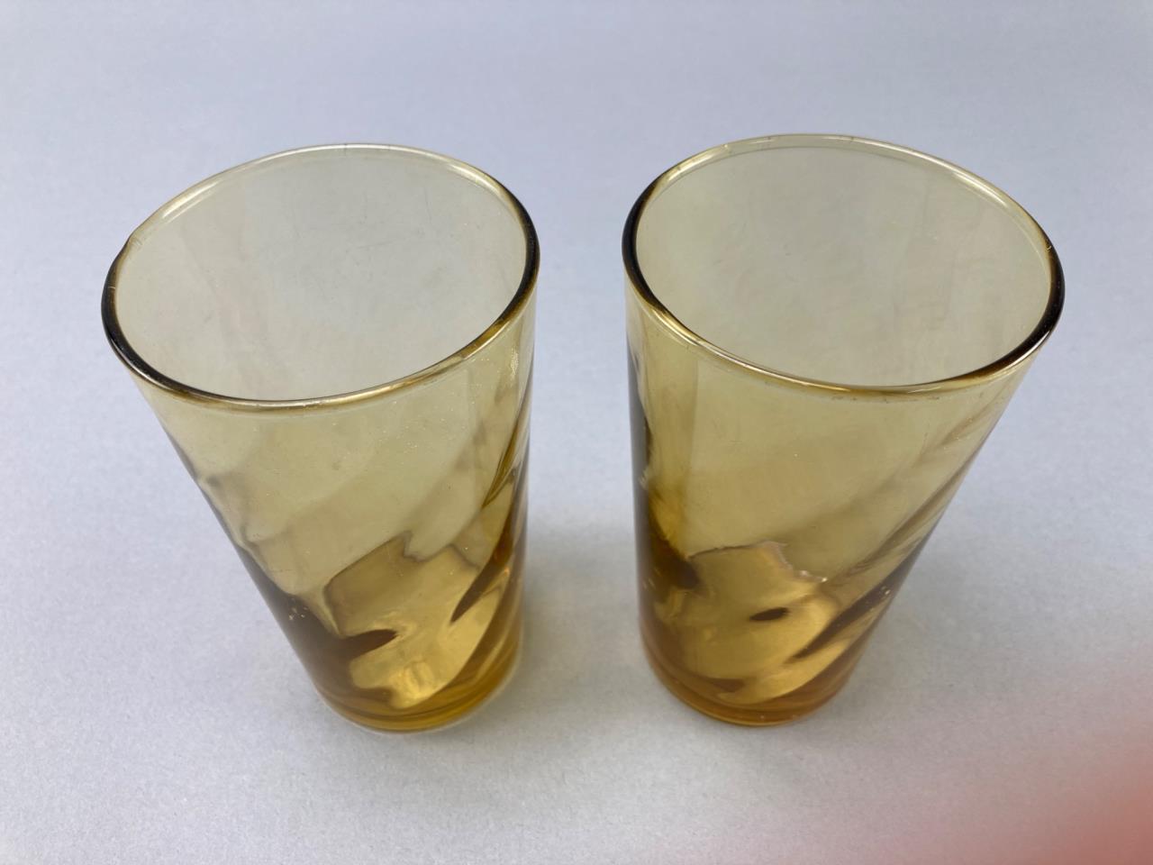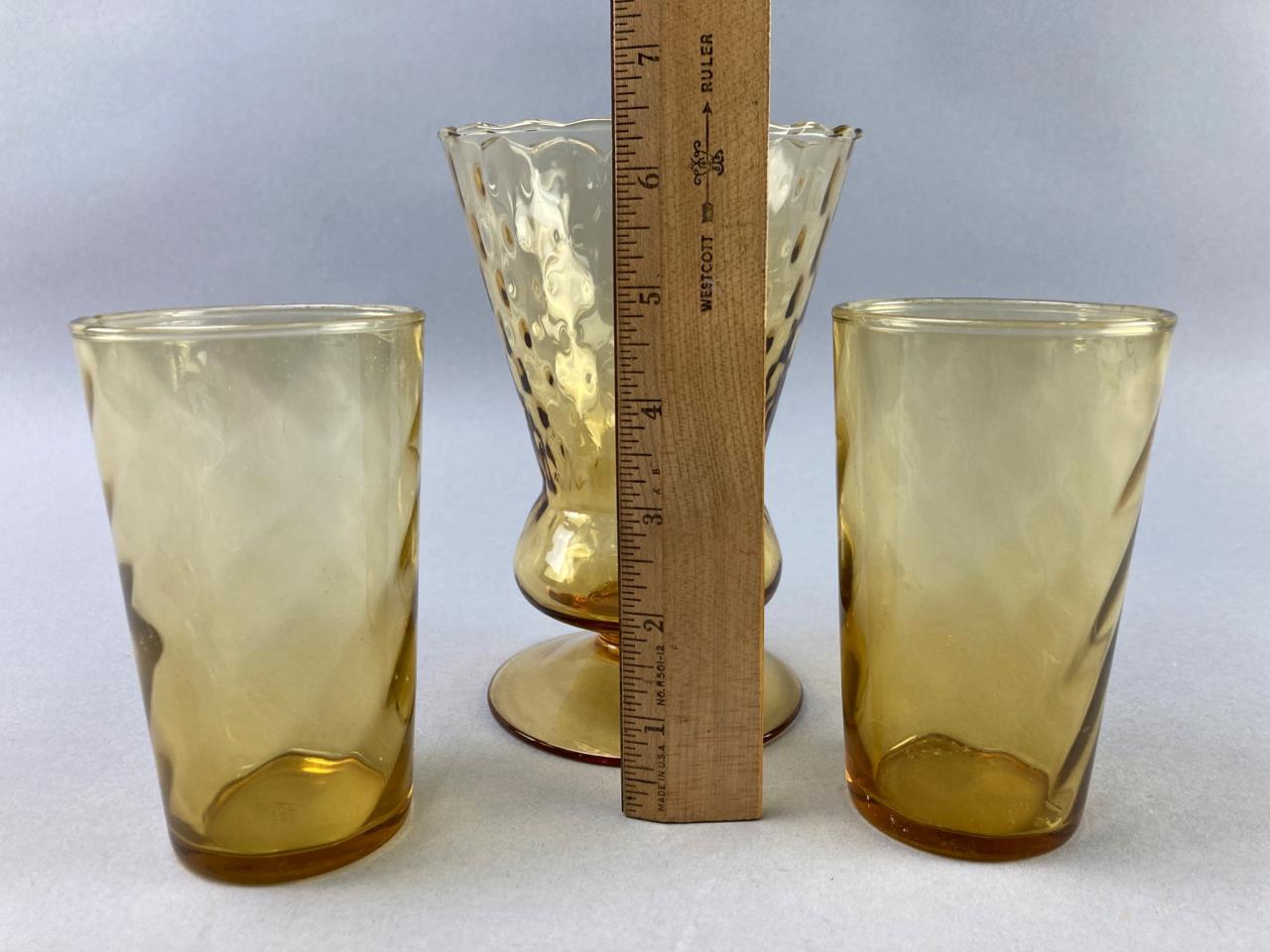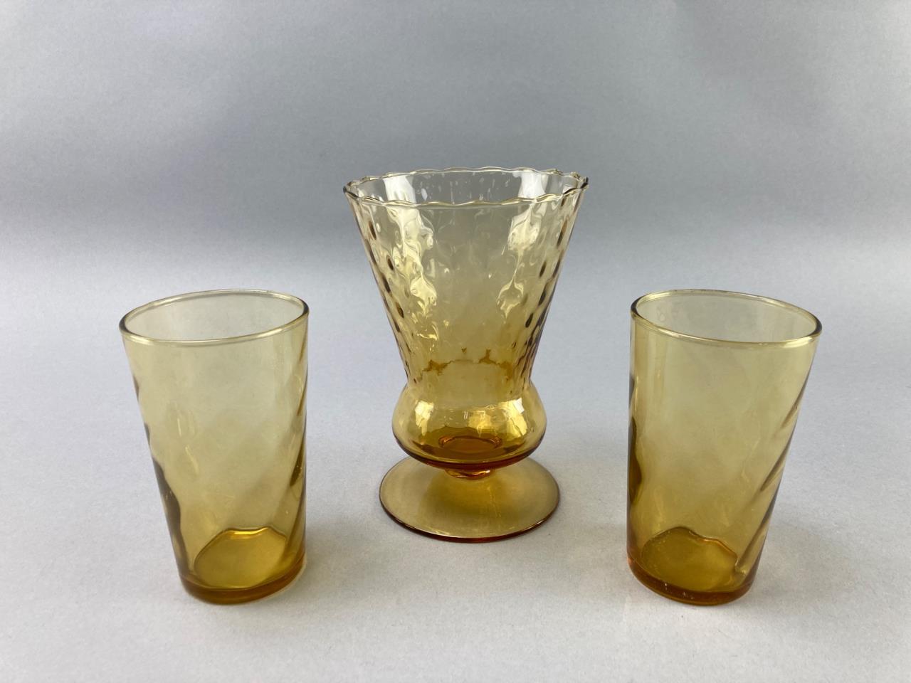 Two Federal Glass amber tumblers and one 1960s Mid-Century Modern amber glass vase with a textured design. The base of one tumbler shows the Federal Glass shield mark. Typical wear noted.