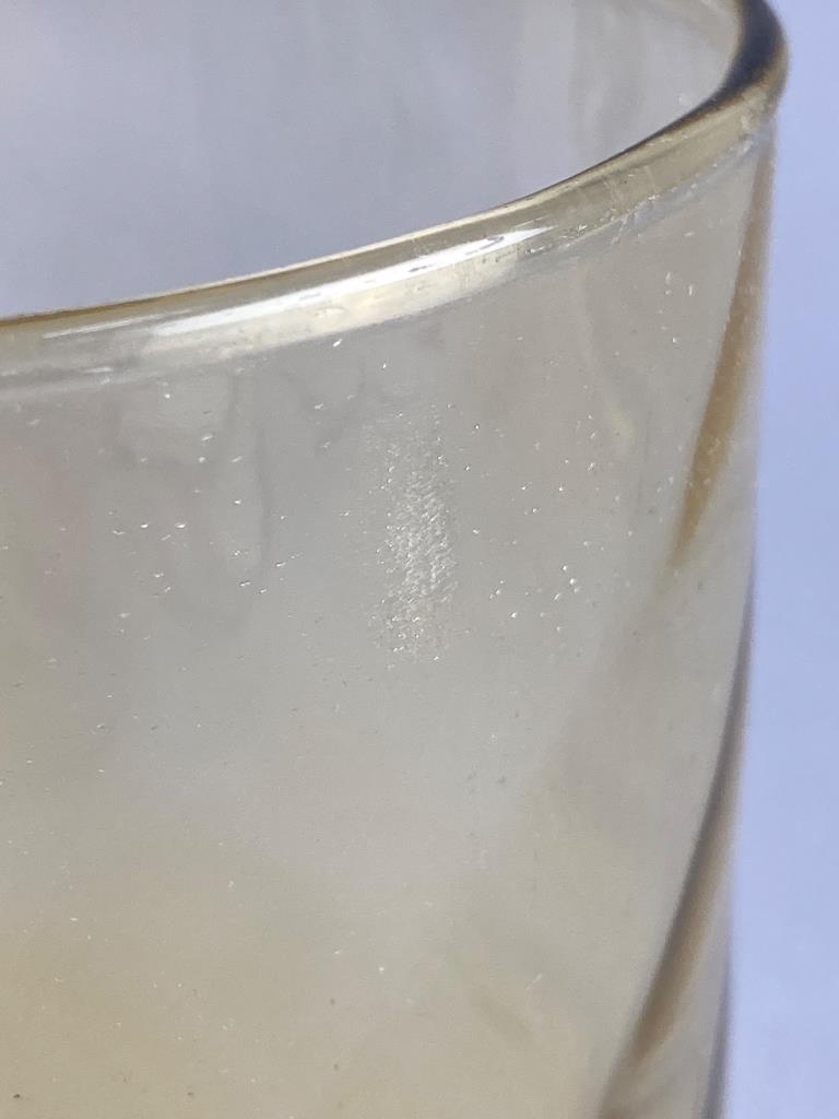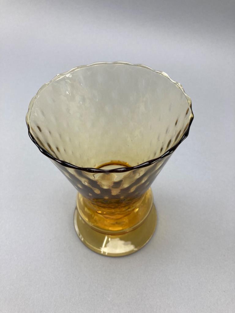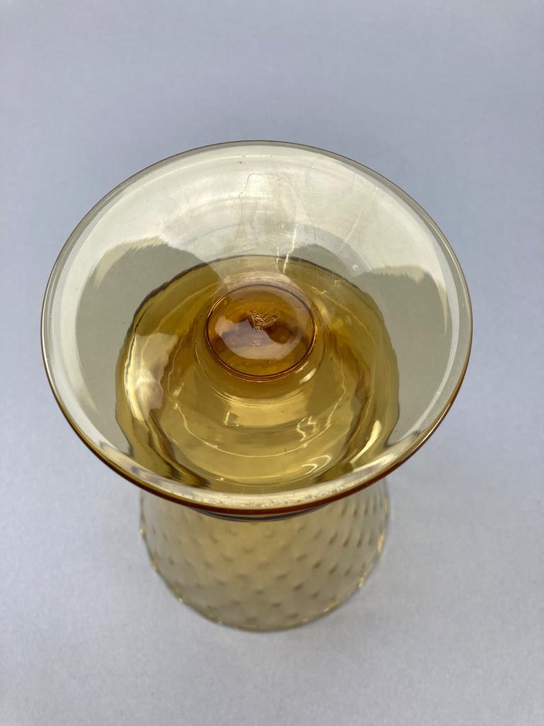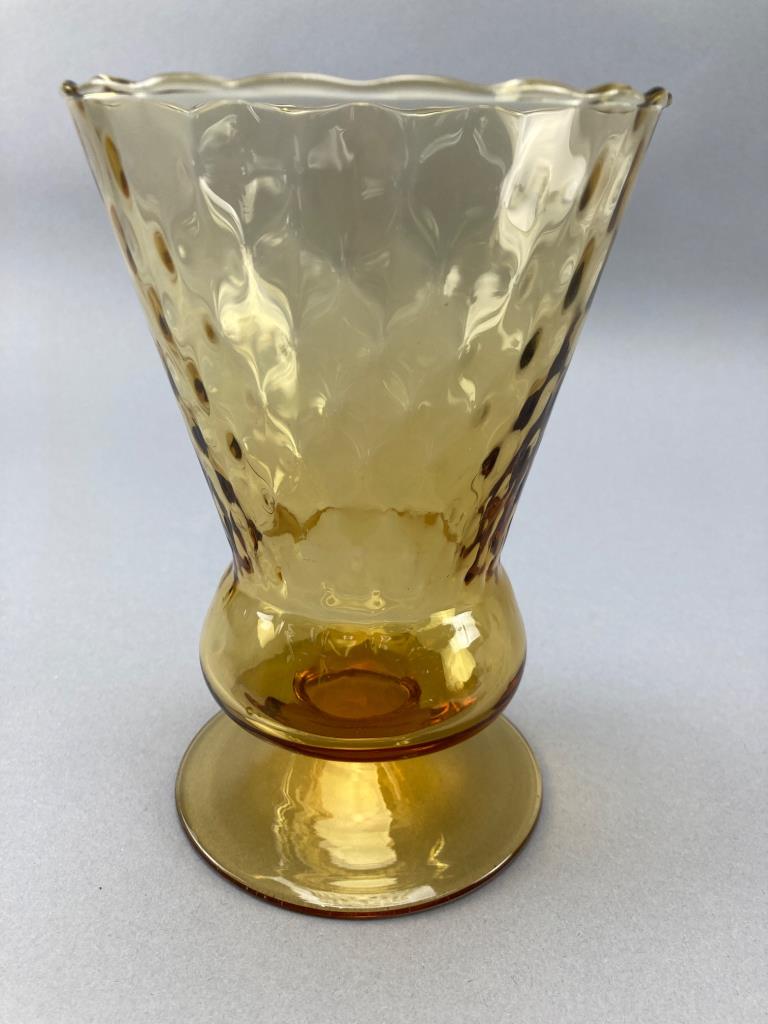 Two Federal Glass amber tumblers and one 1960s Mid-Century Modern amber glass vase with a textured design. The base of one tumbler shows the Federal Glass shield mark. Typical wear noted.