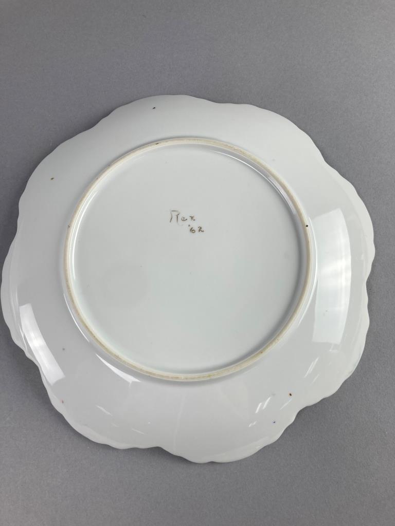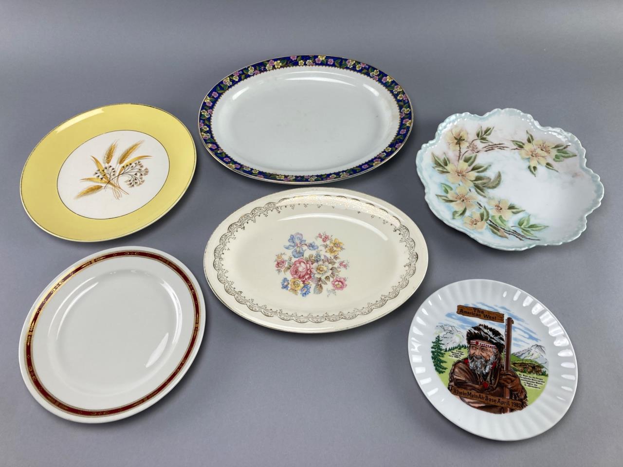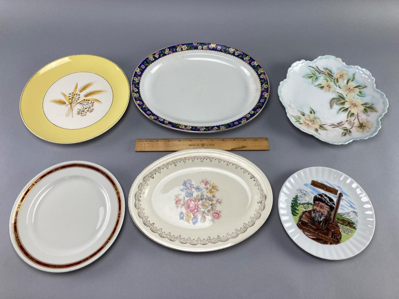 Six ceramic plates and platters featuring various decorative designs, including floral patterns, rustic imagery, and vibrant borders. Some pieces bear makers’ marks on the underside.