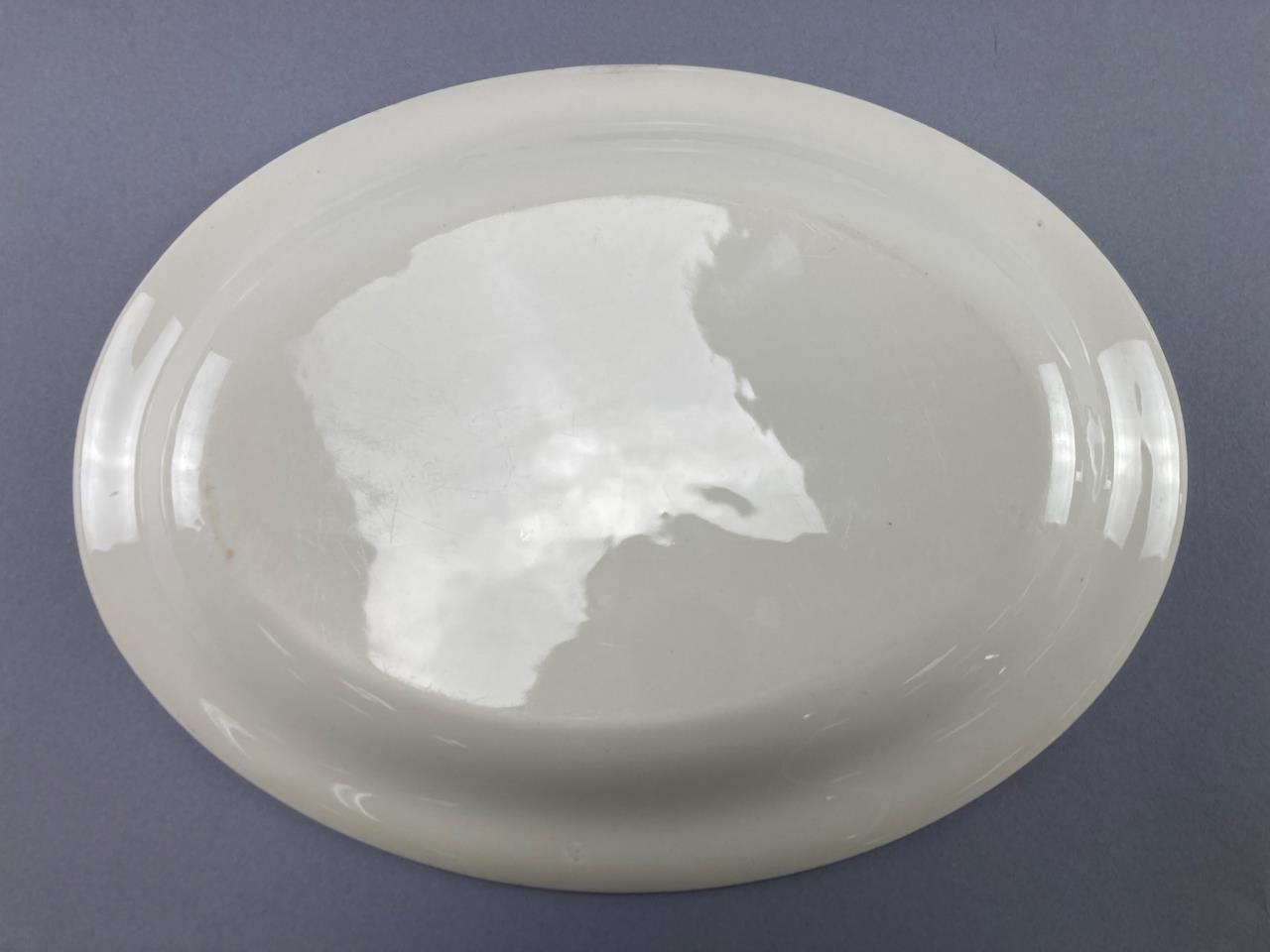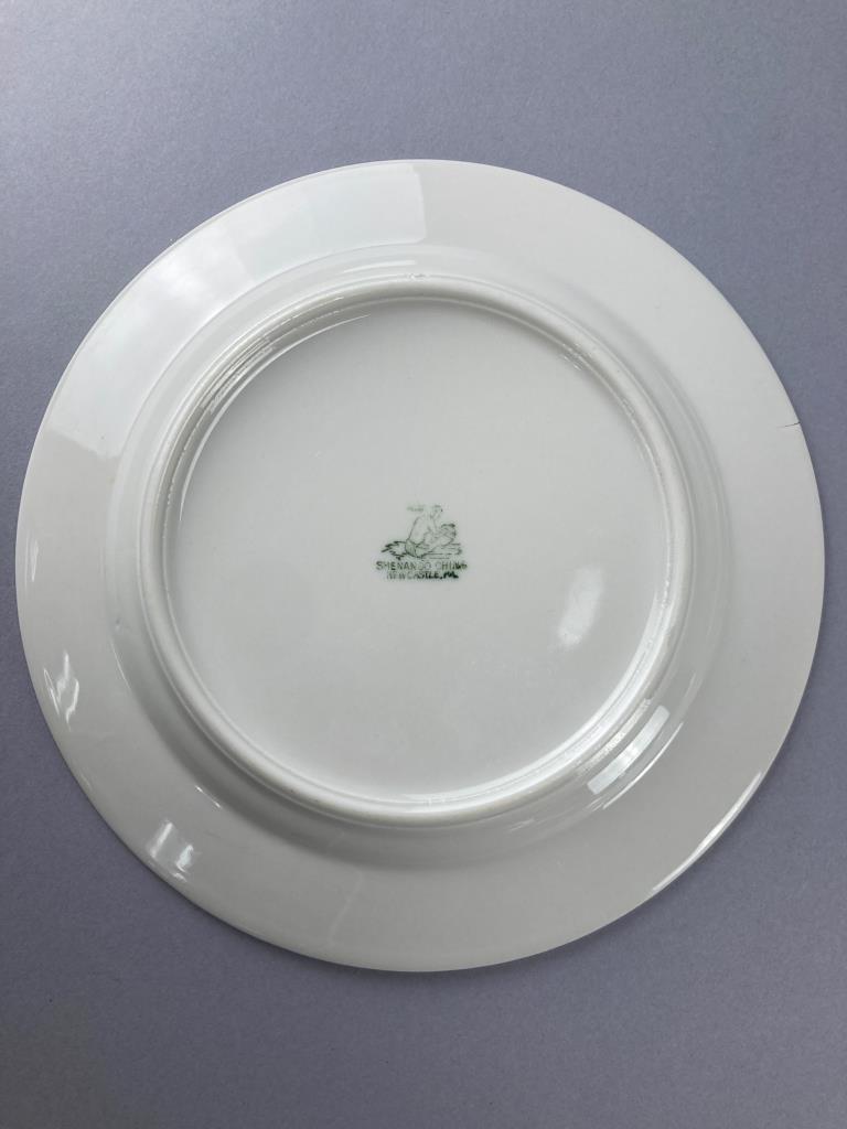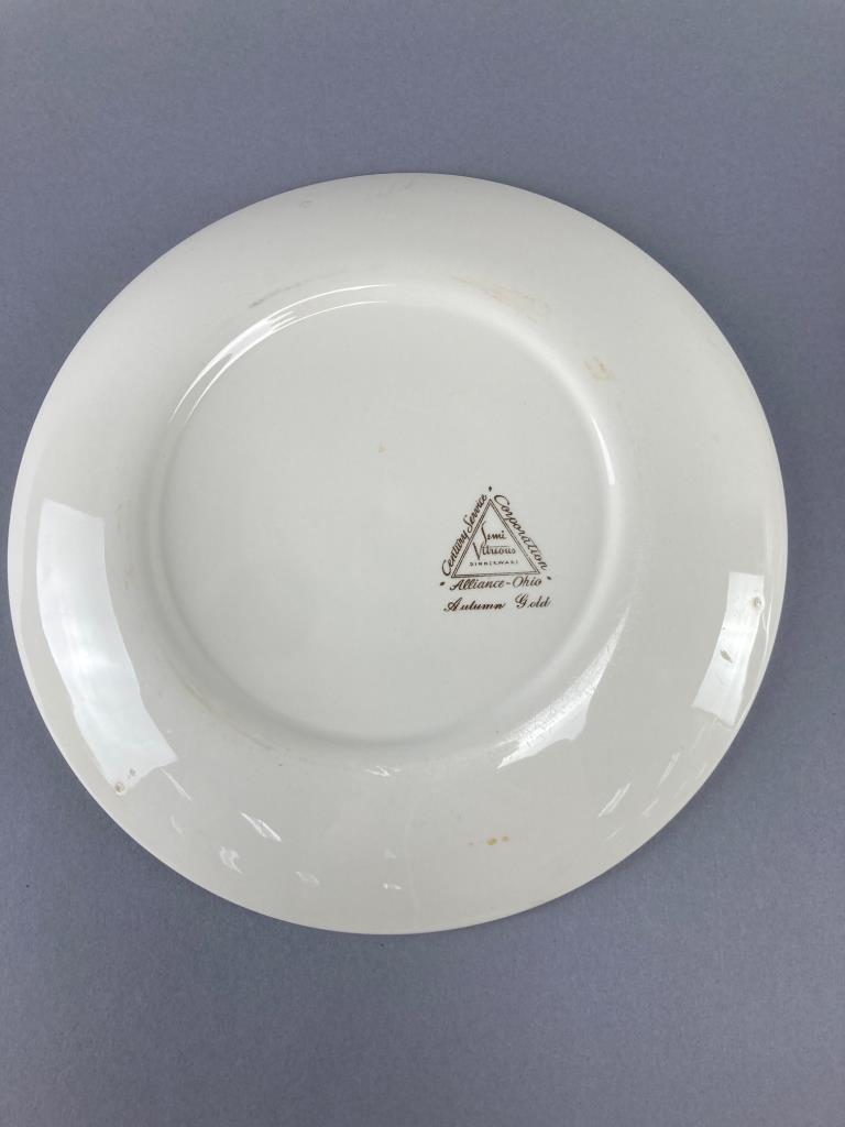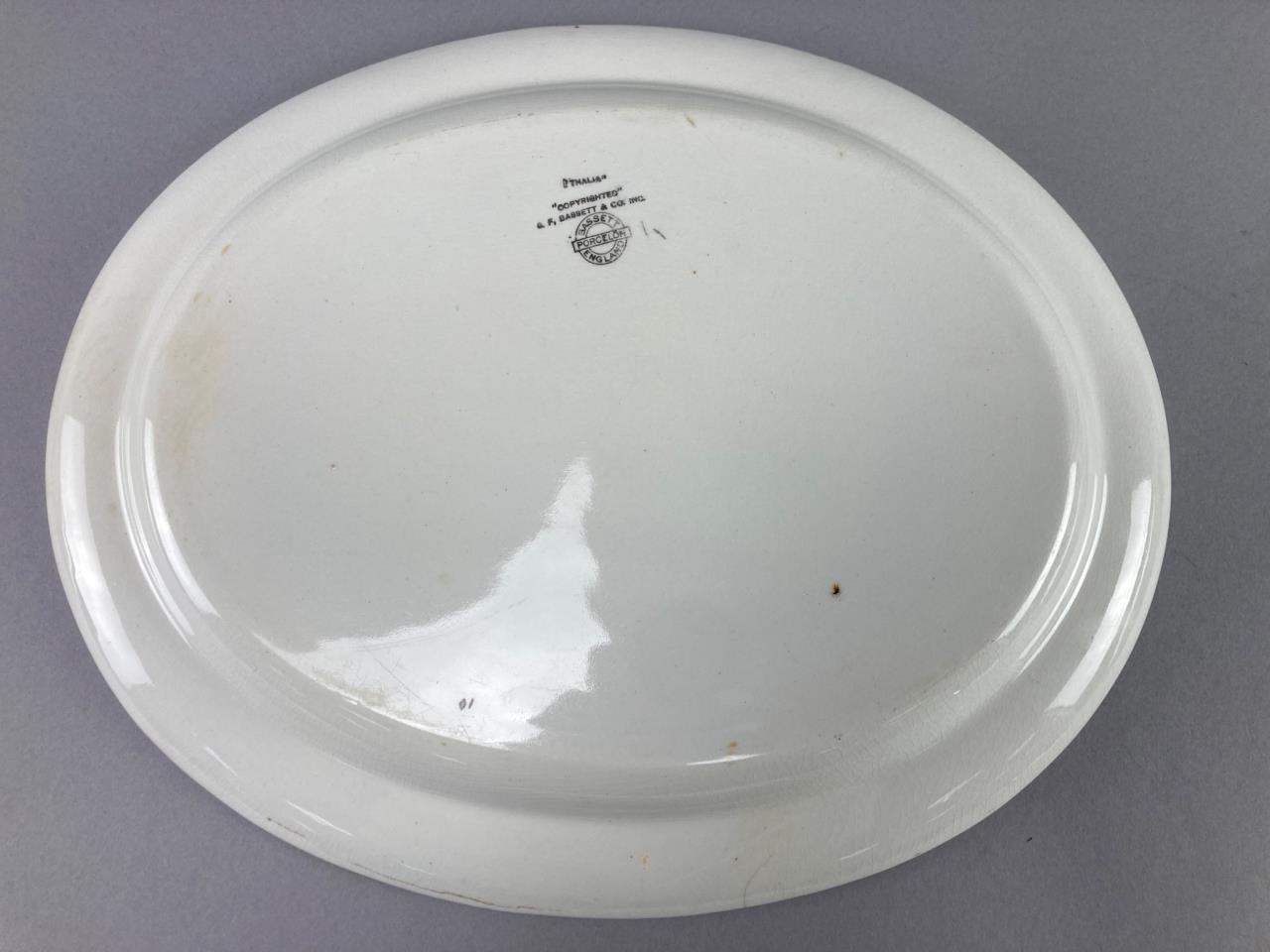 Six ceramic plates and platters featuring various decorative designs, including floral patterns, rustic imagery, and vibrant borders. Some pieces bear makers’ marks on the underside.