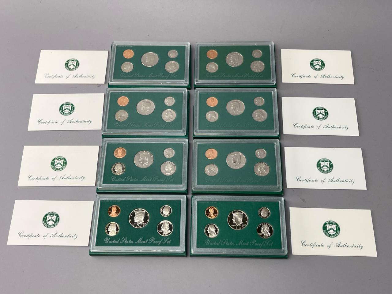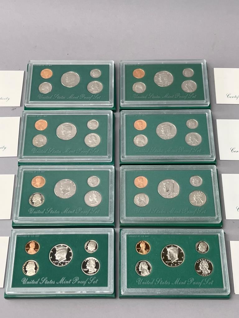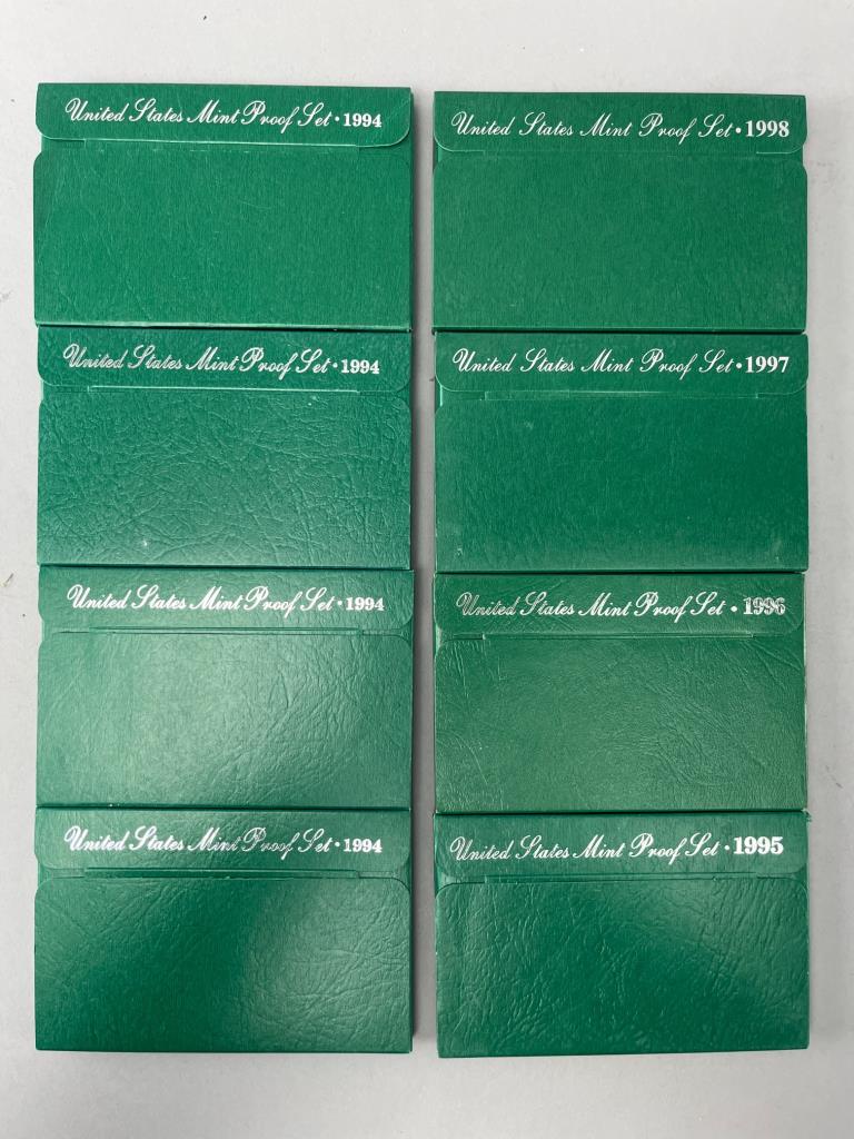 Eight United States Mint proof sets from 1994 to 1997. Each set includes coins housed in their original green packaging. No additional items are included.