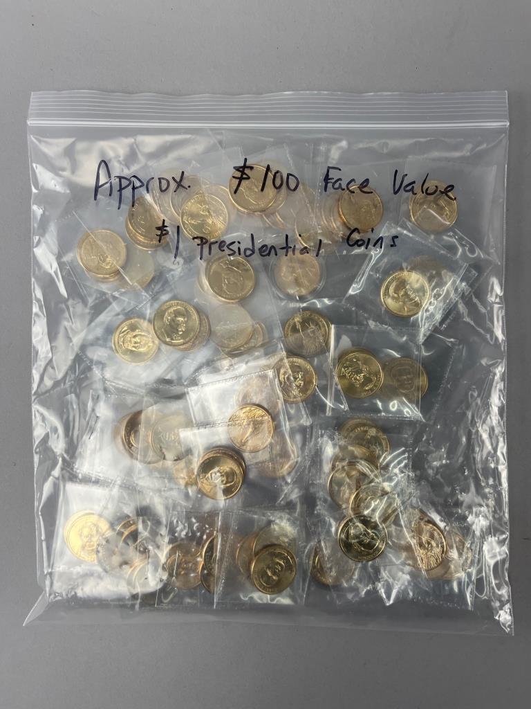 Bag containing approximately 100 coins with a $1 face value each. Coins feature designs from the Presidential $1 Coin Program. Coins are stored in plastic sleeves. Photo props not included.