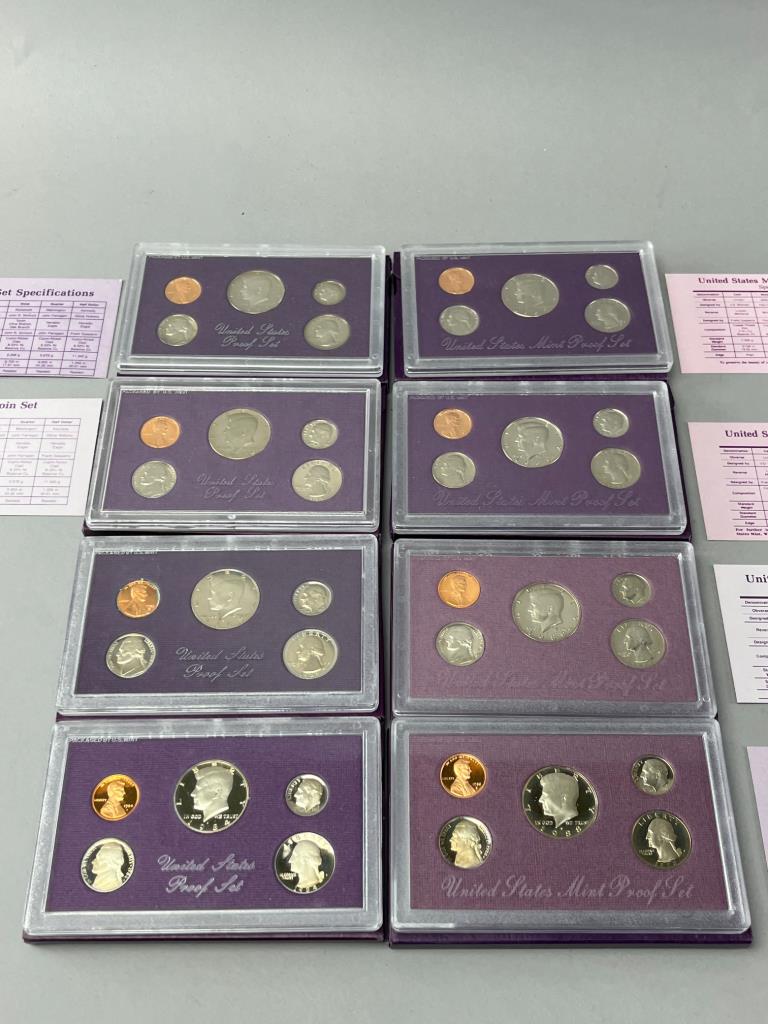 9 U.S. Mint Proof Sets from 1984 to 1992. Each set includes coins sealed in the original packaging. Packaging shows typical wear consistent with storage.