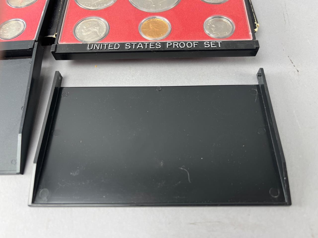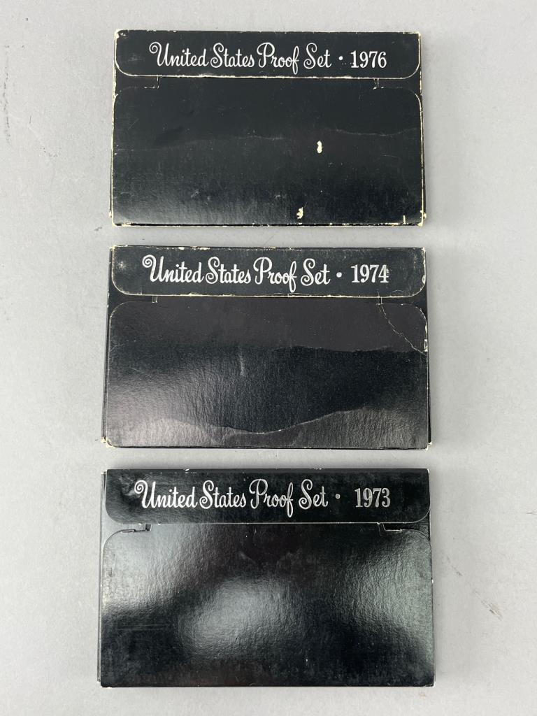 Three United States proof coin sets dated 1973, 1974, and 1975. Sets include their original hard plastic cases and red card inserts. A case from one set is detached. Coins appear intact within their cases.