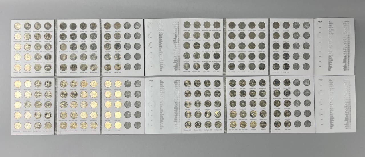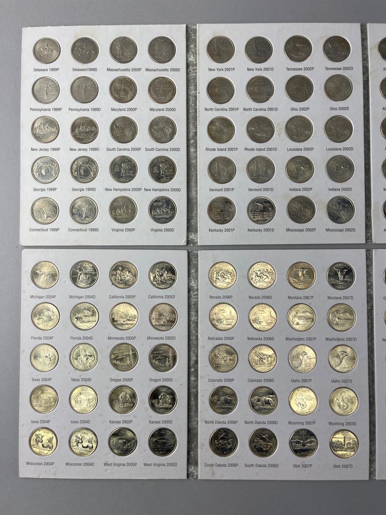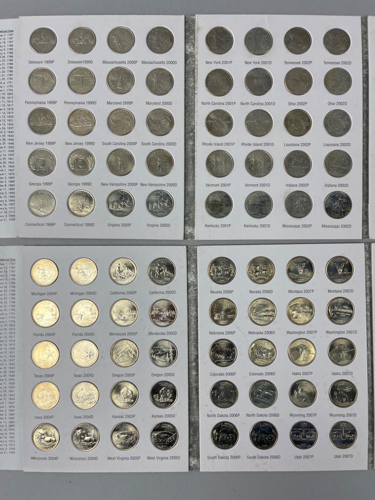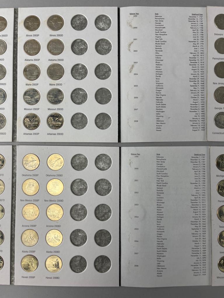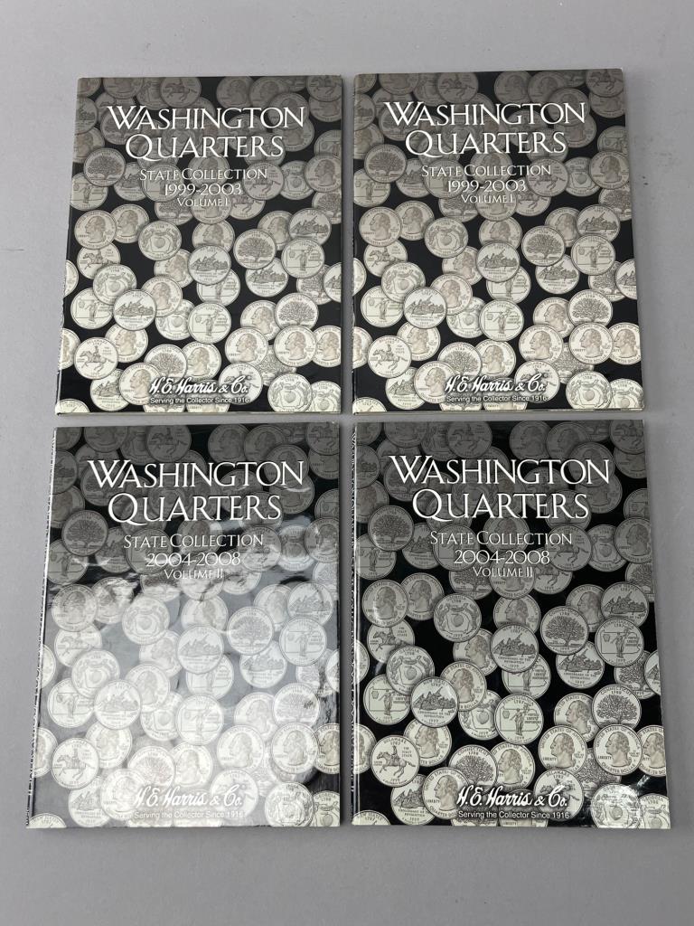 Four H.E. Harris & Co. albums for Washington quarters, including labeled slots for coins from 1999 to 2008. Contains quarters from the U.S. Mint, with pages showing state designs and year markers. Coins and albums included as pictured.