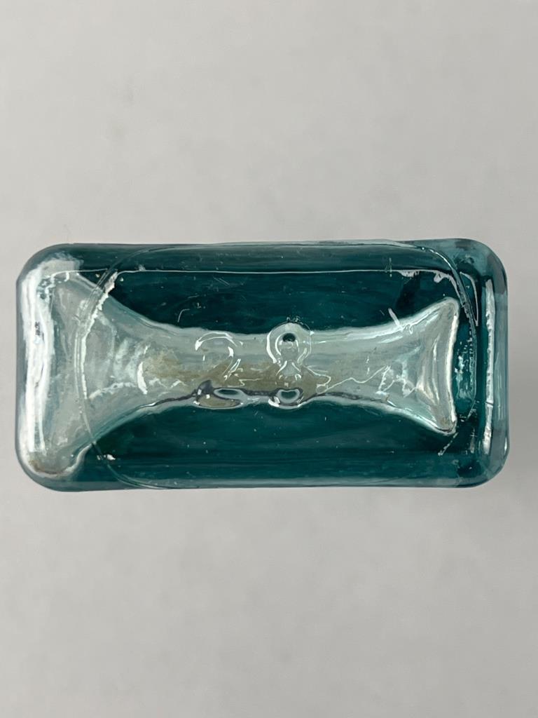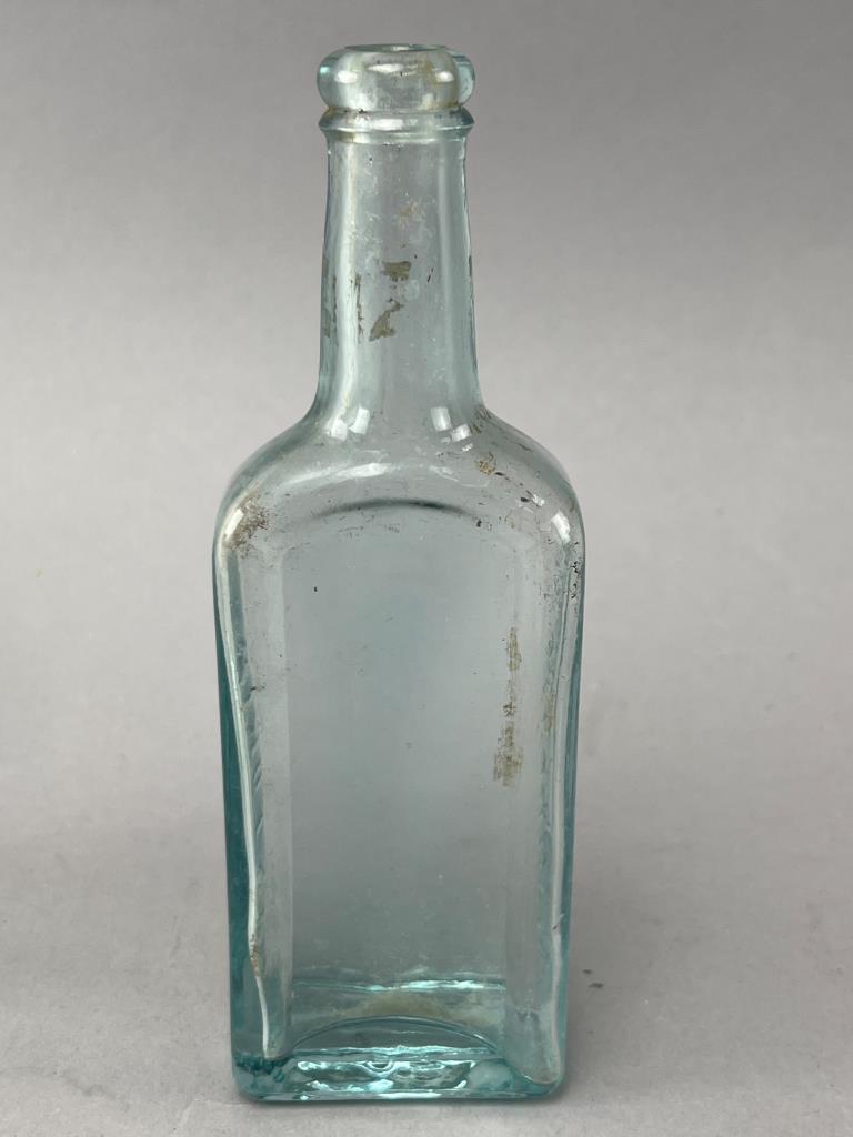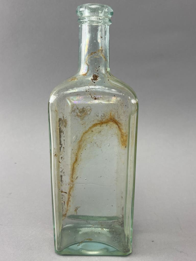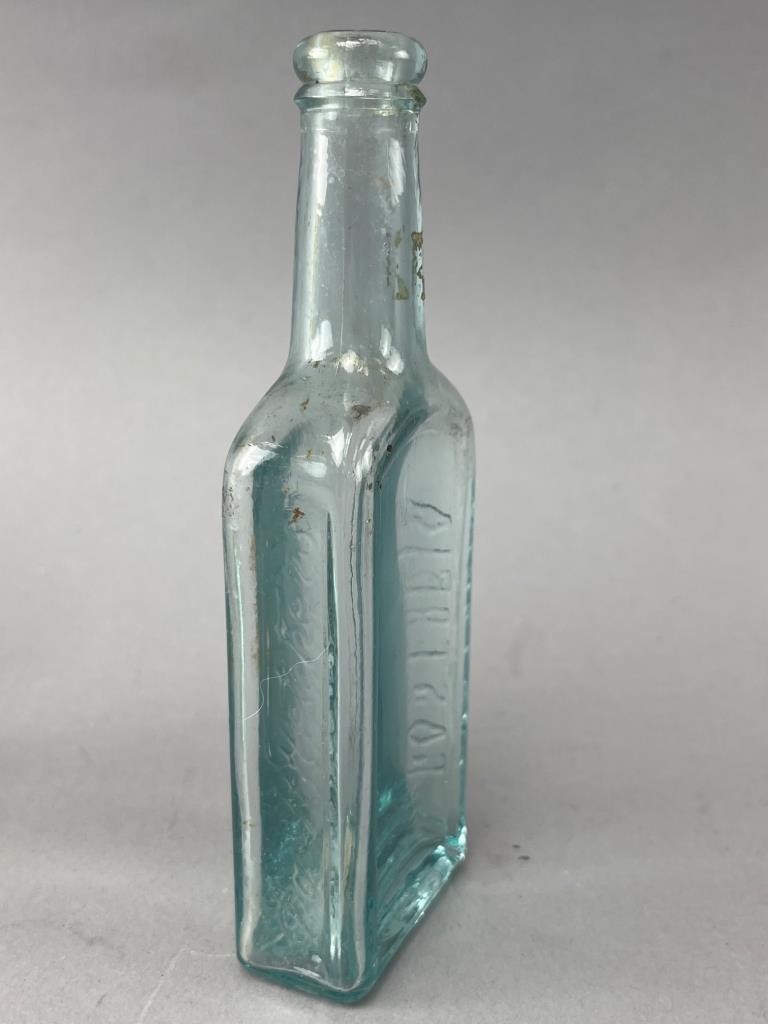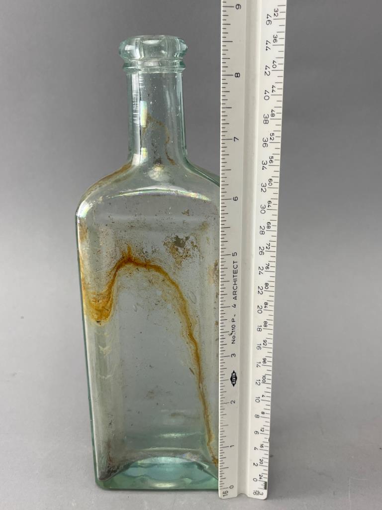 Two rectangular glass bottles, including one larger clear bottle with visible internal staining and one smaller aqua-colored bottle with embossed text on the sides. Both have applied lips and show wear consistent with age.