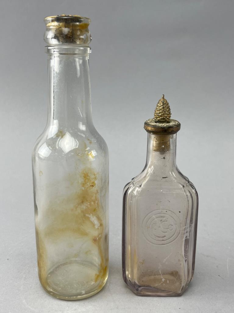 Two glass bottles. One bottle features a Colgate & Co., New York metal cap with decorative detail, and an embossed circular logo on the surface. The second bottle is plain and clear with visible residue inside.
