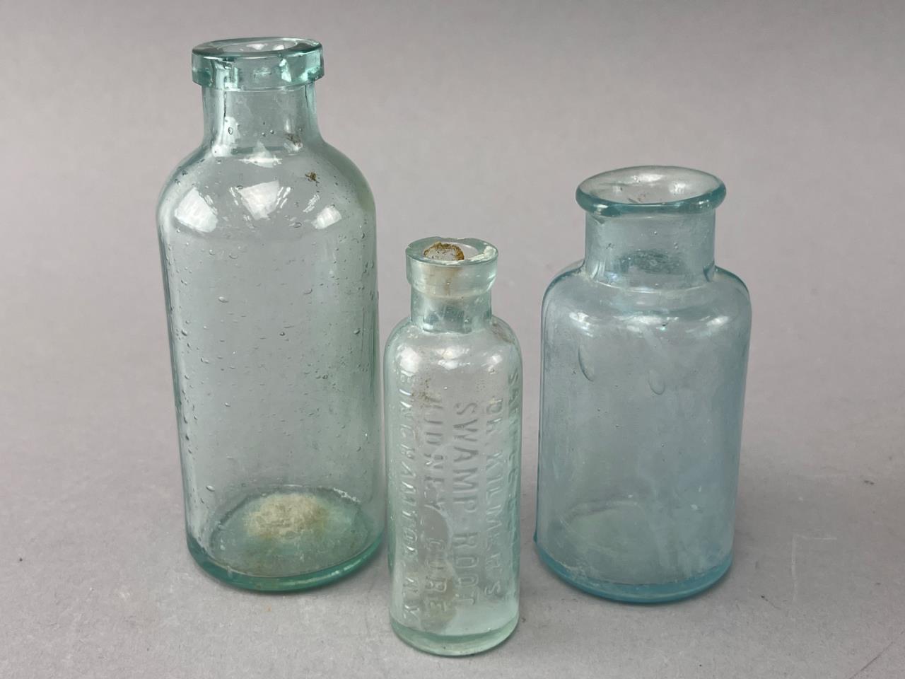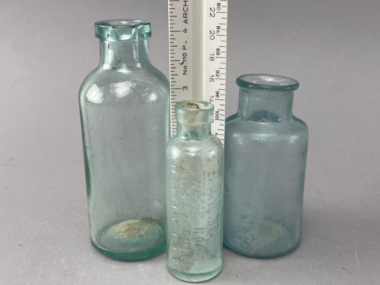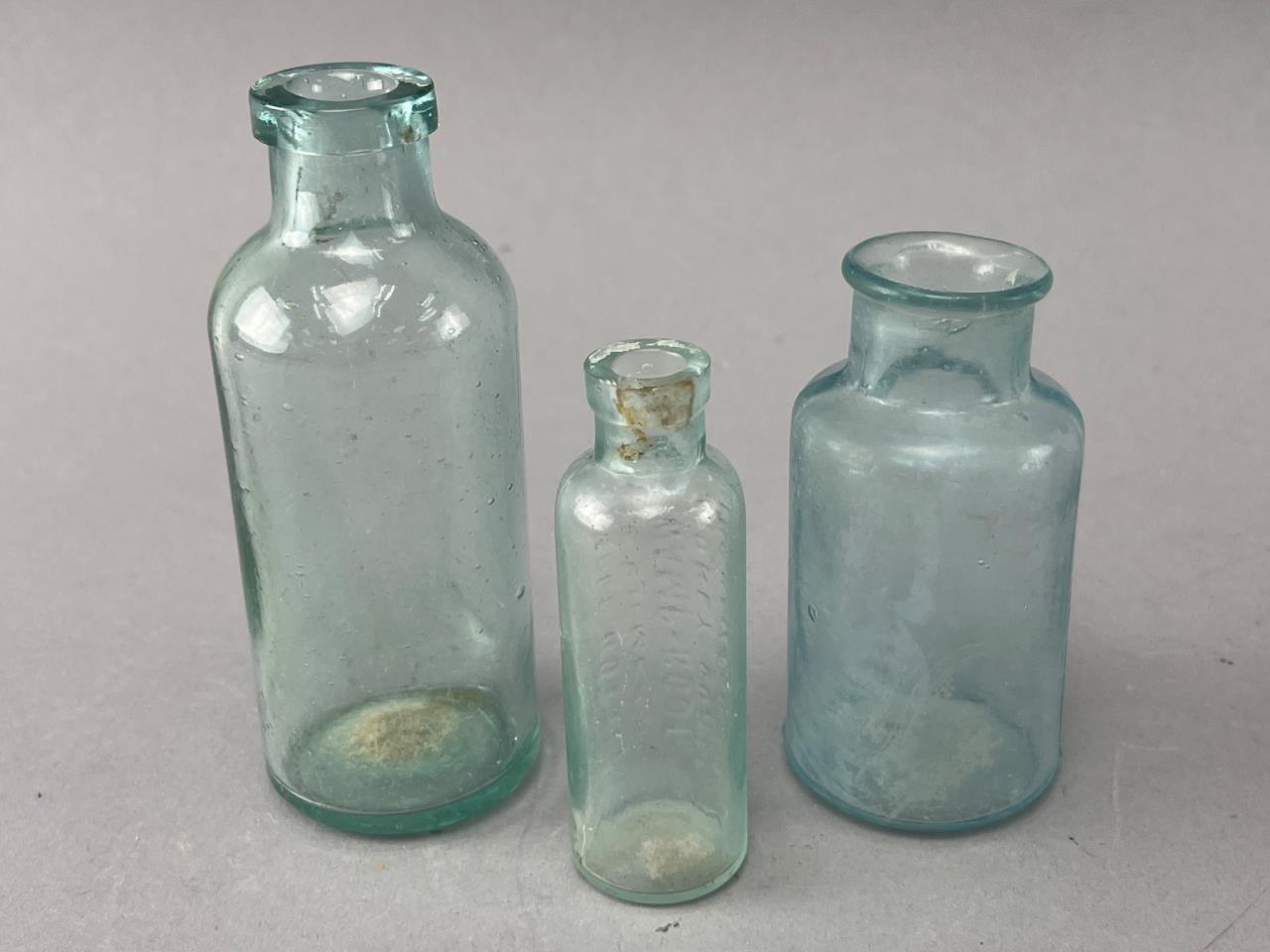 Three clear glass bottles, including one embossed with illegible text and two with smooth surfaces. Various shapes and sizes. Signs of wear from age and potential residue visible.