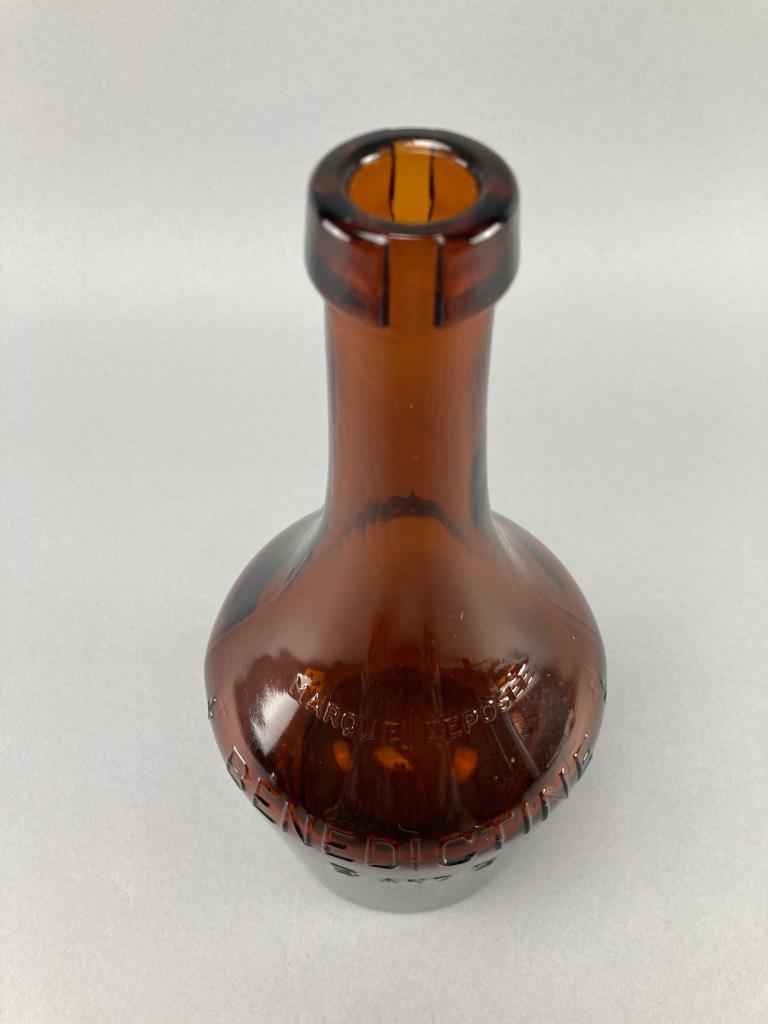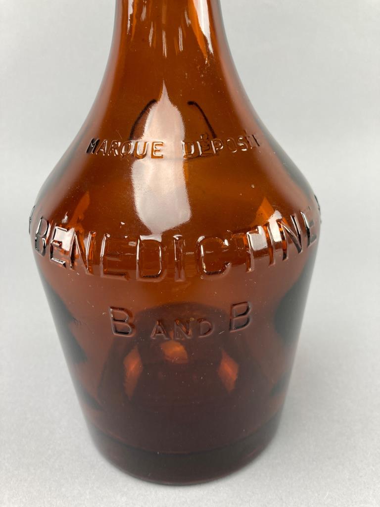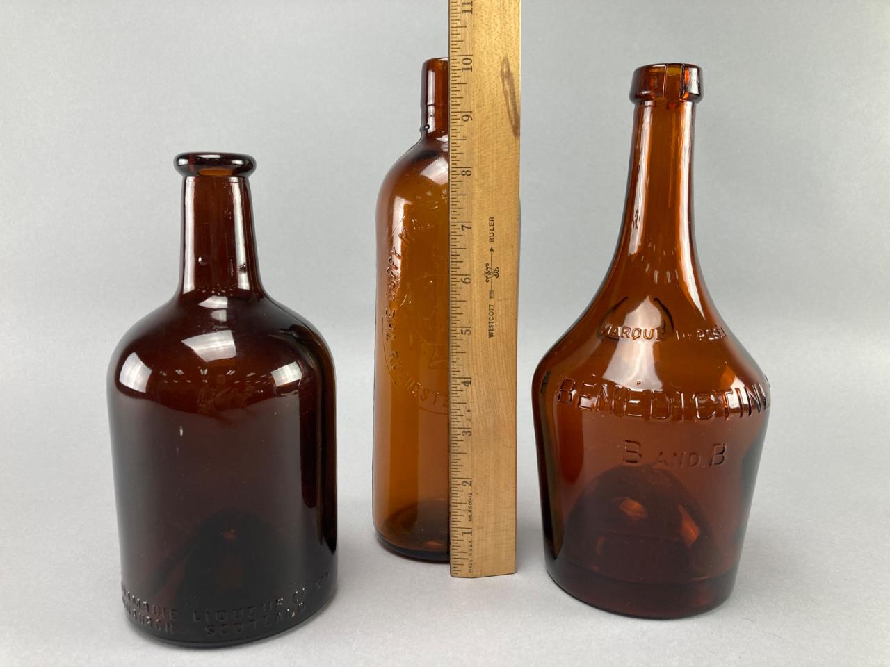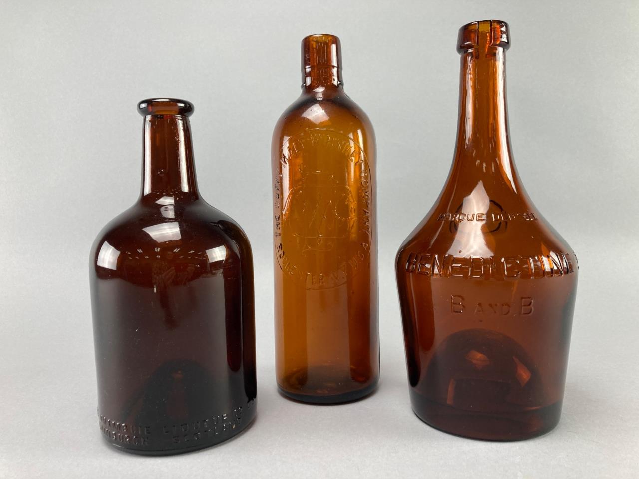 Three embossed amber glass bottles featuring markings of “Drambuie Liqueur Co. Ltd Scotland,” “Benedictine B and B,” and “The Duffey Malt Whiskey Company Rochester NY.” Distinct bases and mouths on each bottle.