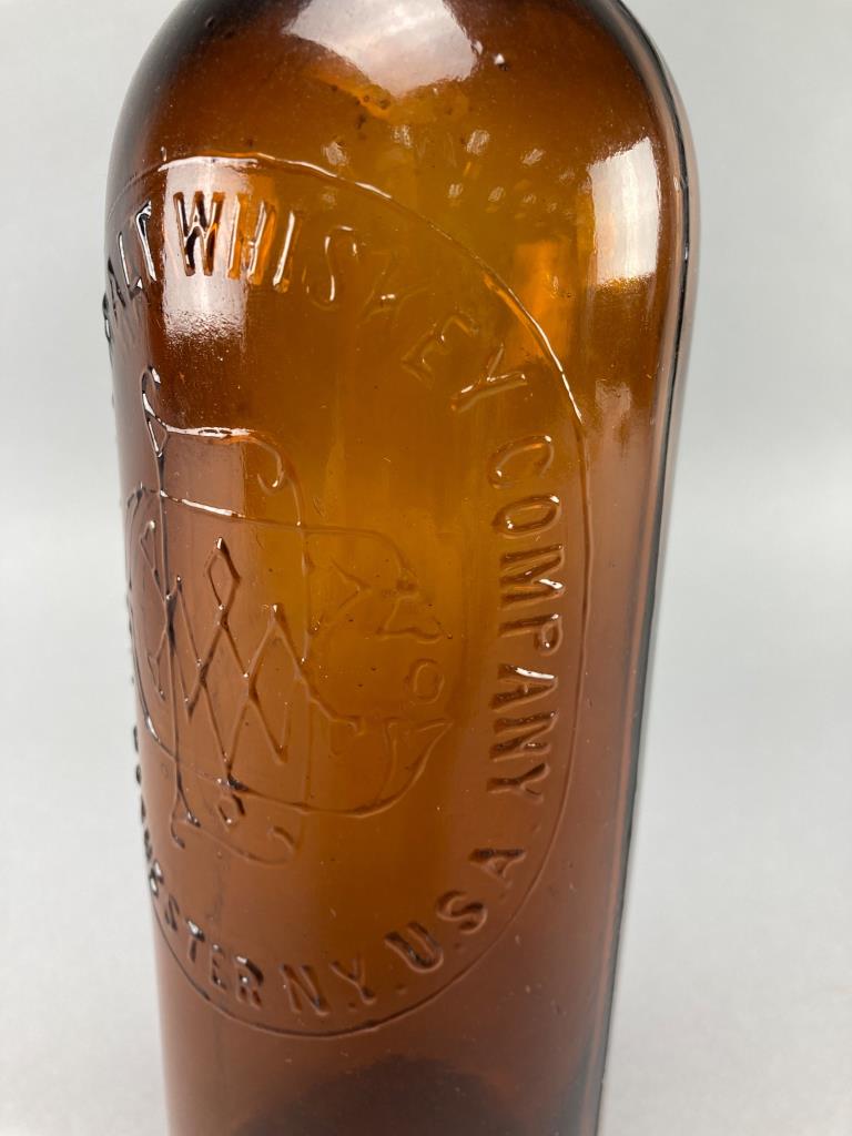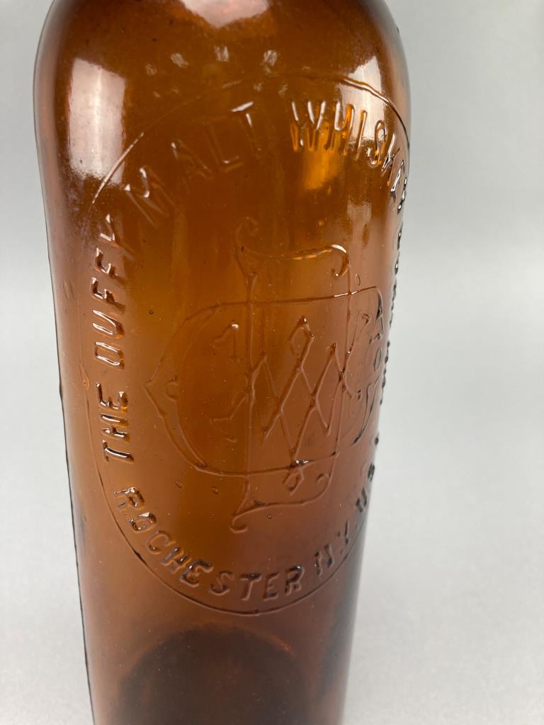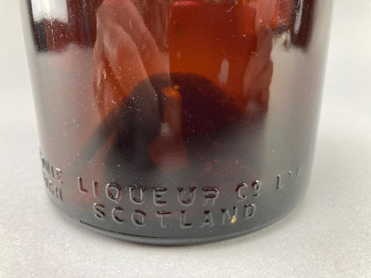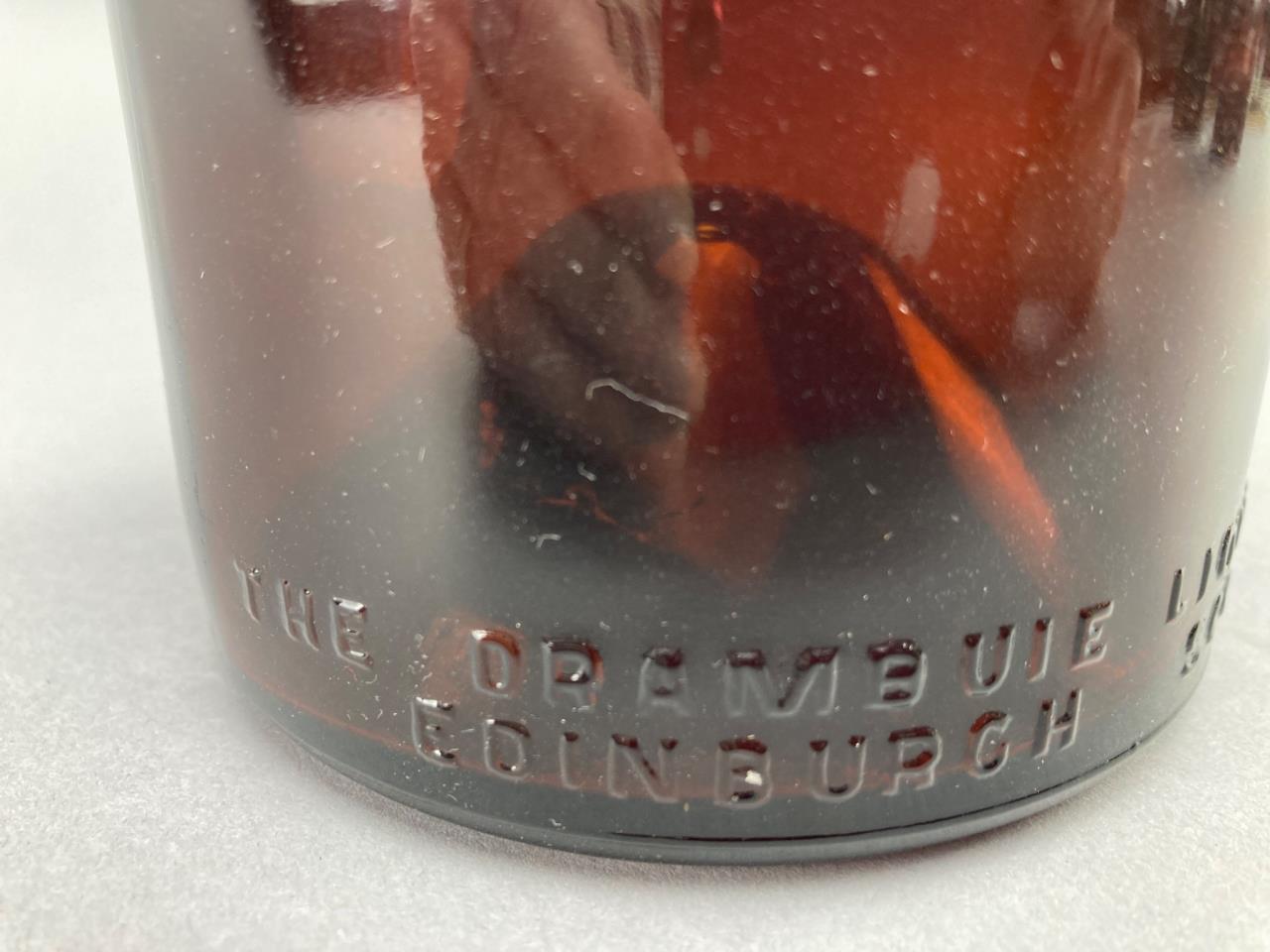Three embossed amber glass bottles featuring markings of “Drambuie Liqueur Co. Ltd Scotland,” “Benedictine B and B,” and “The Duffey Malt Whiskey Company Rochester NY.” Distinct bases and mouths on each bottle.