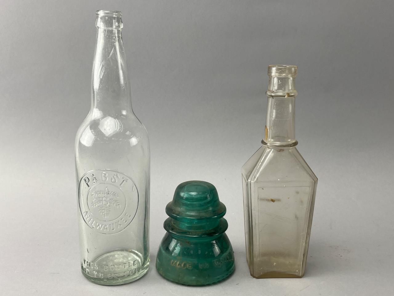 Three glass items including a clear embossed bottle marked ‘BABY PEARL,’ a clear glass bottle with a hexagonal body, and an aqua blue glass insulator embossed ‘M.C.CO.’ Visible imperfections include discoloration and residue.