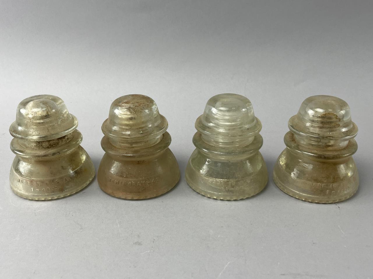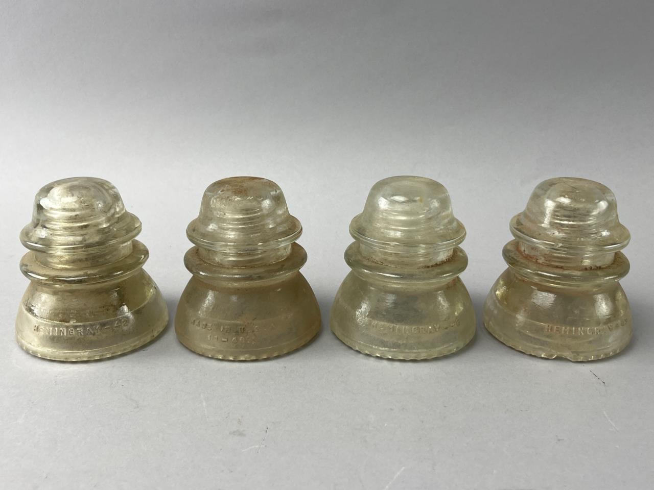 Four glass insulators embossed with ‘Hemingray’ markings. Varying shades of clear to light amber. Notable chip observed on one insulator. Suitable for collectors or industrial decor.