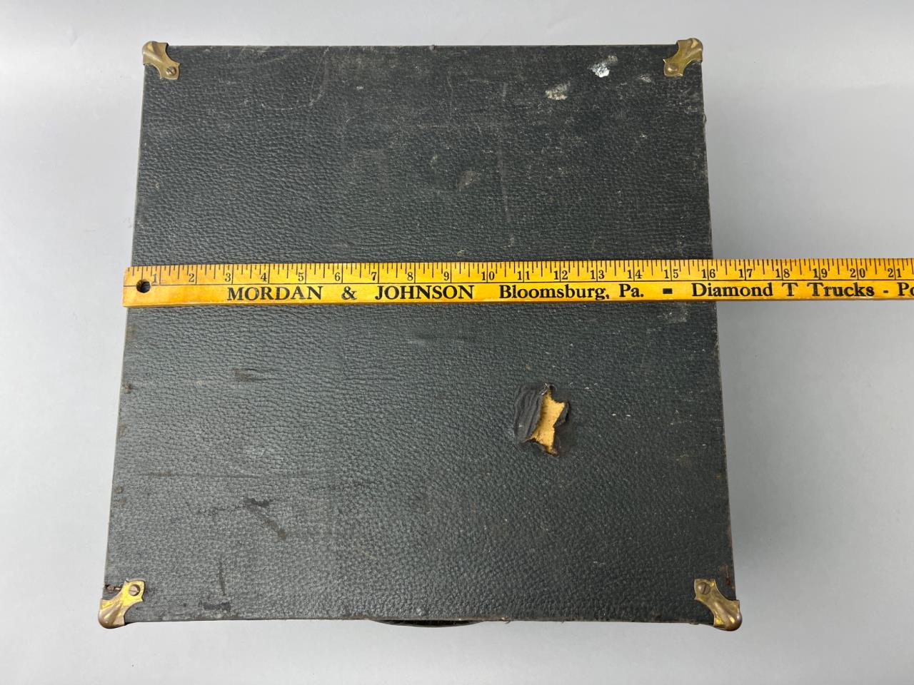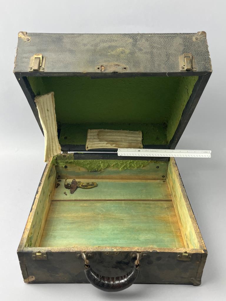 Black wooden storage box with metal reinforcements on corners and a leather handle. Features a hinged lid and metal latches. Interior includes green lining with some loose material. Visible wear and damage on surface and edges.