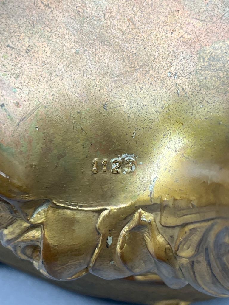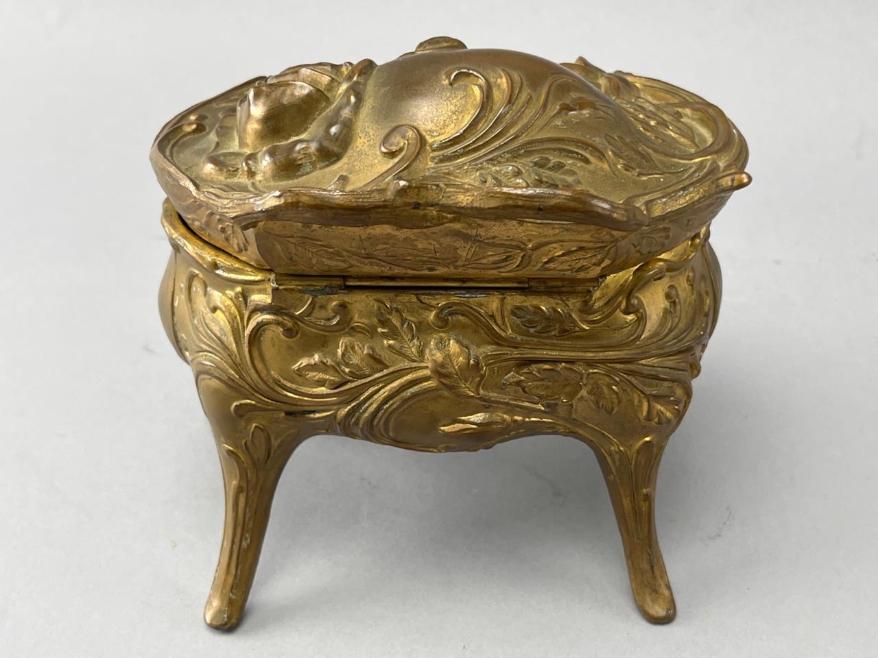 Gilt metal jewelry box with hinged lid featuring raised floral designs. Stands on four scrolled legs. Interior shows wear with visible discoloration. Marked ‘1127’ on the base. Elegant decorative features throughout.