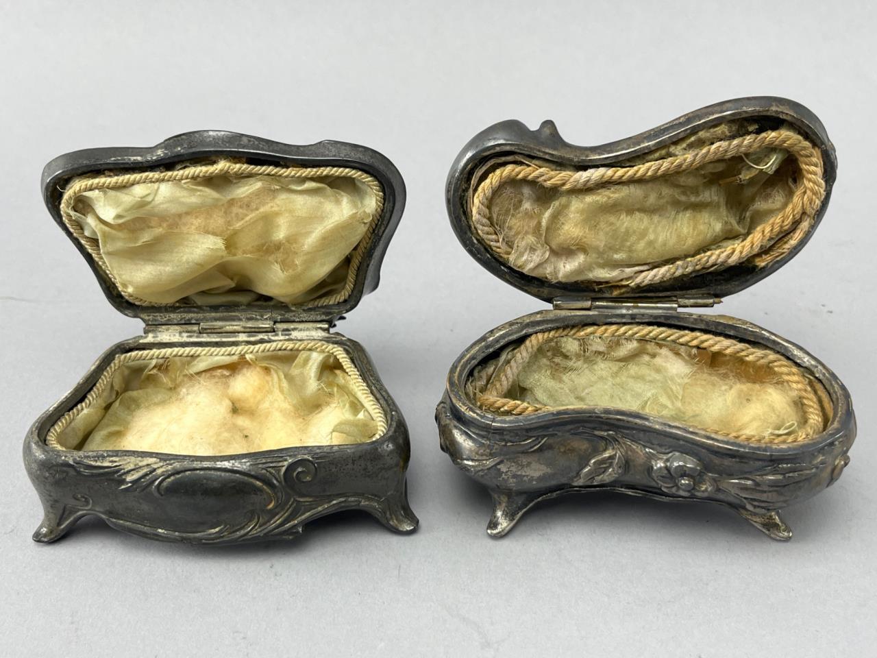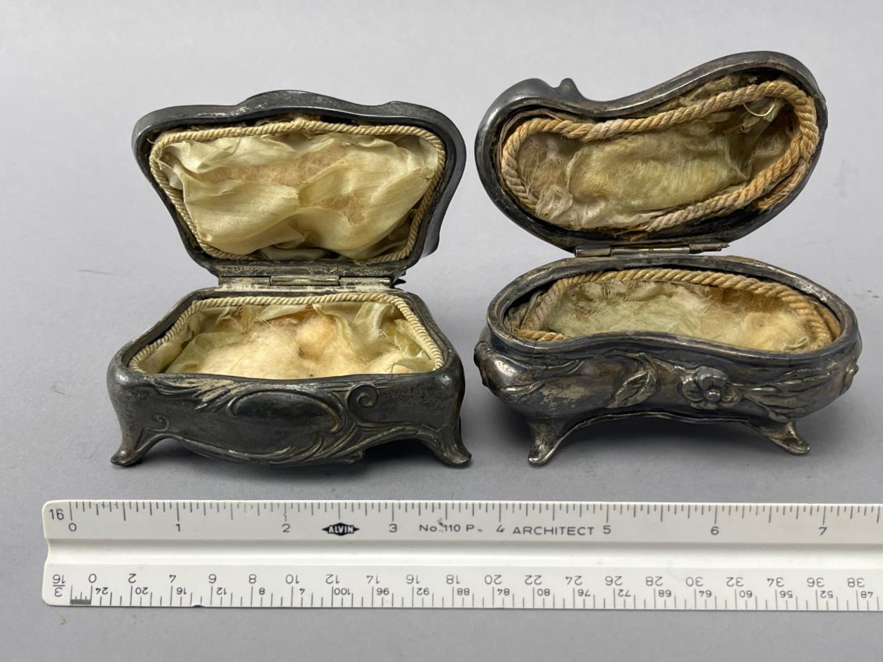 Two vintage silver-plated jewelry caskets with ornate floral motifs and hinged lids. Interiors are lined with worn fabric. One piece marked ‘NB Rogers S.P. Co,’ and the other marked ‘395.’ Both rest on decorative legs.