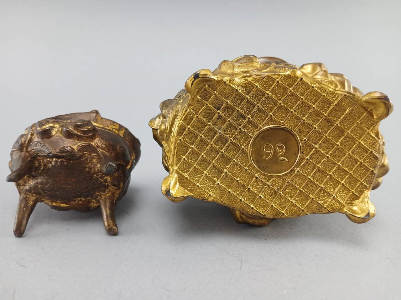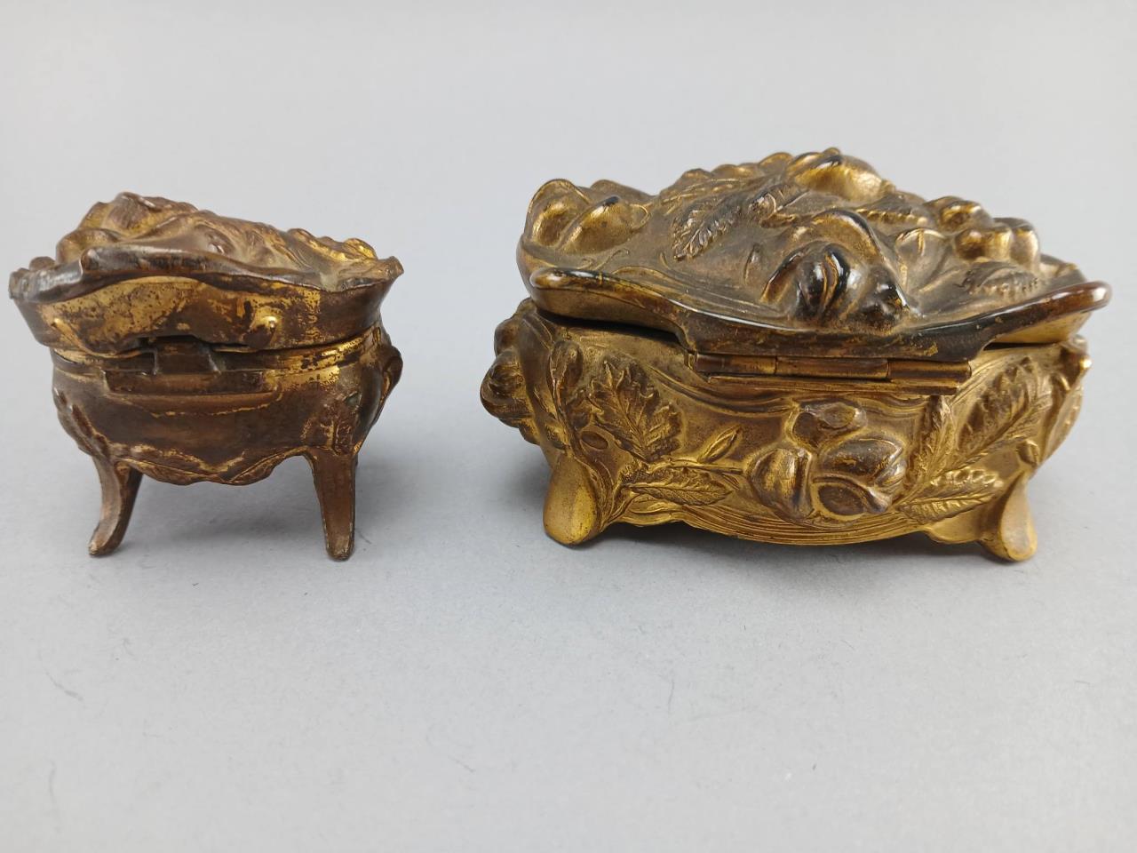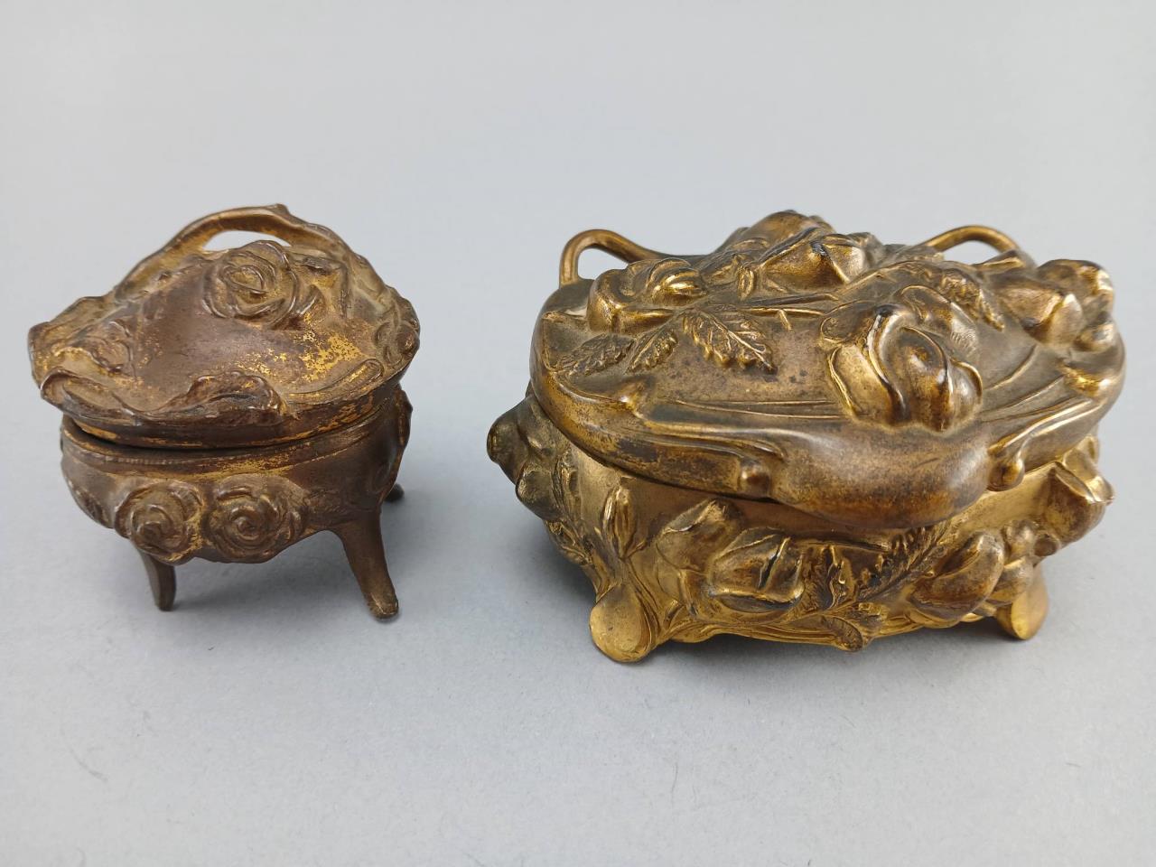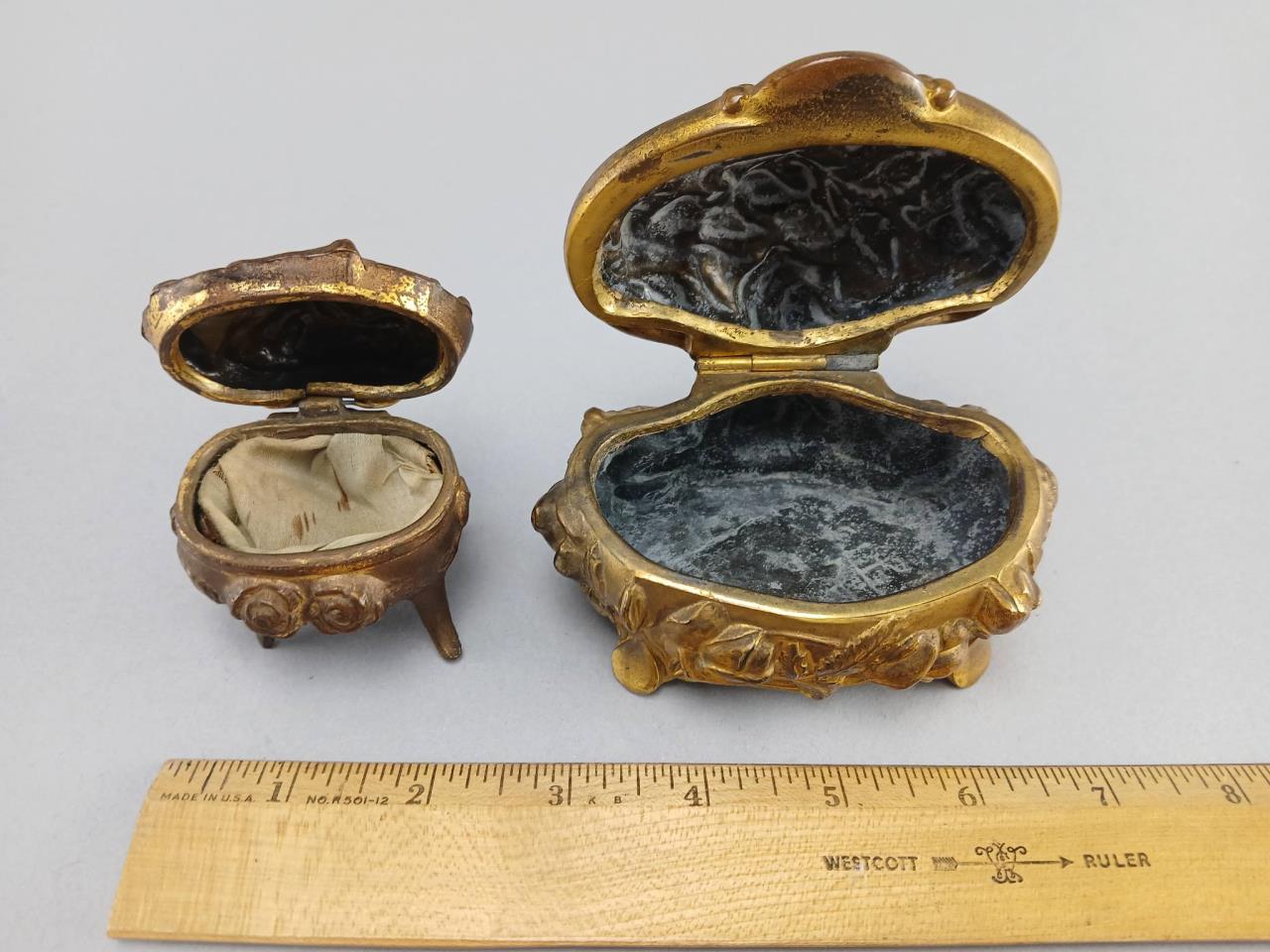 Two cast metal jewelry or trinket boxes with decorative floral motifs and hinged lids. Interiors are lined with fabric. Bases feature decorative designs, with one marked ’92.’ Notable patina on surfaces.