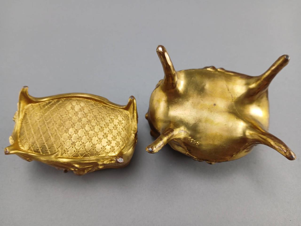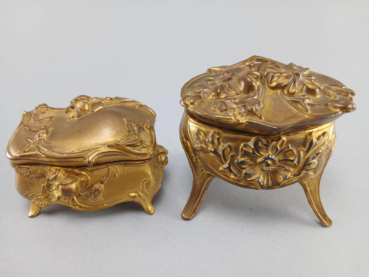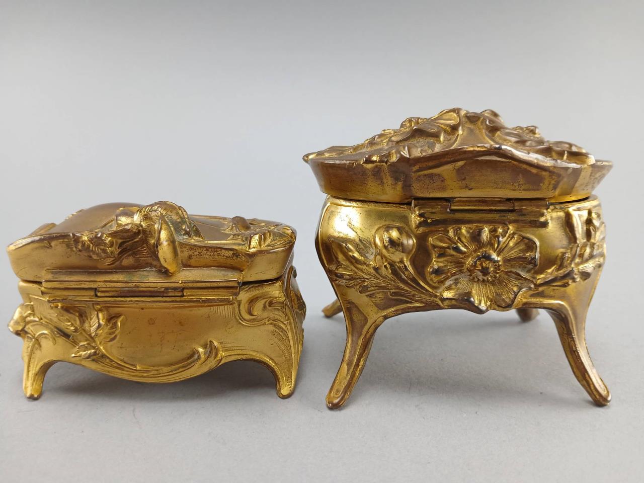 Two gilded metal jewelry caskets featuring ornate floral and scroll designs. Both have hinged lids, interior fabric linings, and raised footed bases. Notable wear and some fabric fraying inside. Taller casket has 1139 marked on the bottom.