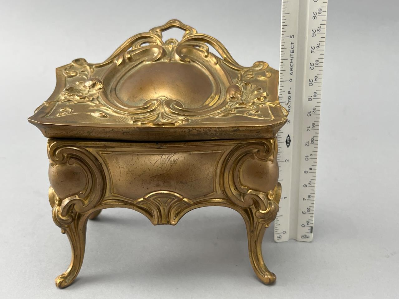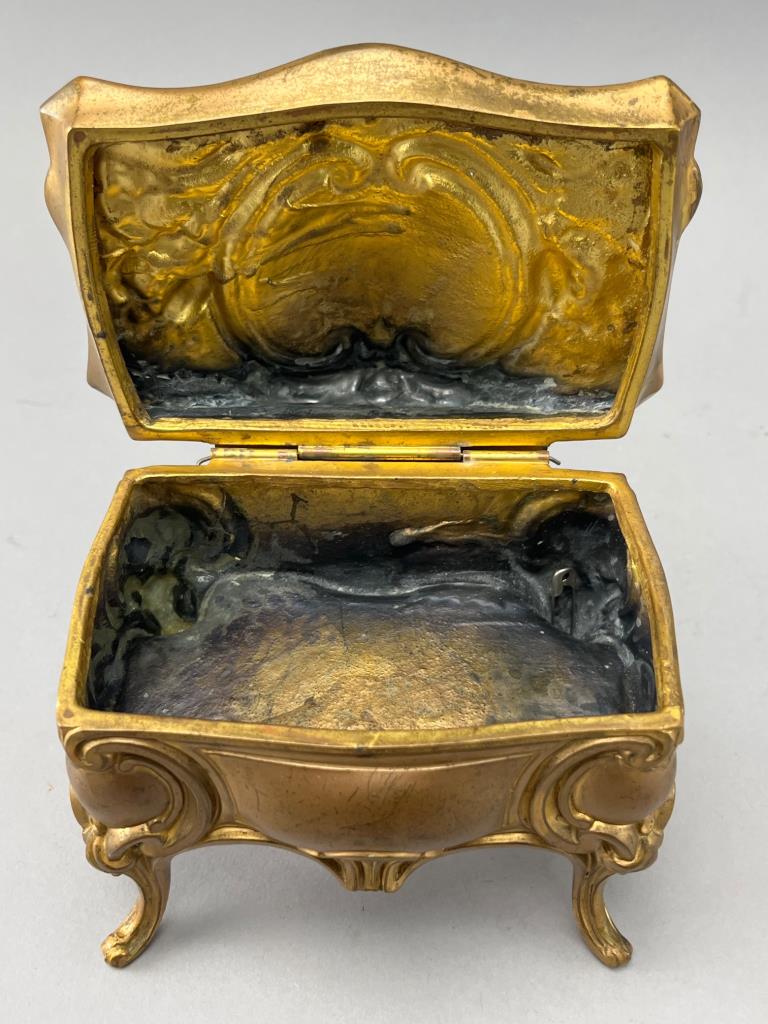 Ornate gilt metal jewelry casket featuring raised floral and scrollwork designs. Hinged lid opens to reveal an interior with a worn finish. Raised on four curved legs. Visible patina and surface wear present.