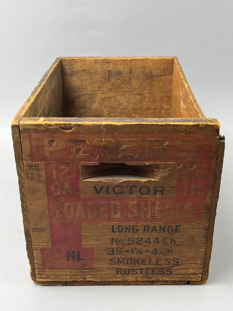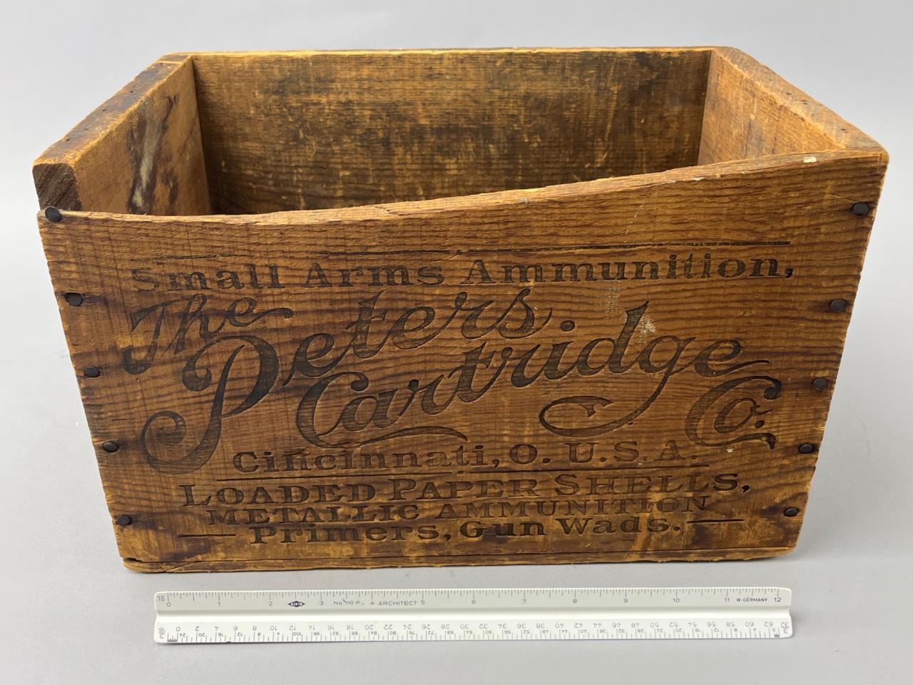 A wooden ammunition box featuring engraved text for Small Arms Ammunition by The Peters Cartridge Co. with branding and long-range loaded shells details on multiple sides. Age-related wear noted.