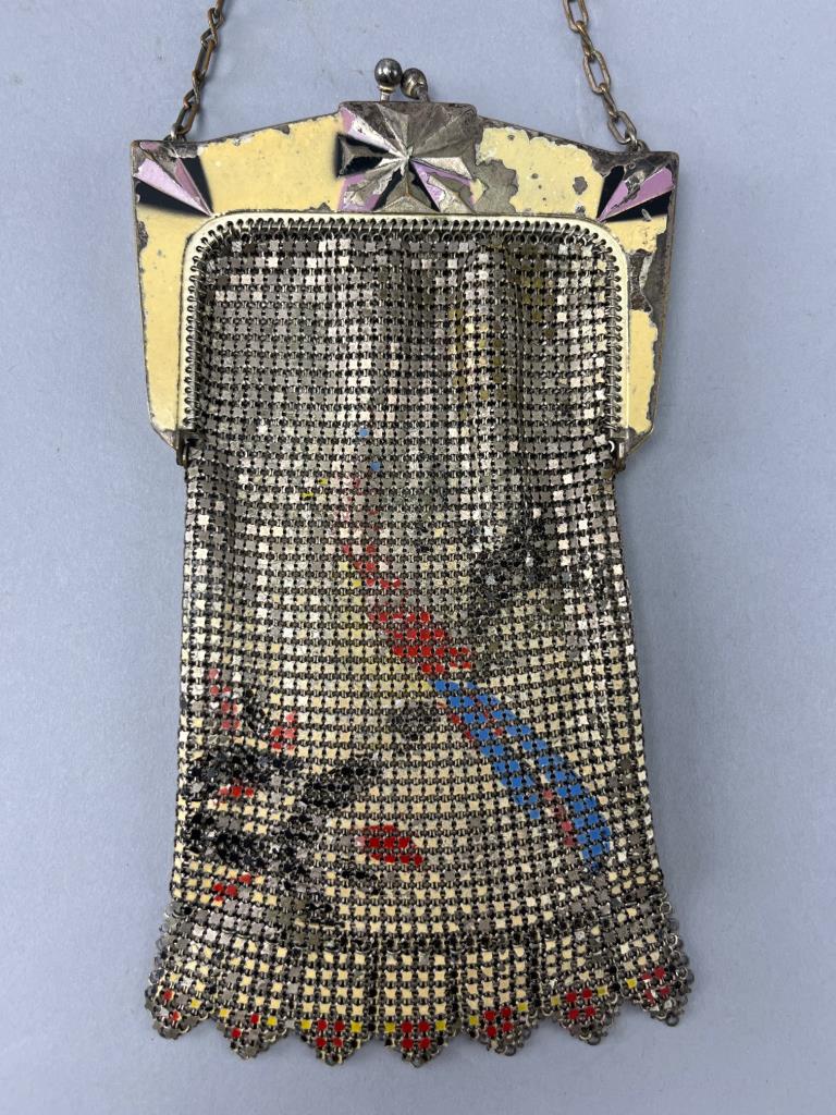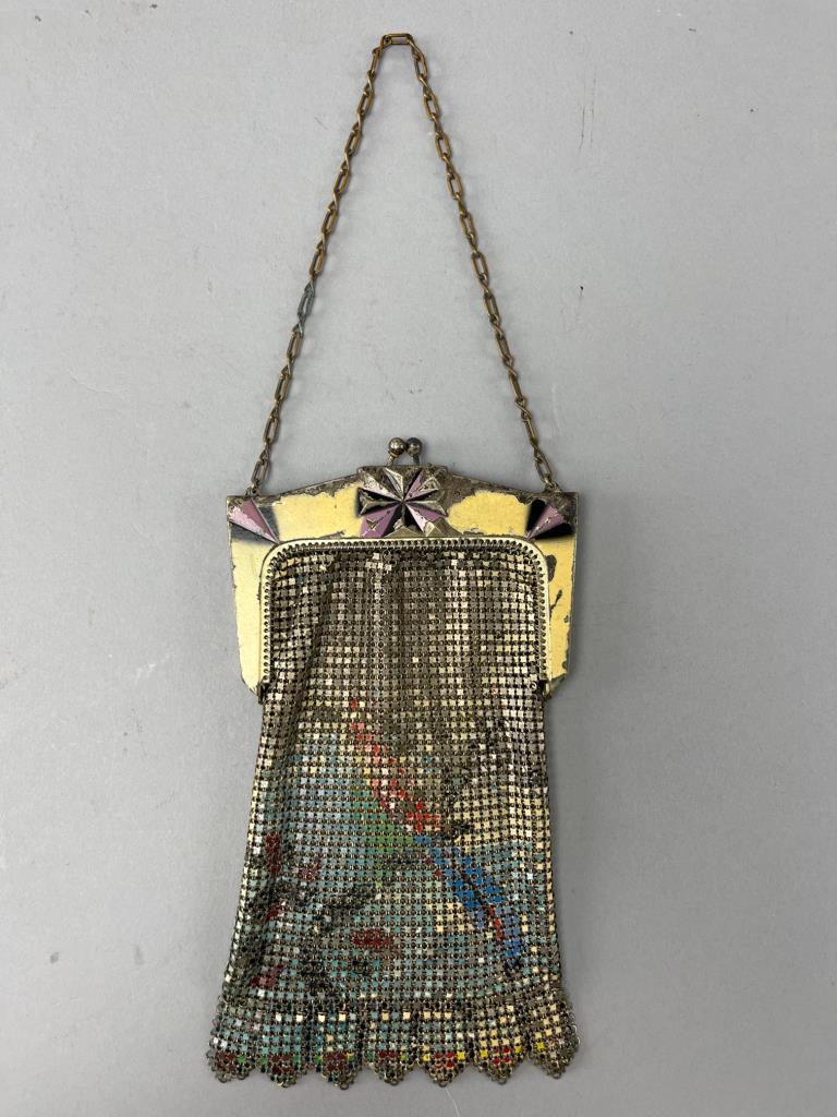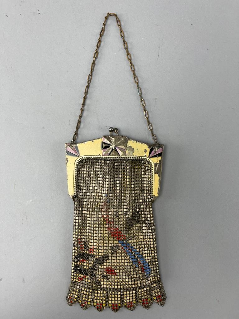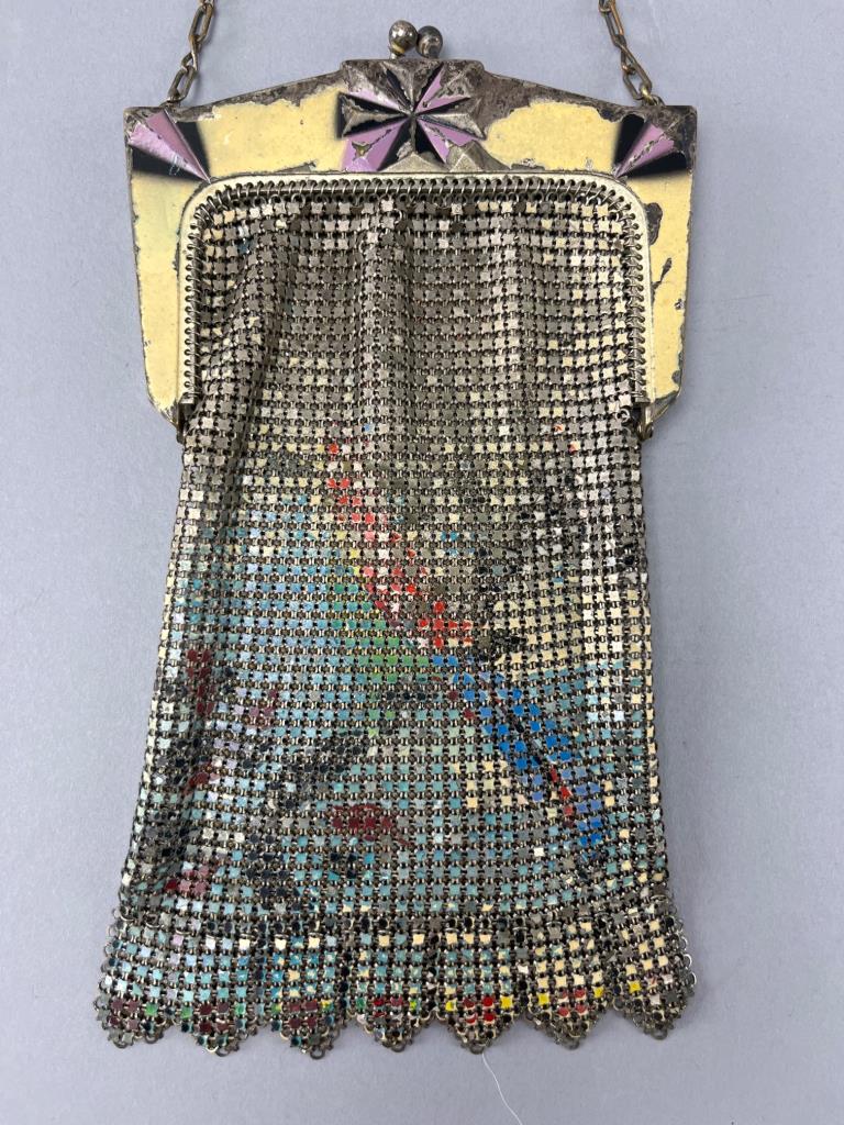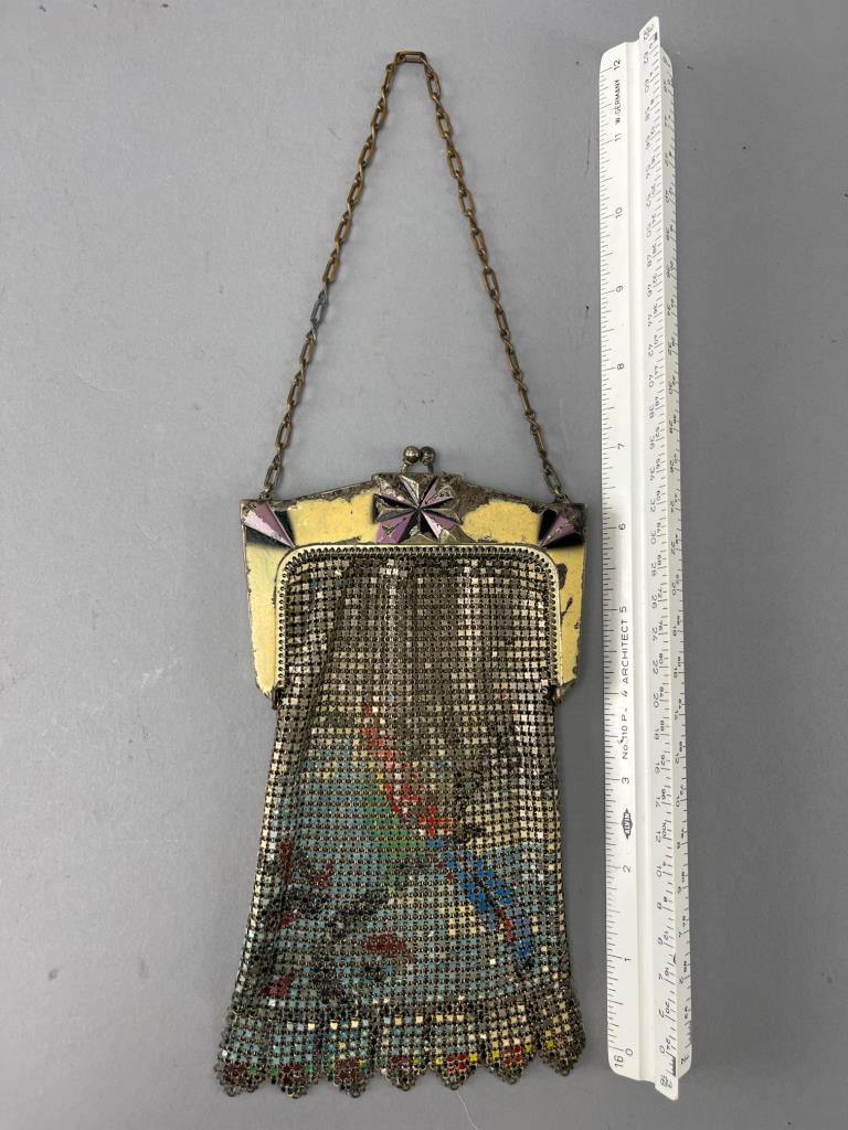 Metal mesh handbag featuring an ornate yellow frame with pink accents and floral paintings on the mesh exterior. Includes a chain handle and scalloped edge detailing. Visible paint wear on the frame.