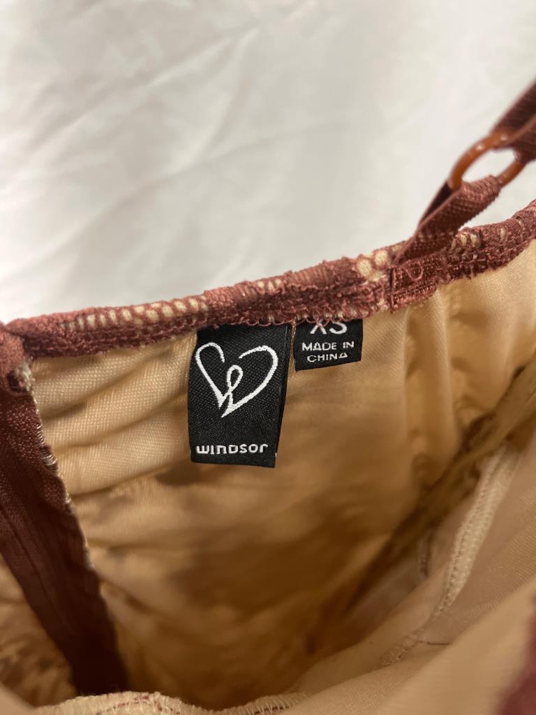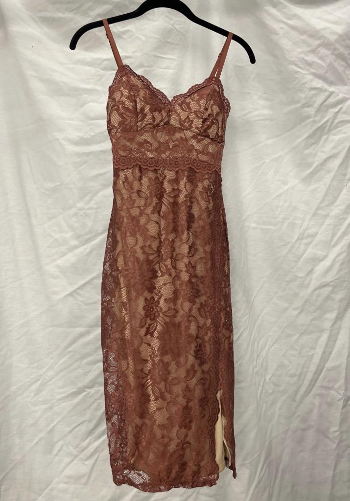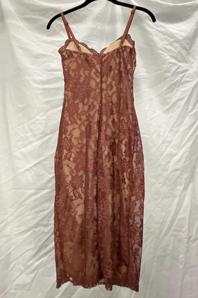 Mauve lace overlay dress with adjustable spaghetti straps and sweetheart neckline. Features a nude lining and back zip closure. Manufactured by Windsor and marked size XS. Hanger not included.