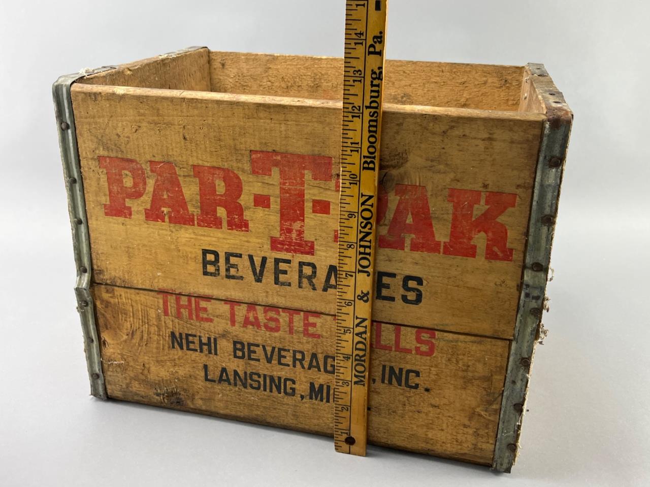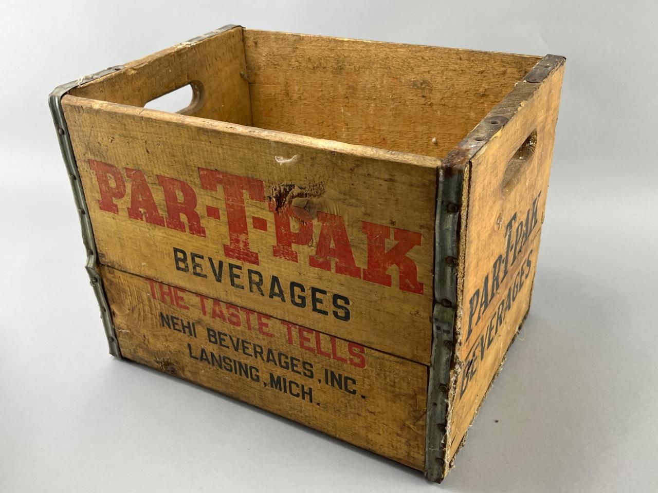 Wooden beverage crate with printed lettering advertising Par-T-Pak Beverages by Nehi Beverages, Inc., Lansing, Mich. Features metal band reinforcements and cutout handles. Visible surface wear consistent with use and age.
