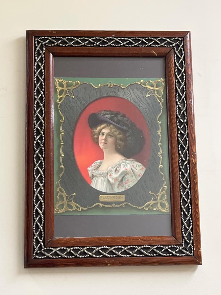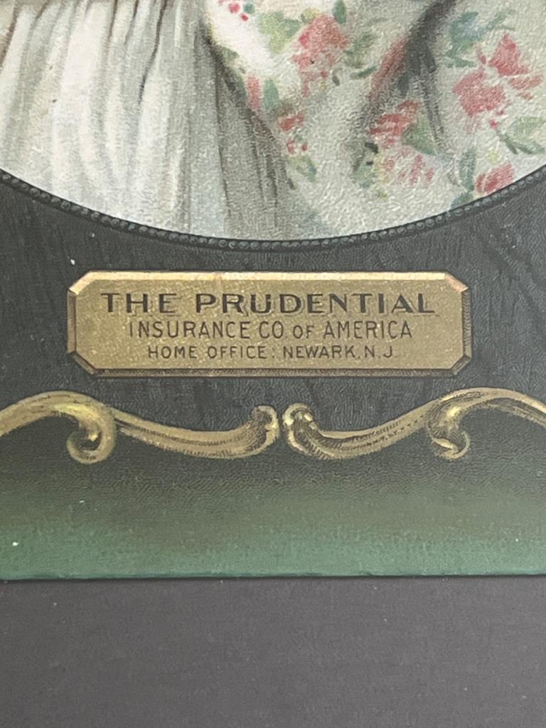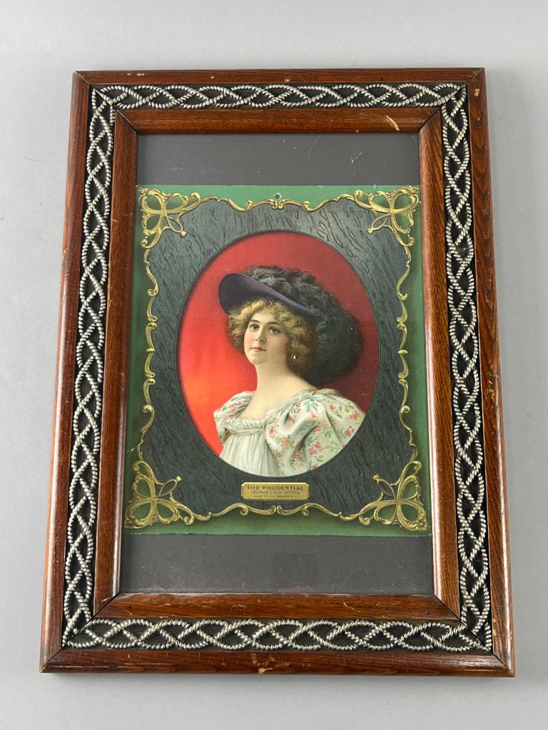 Framed lithograph-style portrait featuring a woman in a floral dress and hat, set against a red background. Includes an engraved plaque reading ‘The Prudential Insurance Co. of America, Home Office Newark, N.J.’ Frame features decorative trim detail.