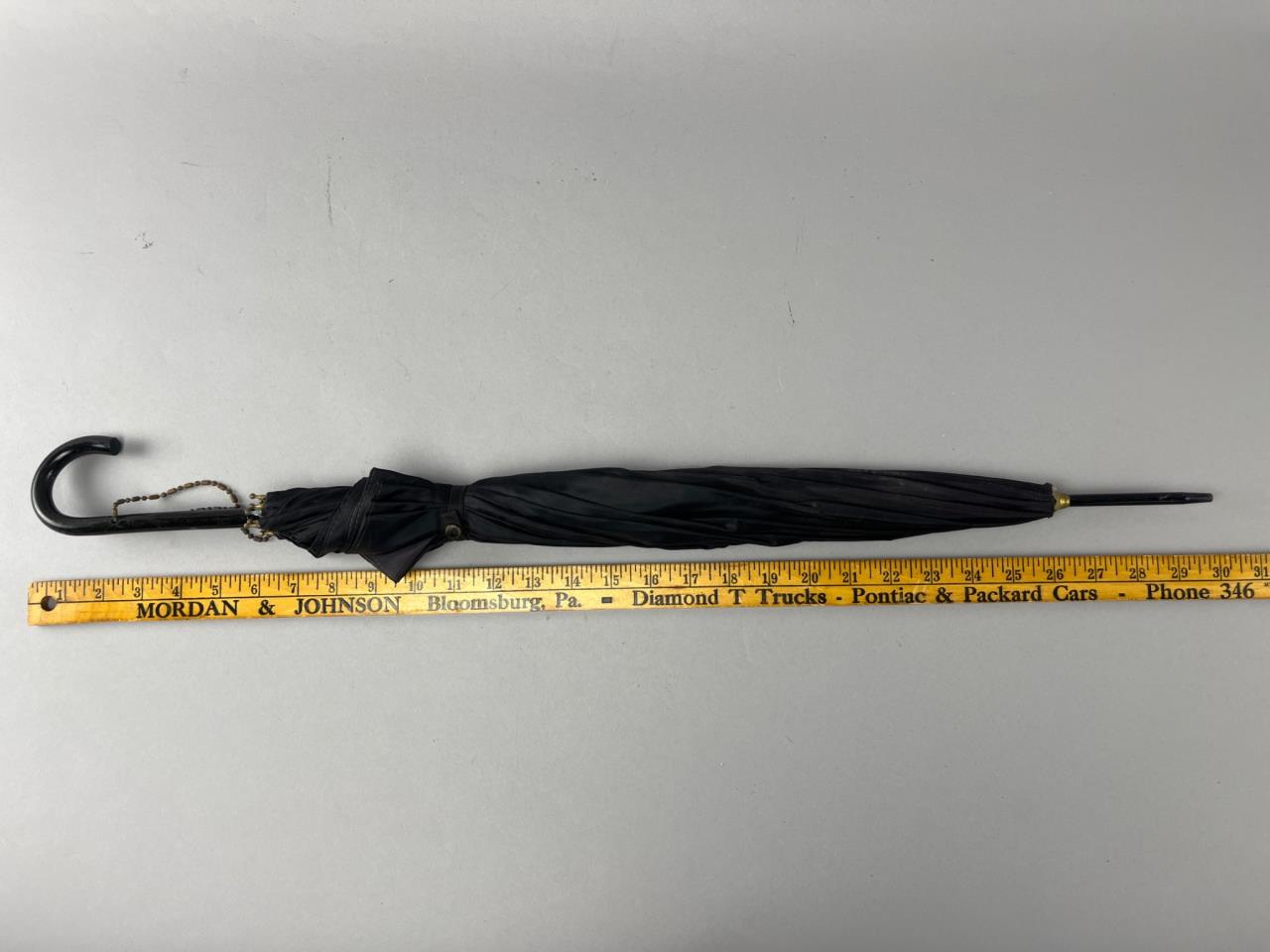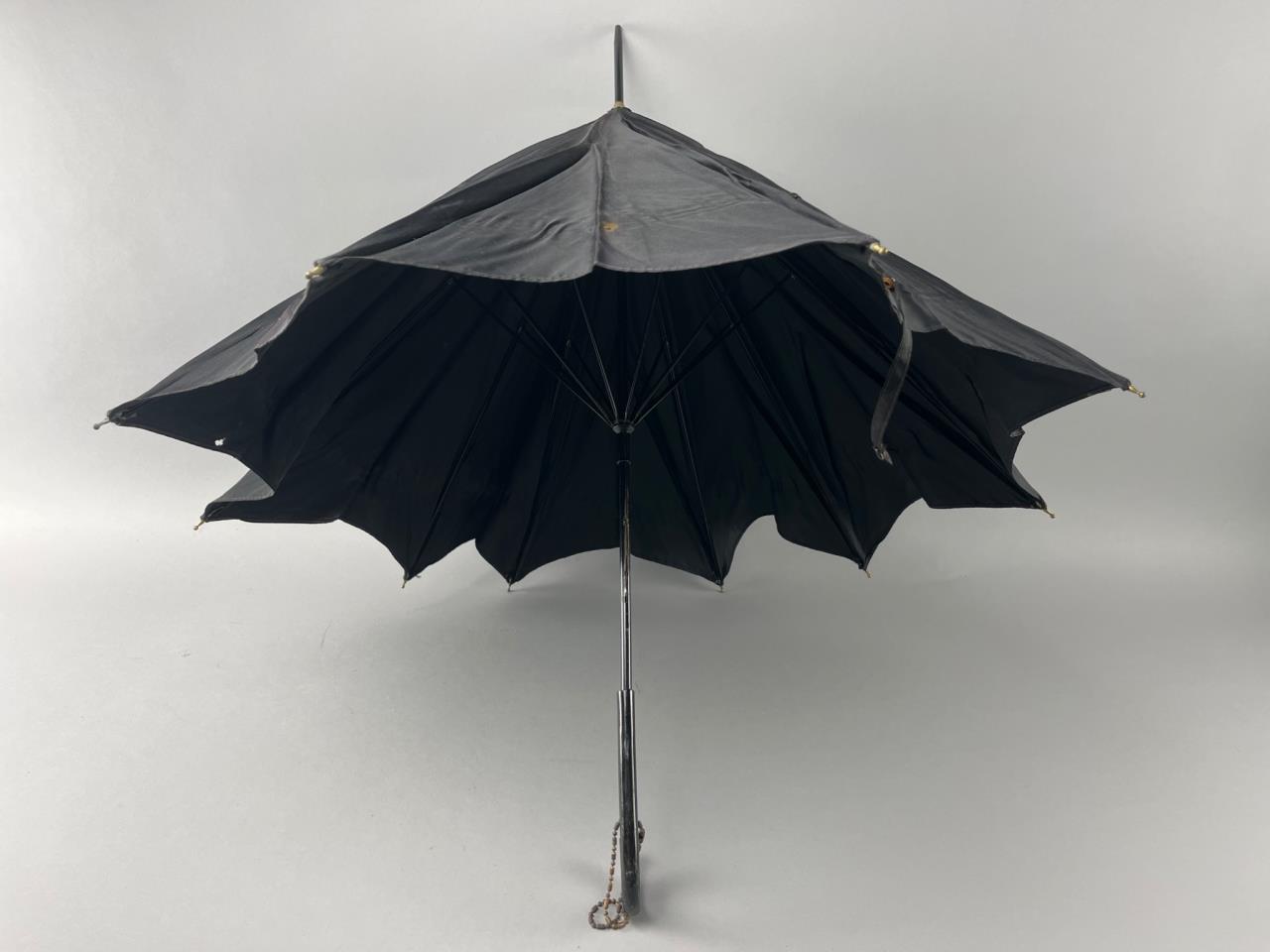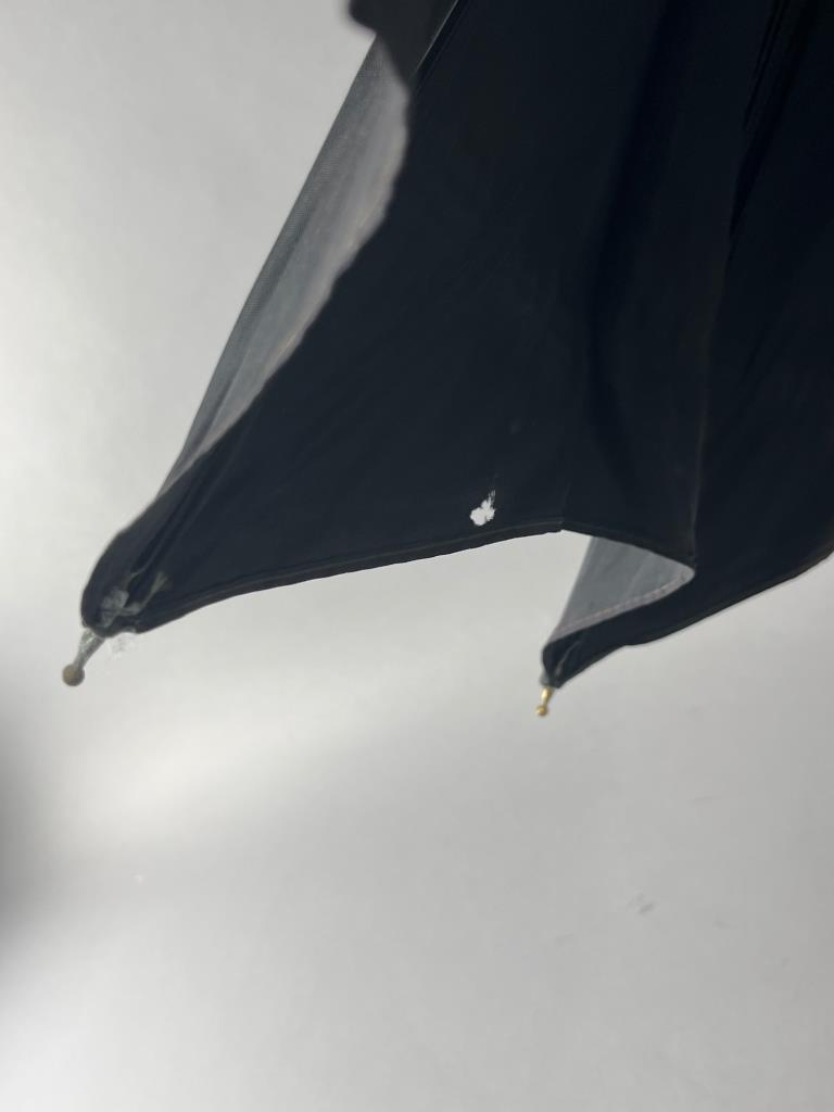 Black umbrella featuring a distinctive batwing canopy design. Includes a hooked handle and metal tip. Visible tear on the edge of the canopy. Chain attachment included.