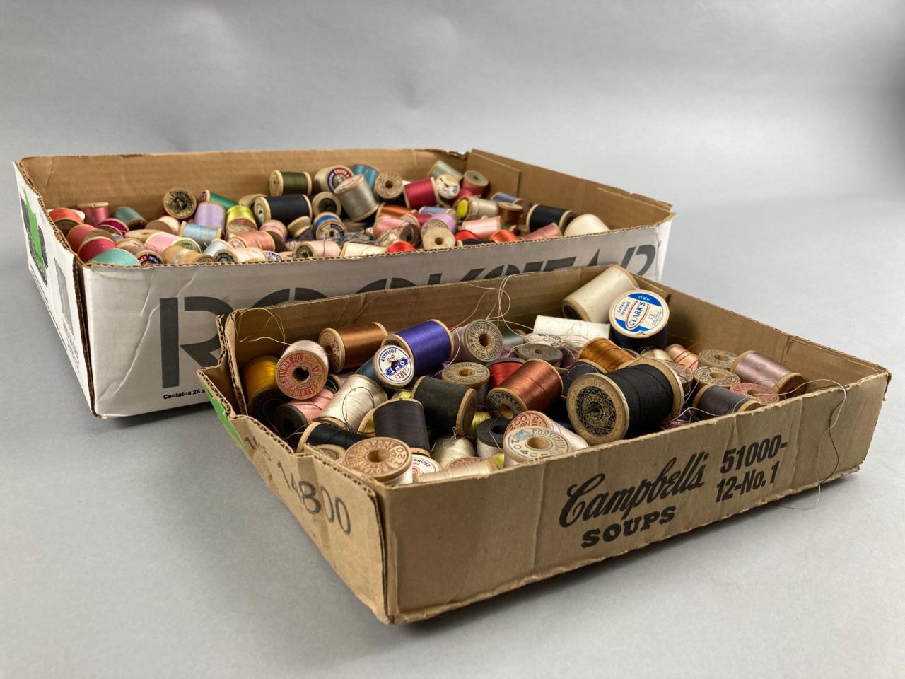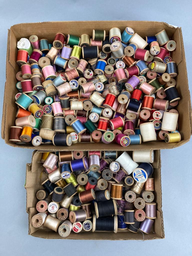 Two boxes containing a mixed assortment of sewing thread spools in various colors and materials. Includes wooden and plastic spool bases with a variety of thread types.