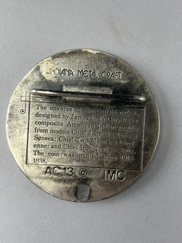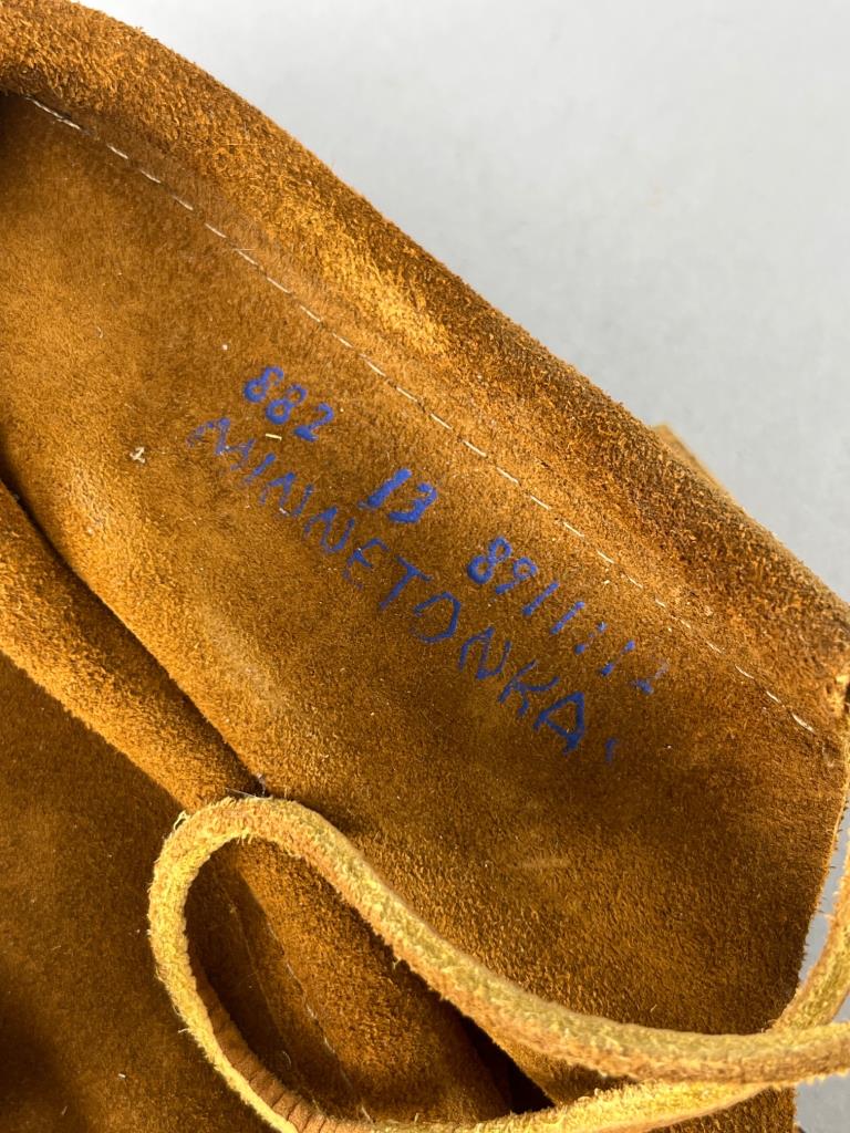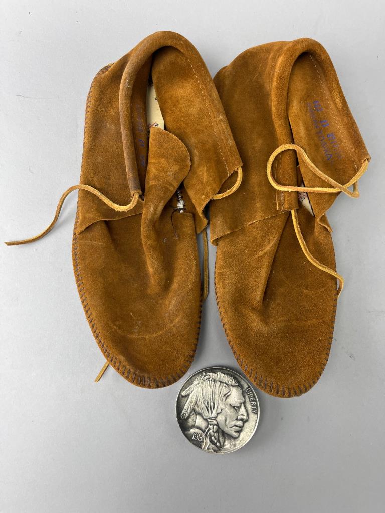 Brown suede Minnetonka moccasins with lace ties. Includes a round metal pin by Indiana Metal Craft, featuring Buffalo Nickel design details. Props not included.