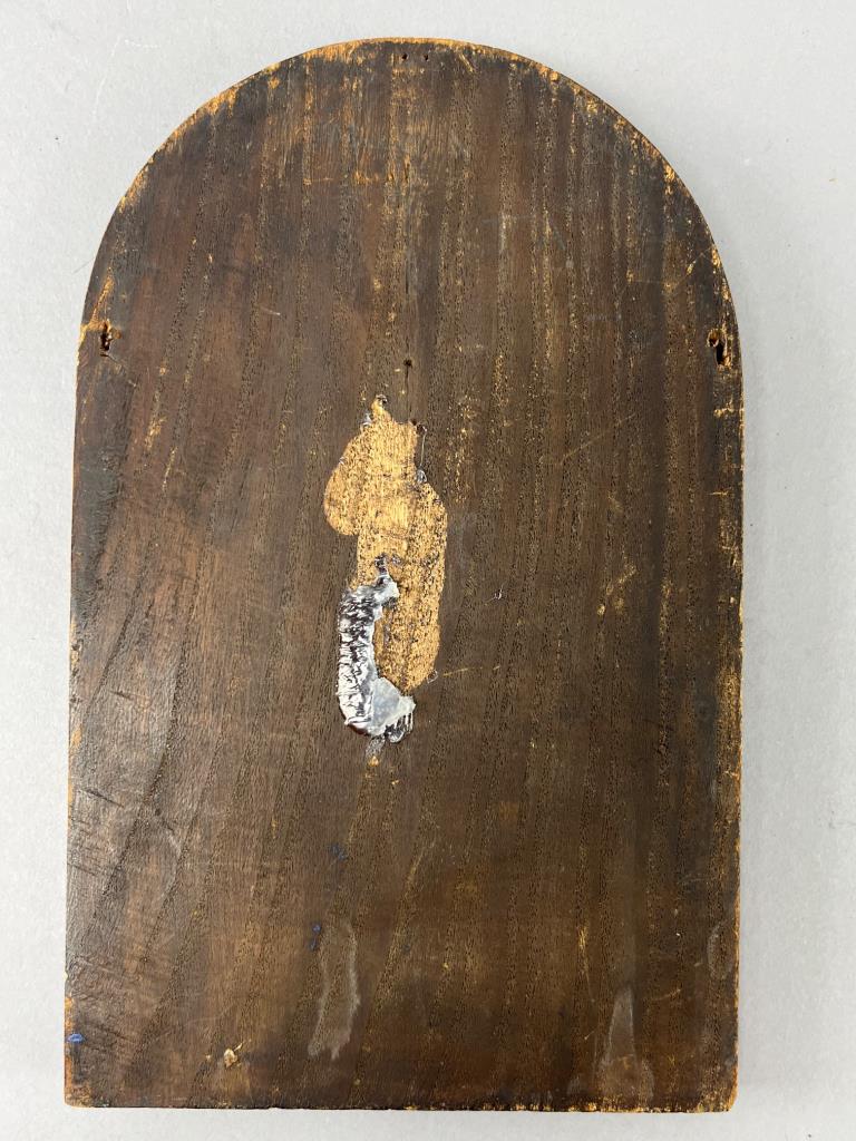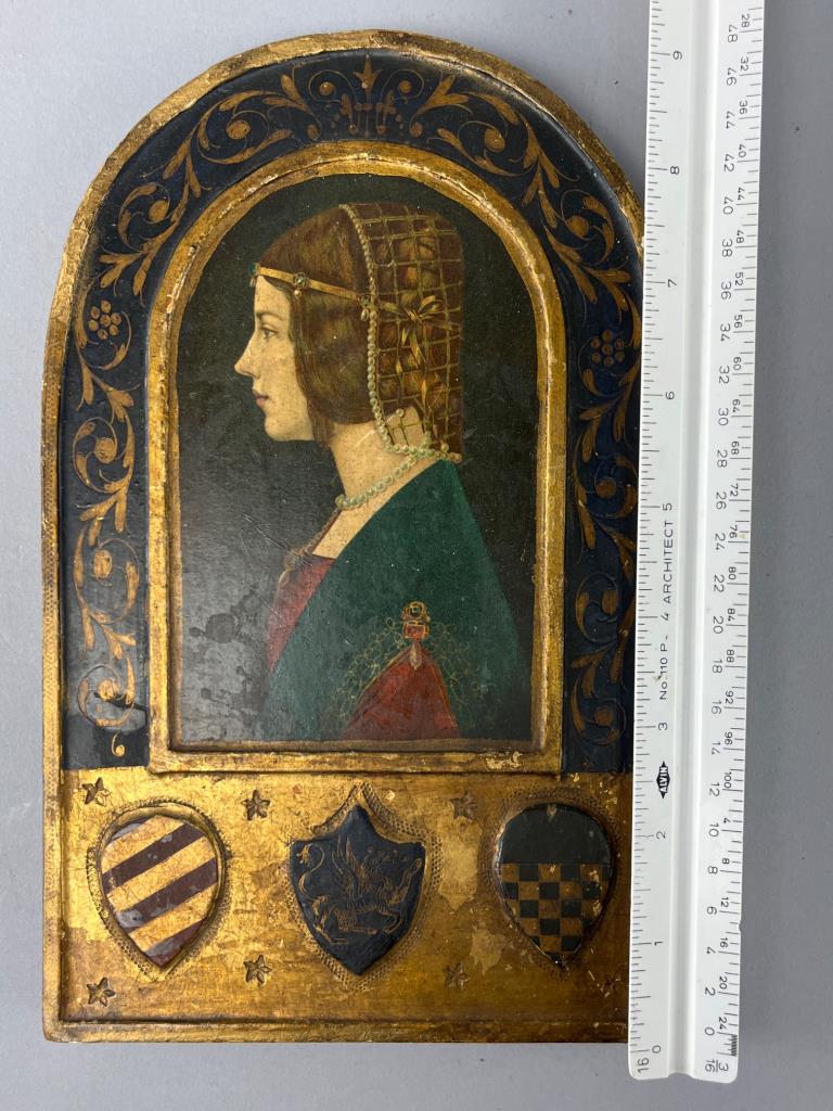 Early 1900’s copy of Leonardo da Vinci’s portrait of Beatrice d’Este. Features three heraldic shields below and ornate decorative details. Visible wear and loss of paint on the reverse.