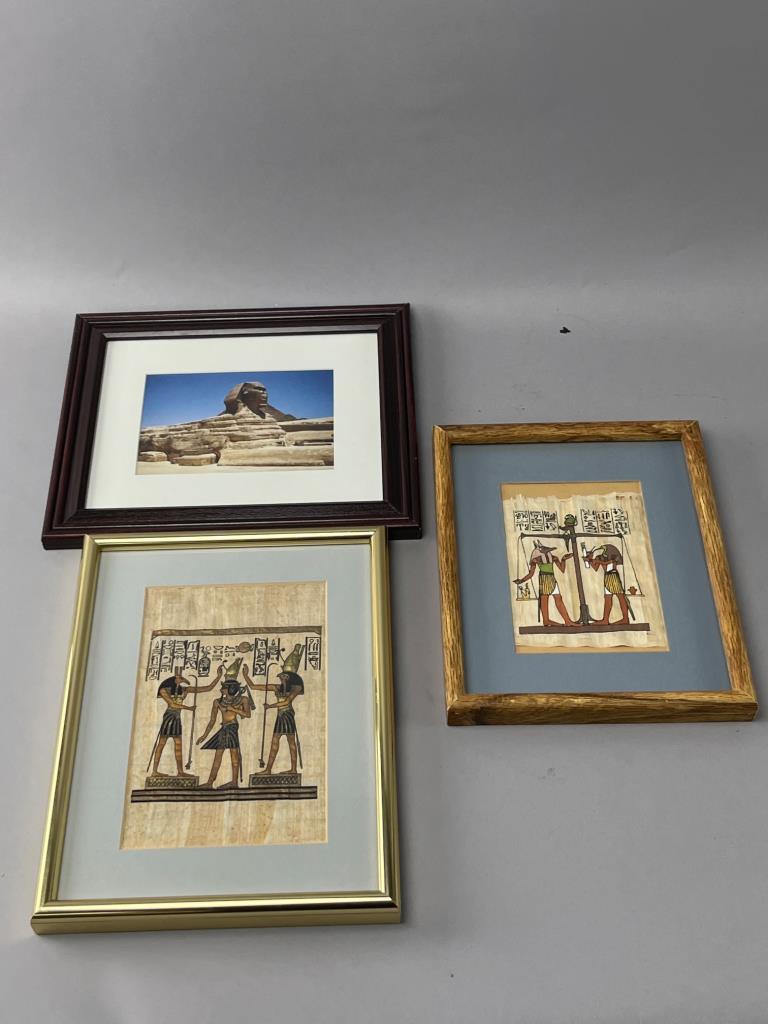 Three framed items featuring Egyptian-themed artwork. Includes two prints on papyrus and one photograph of the Sphinx. Frames vary in materials and colors.