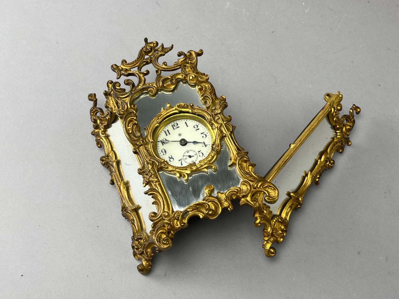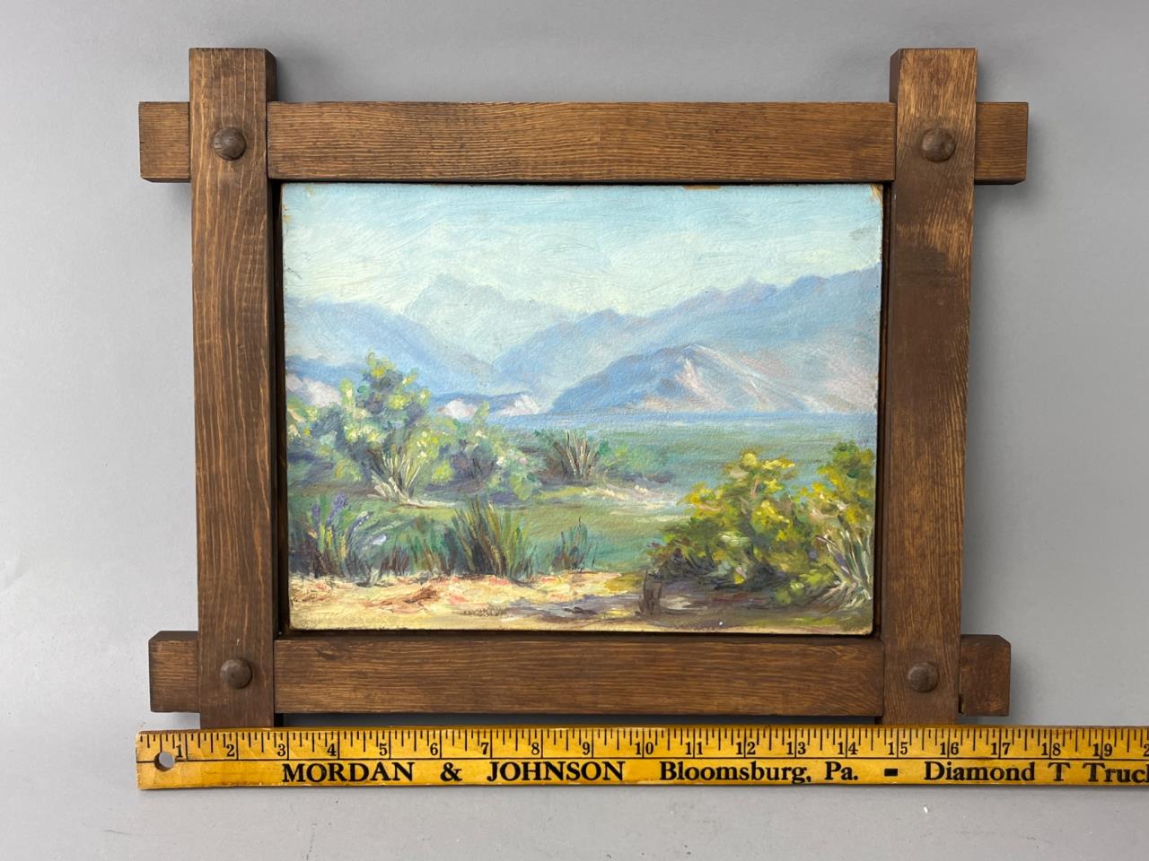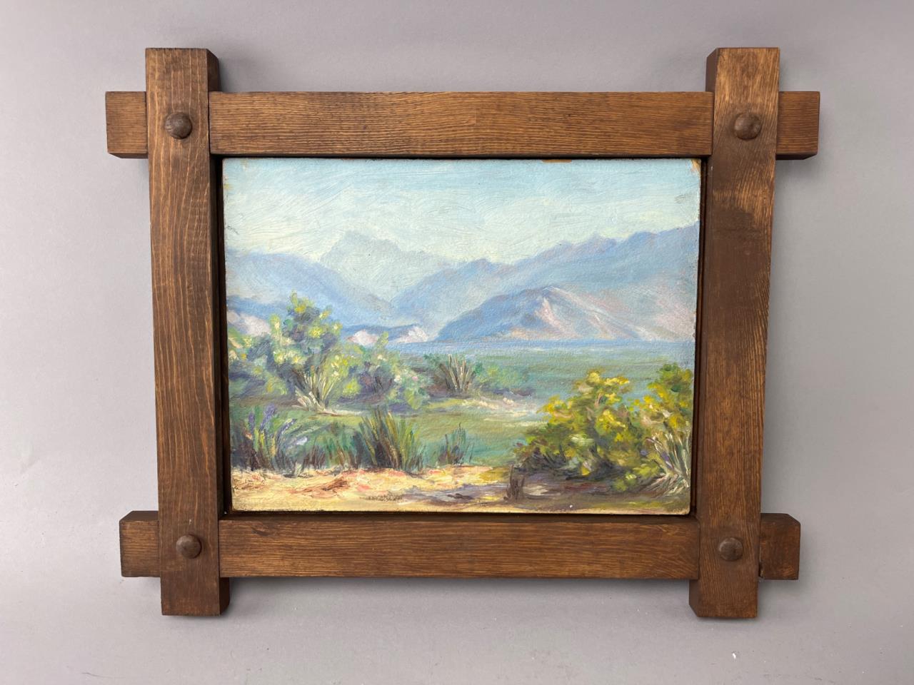 Oil painting of a serene landscape with mountains and vegetation, framed in rustic wood with metal accents. Includes a gilded ornate brass vanity clock with mirrored side panels. Props not included.