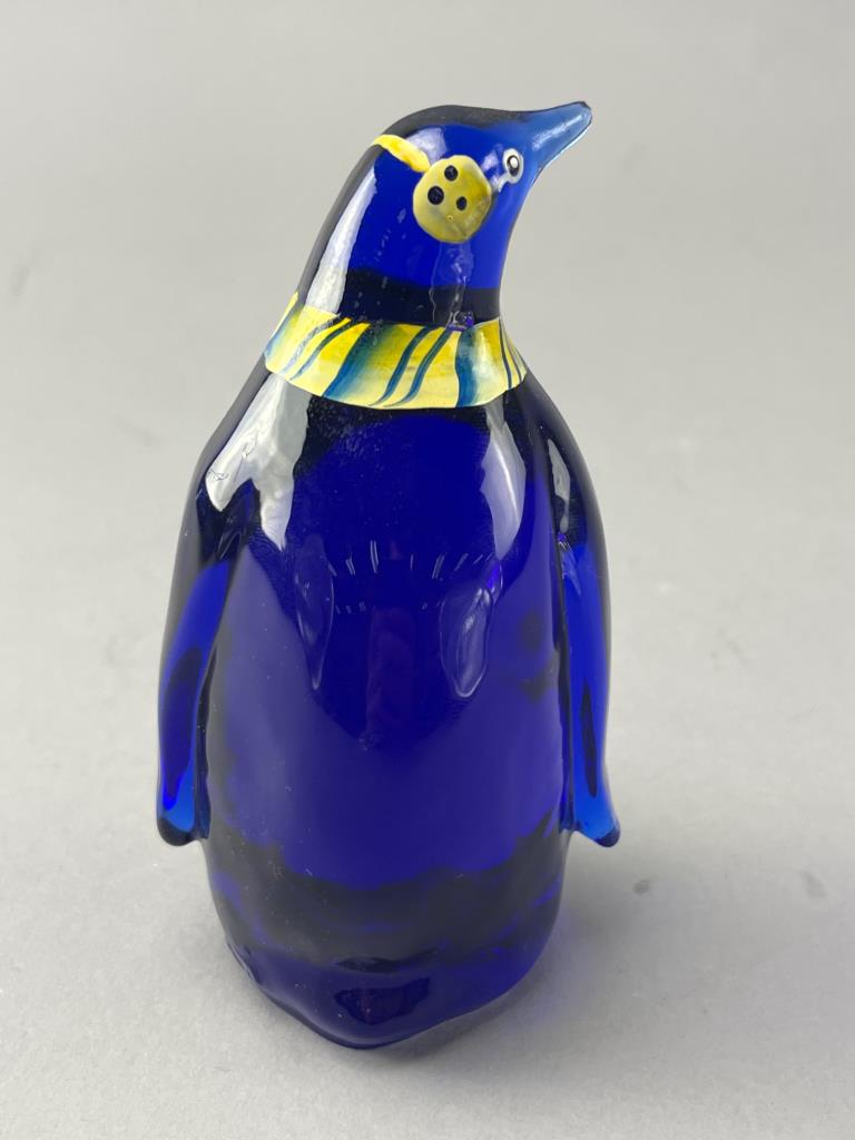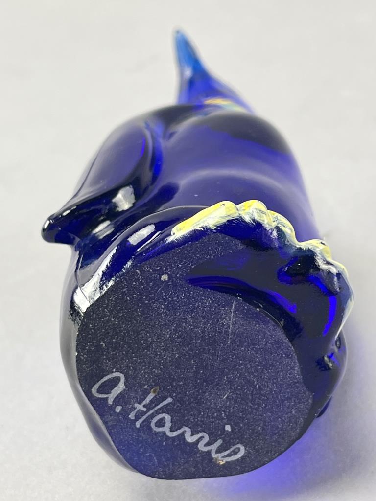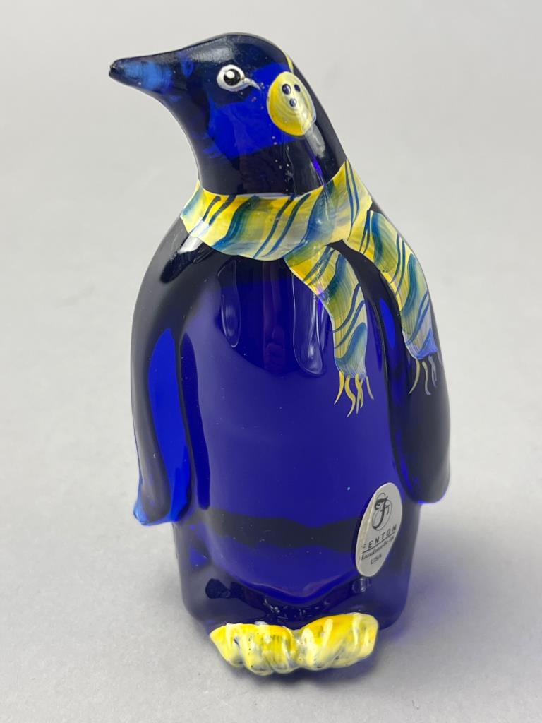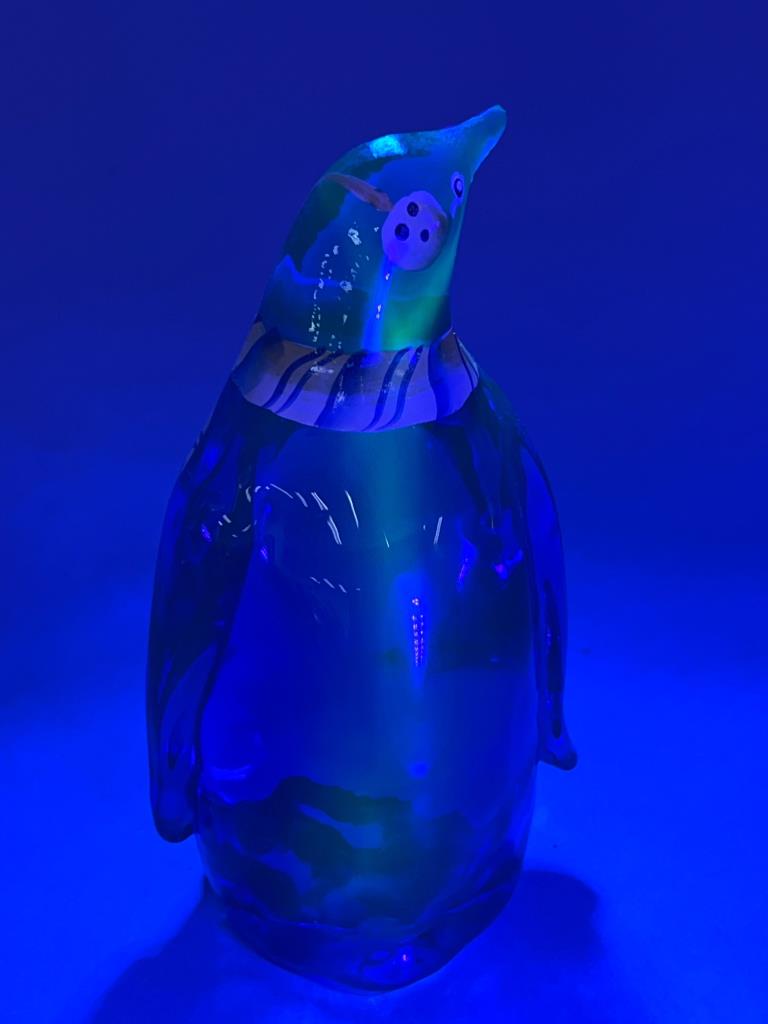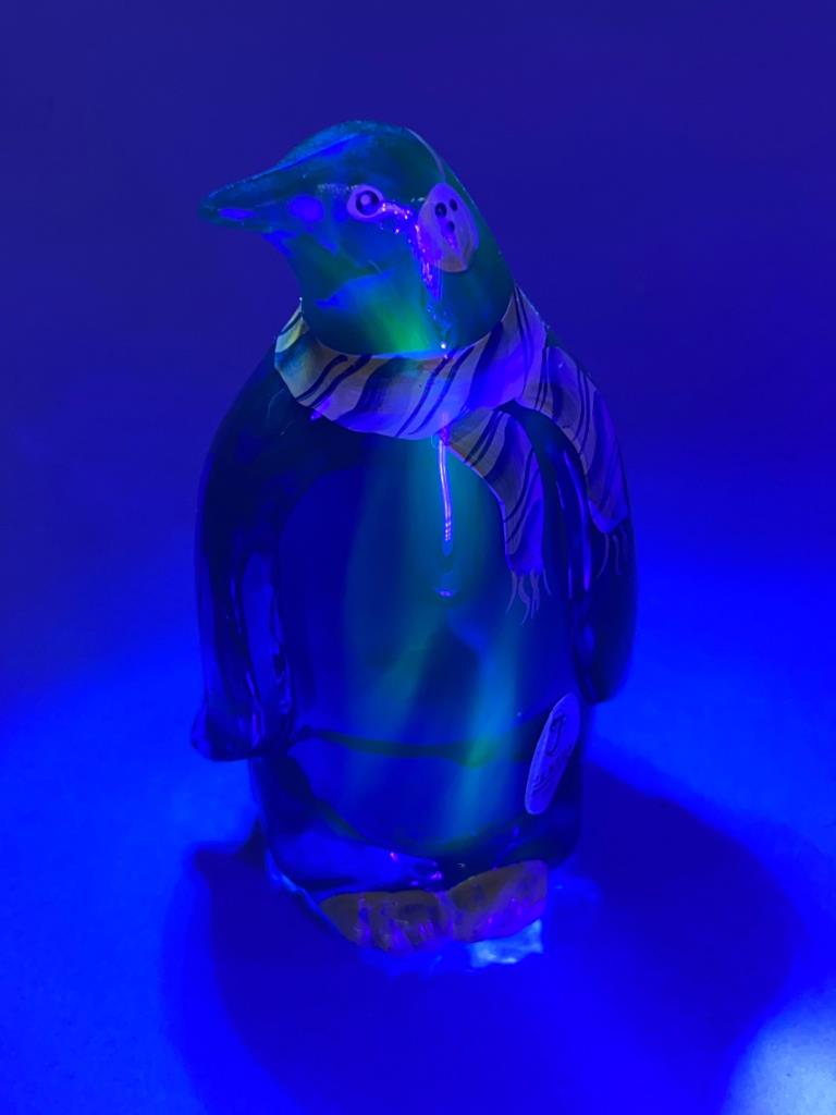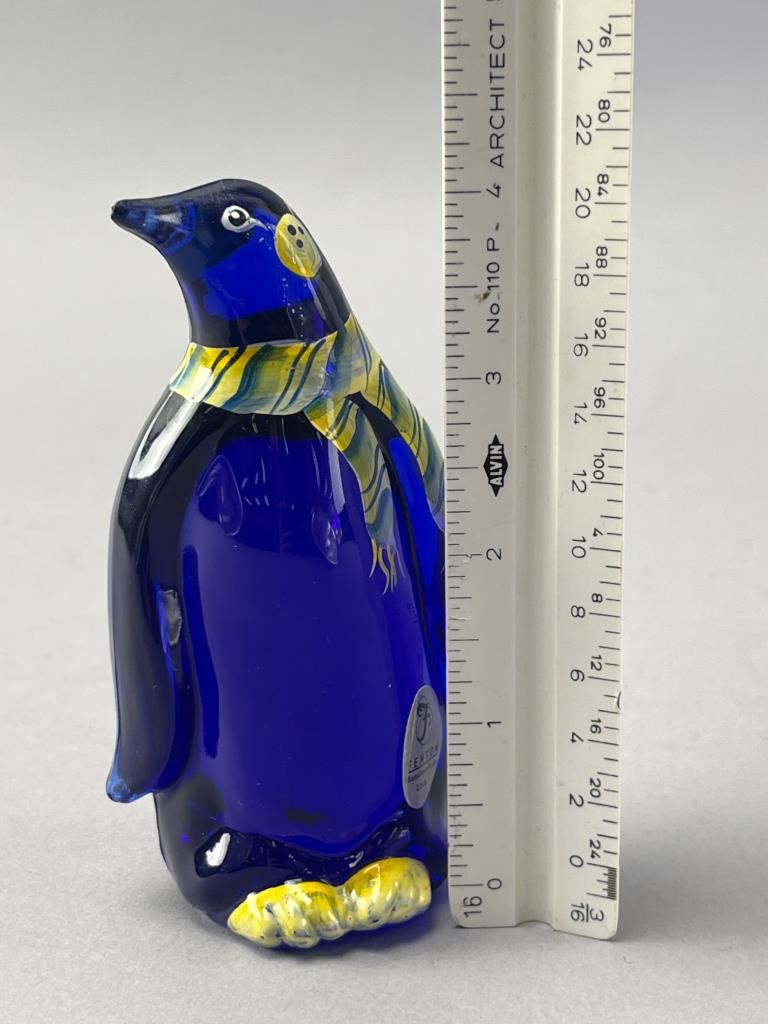Fenton cobalt blue glass penguin figurine featuring hand-painted details, including a striped scarf. Signed ‘A. Harris’ on the base and retains the Fenton sticker. UV-reactive glass enhances the vibrant color under black light.