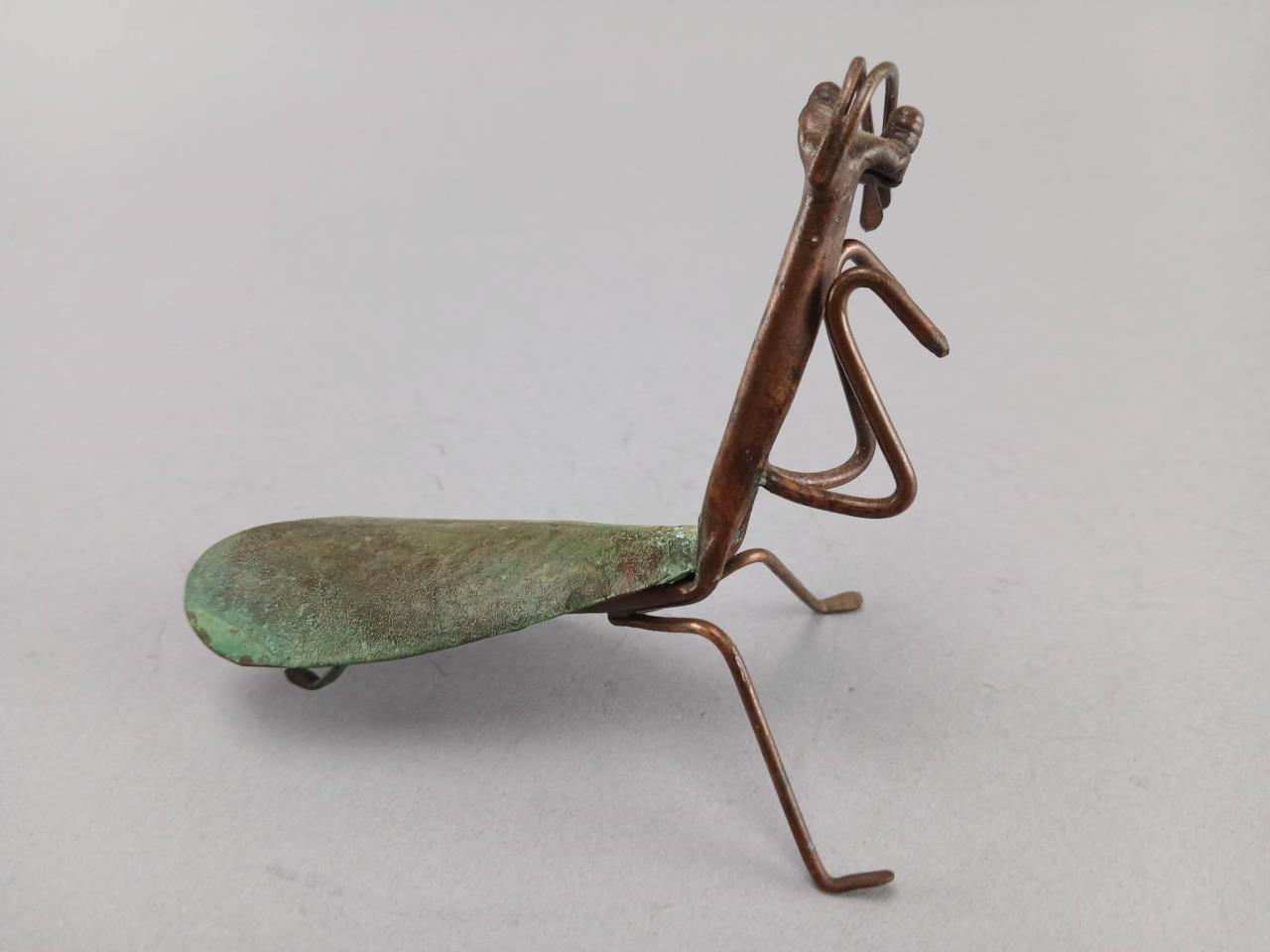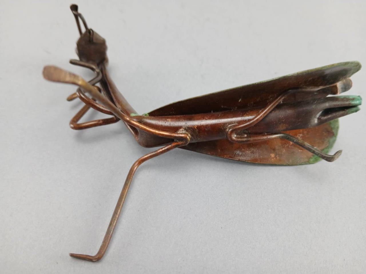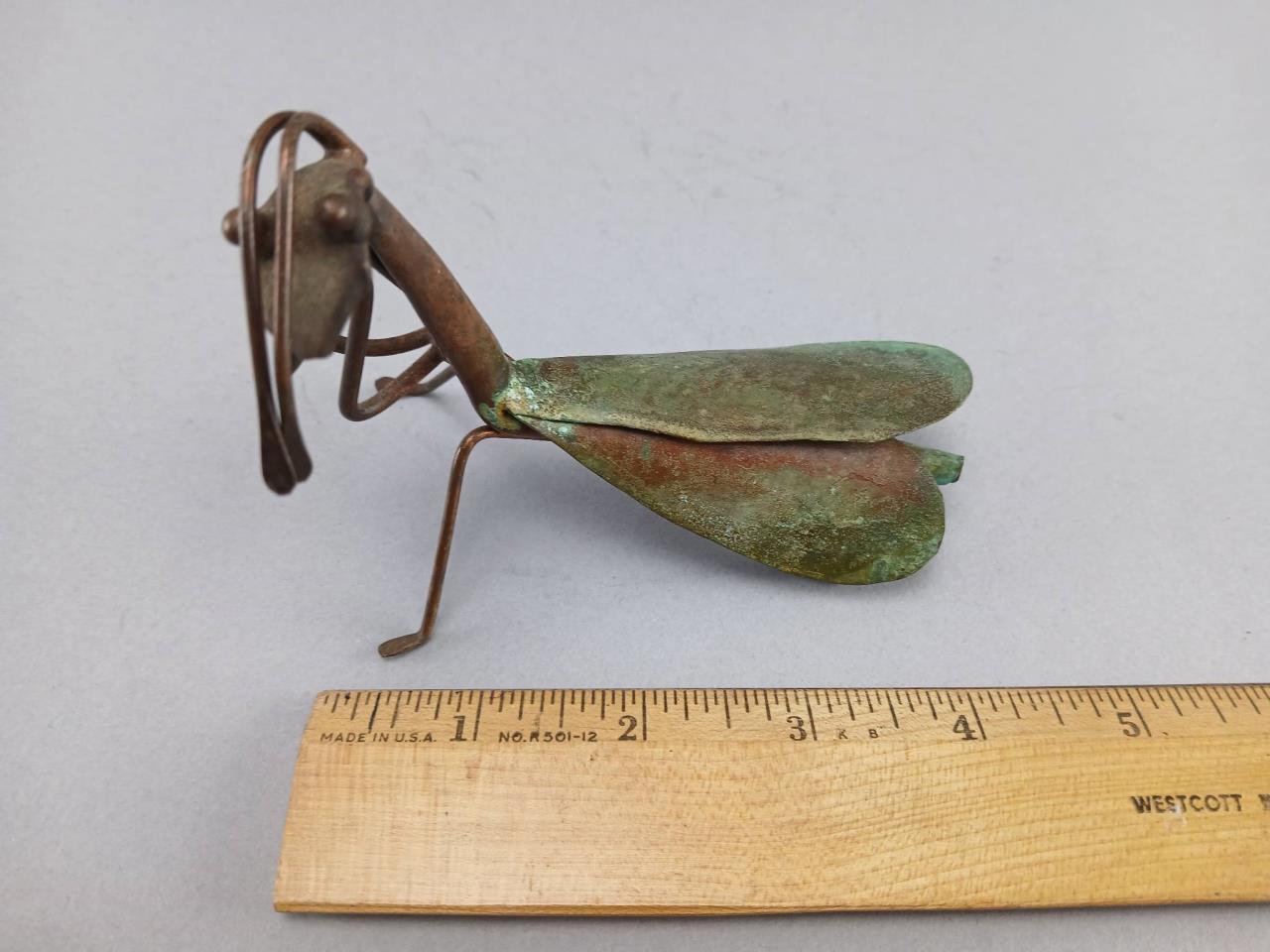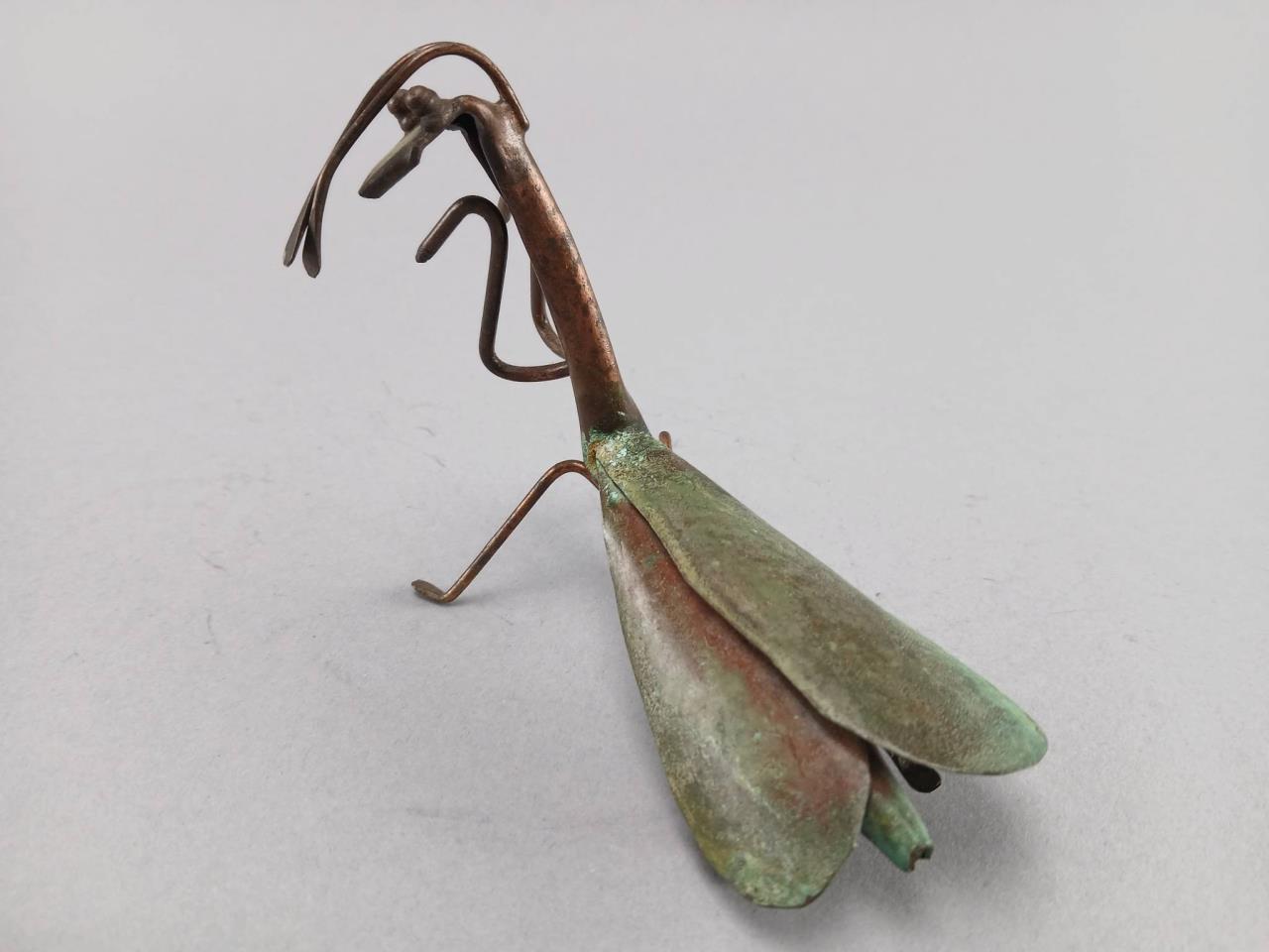 Figurative sculpture of a praying mantis constructed from copper and brass elements. Features wire-formed legs, textured wings, and detailed facial elements.