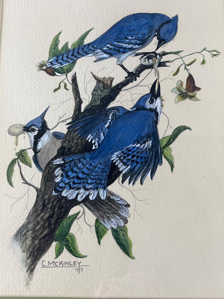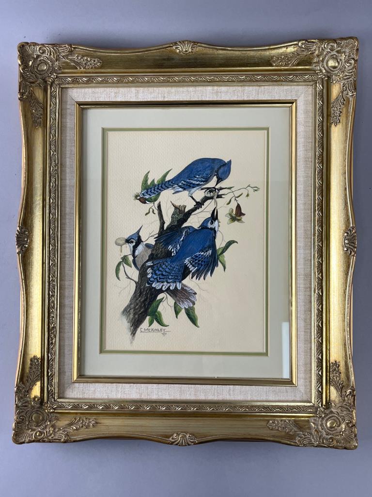 Framed illustration featuring blue jays perched on a branch, signed ‘C. McKinley’ with a ’77’ date. Displayed within a gilt frame with ornate details and a linen mat. Ready for hanging. Frame shows minor wear.