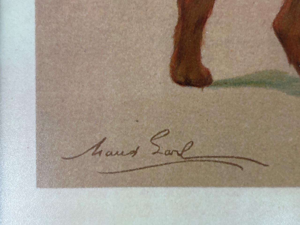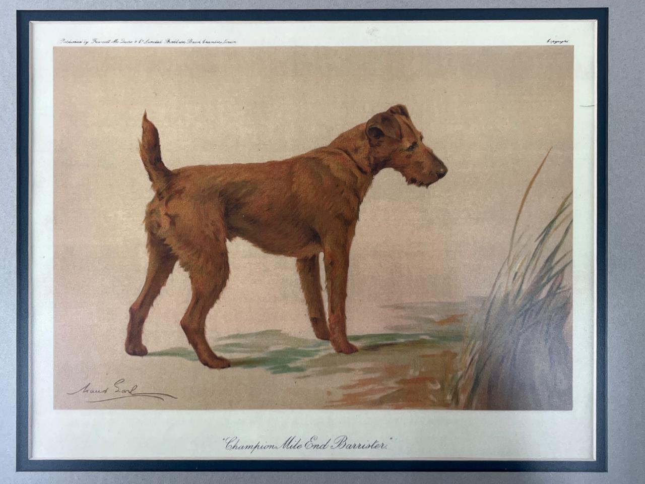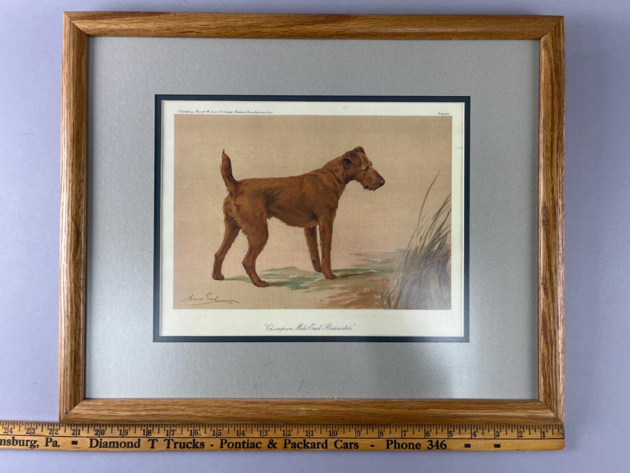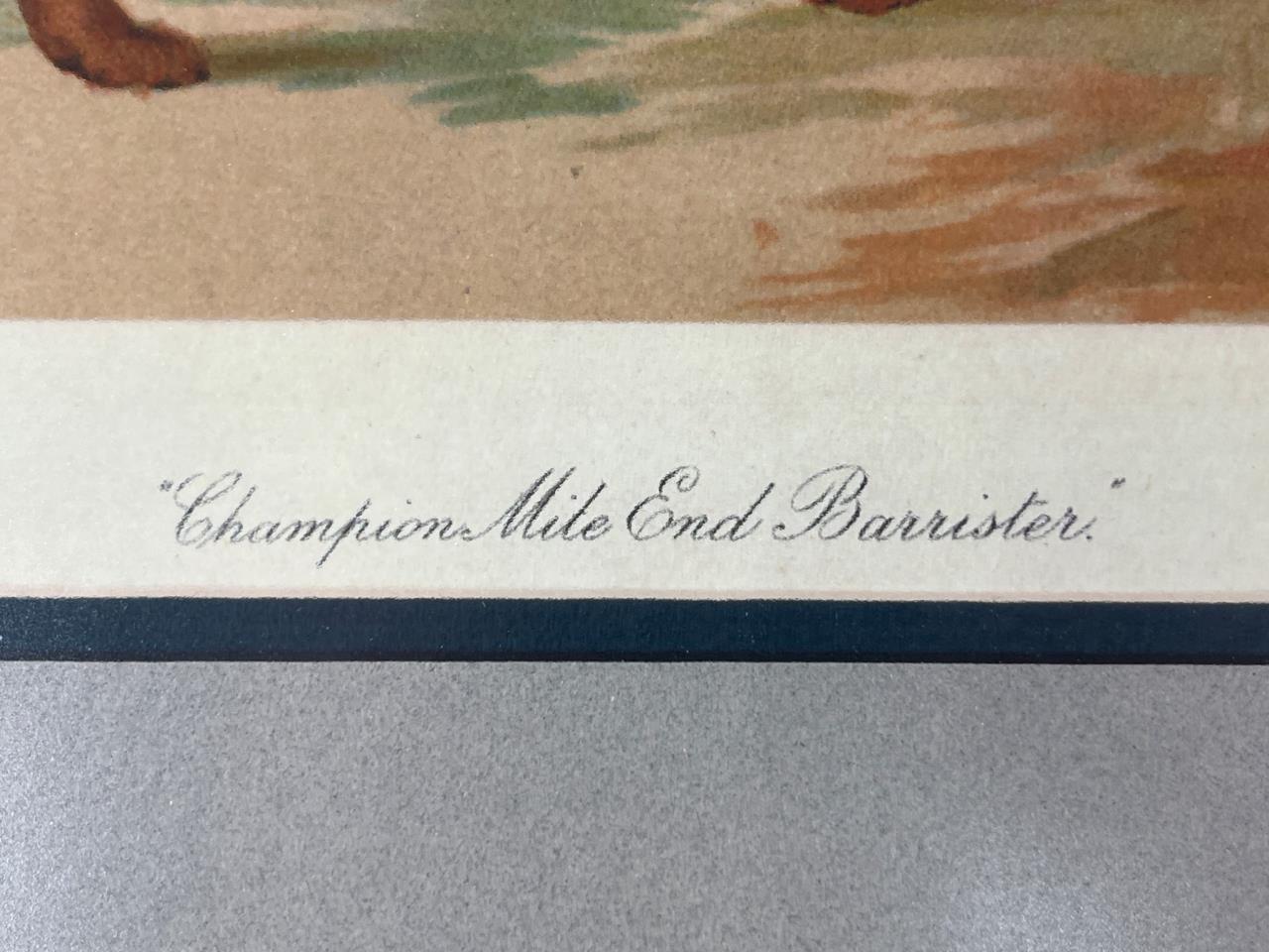 Framed color print featuring the artwork of ‘Champion Mile End Barrister’ by Maud Earl. Set in a wooden frame with a mat border and wire hanger on the back. Includes additional information sheet secured on the reverse.