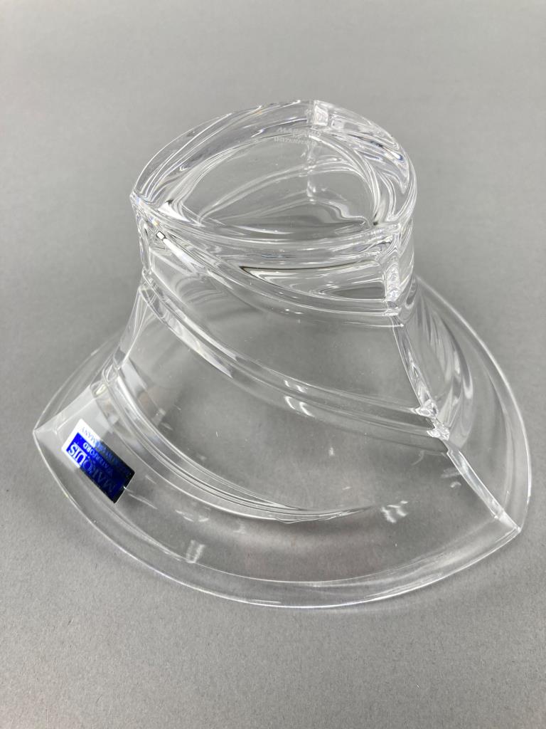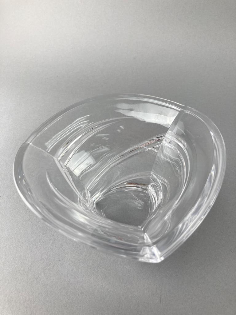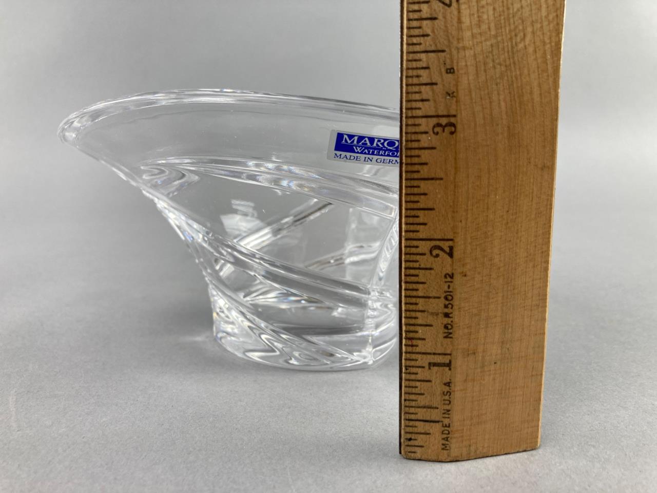 Marquis by Waterford crystal bowl with a modern abstract design and a slanted rim. Features the original sticker reading ‘Made in Germany.’ Suitable for decorative or functional use.