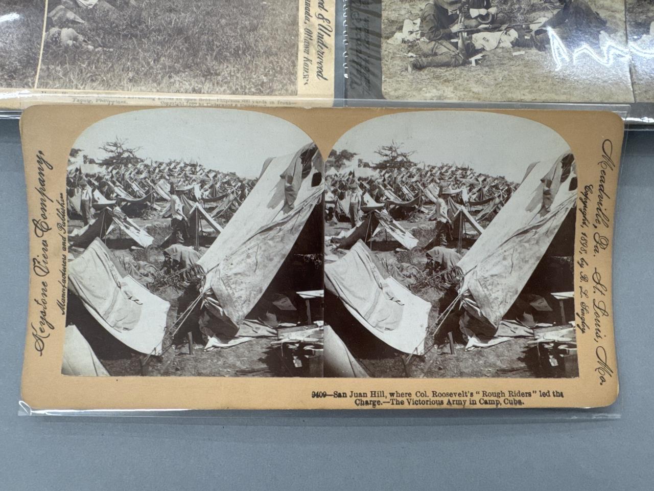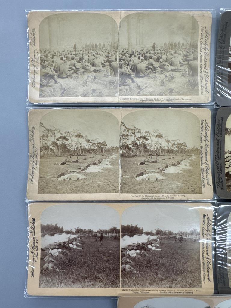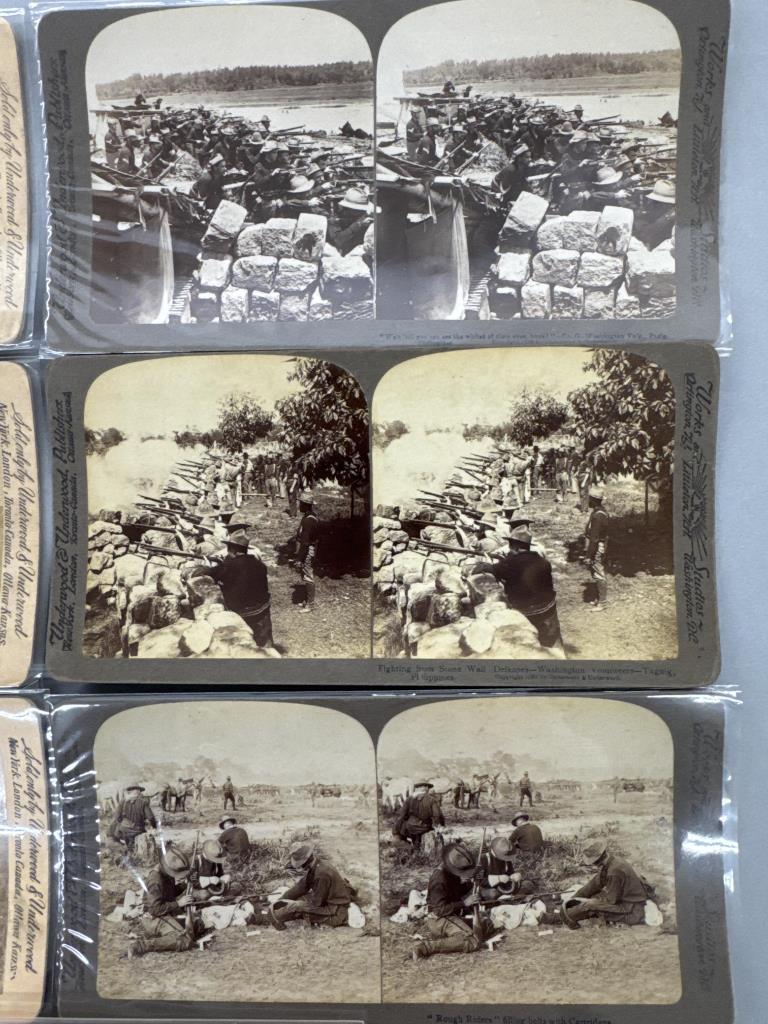 On the U. S. Skirmish Line-Ready for the enemy, Chaplain Brown of the “Rough Riders” preaching to the regiment, “Rough Riders” filling belts with cartridges, San Juan Hill-where Col. Roosevelt’s “Rough Riders” led the charge, fighting from the stone wall defenses-Washington Volunteers, heroic Washington Volunteers advancing across an open field, “Wait ’till you see the whites of their eyes boys!”-Co. G. Washington Volunteers